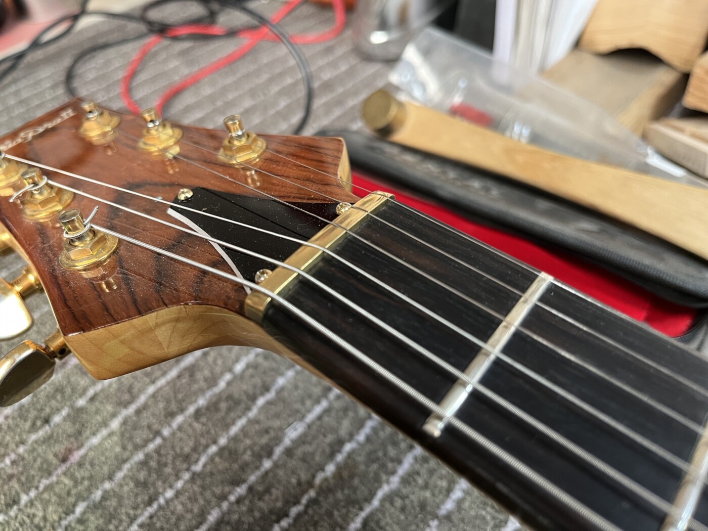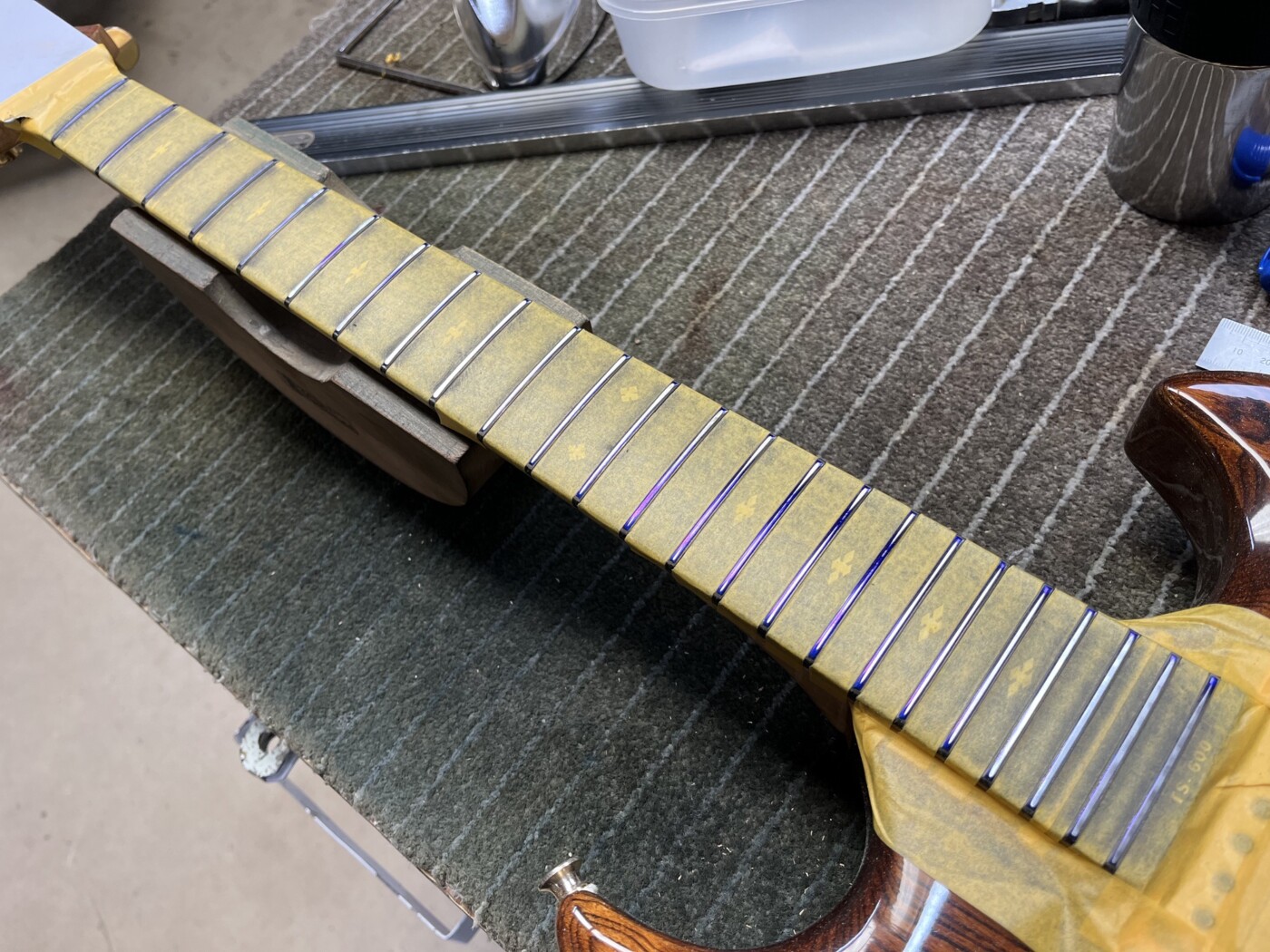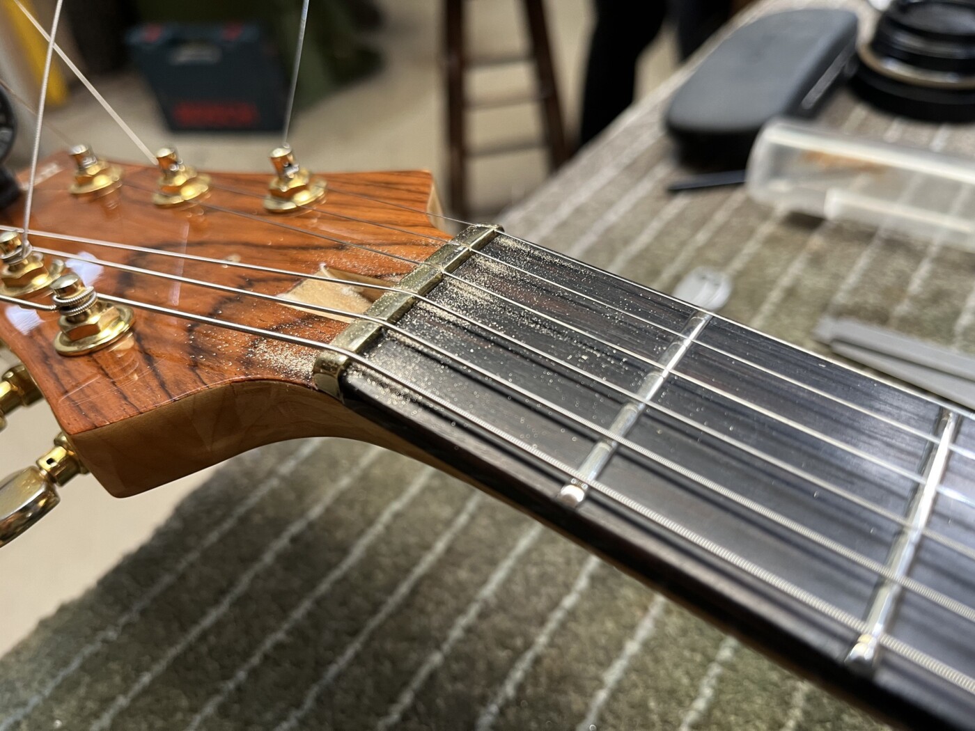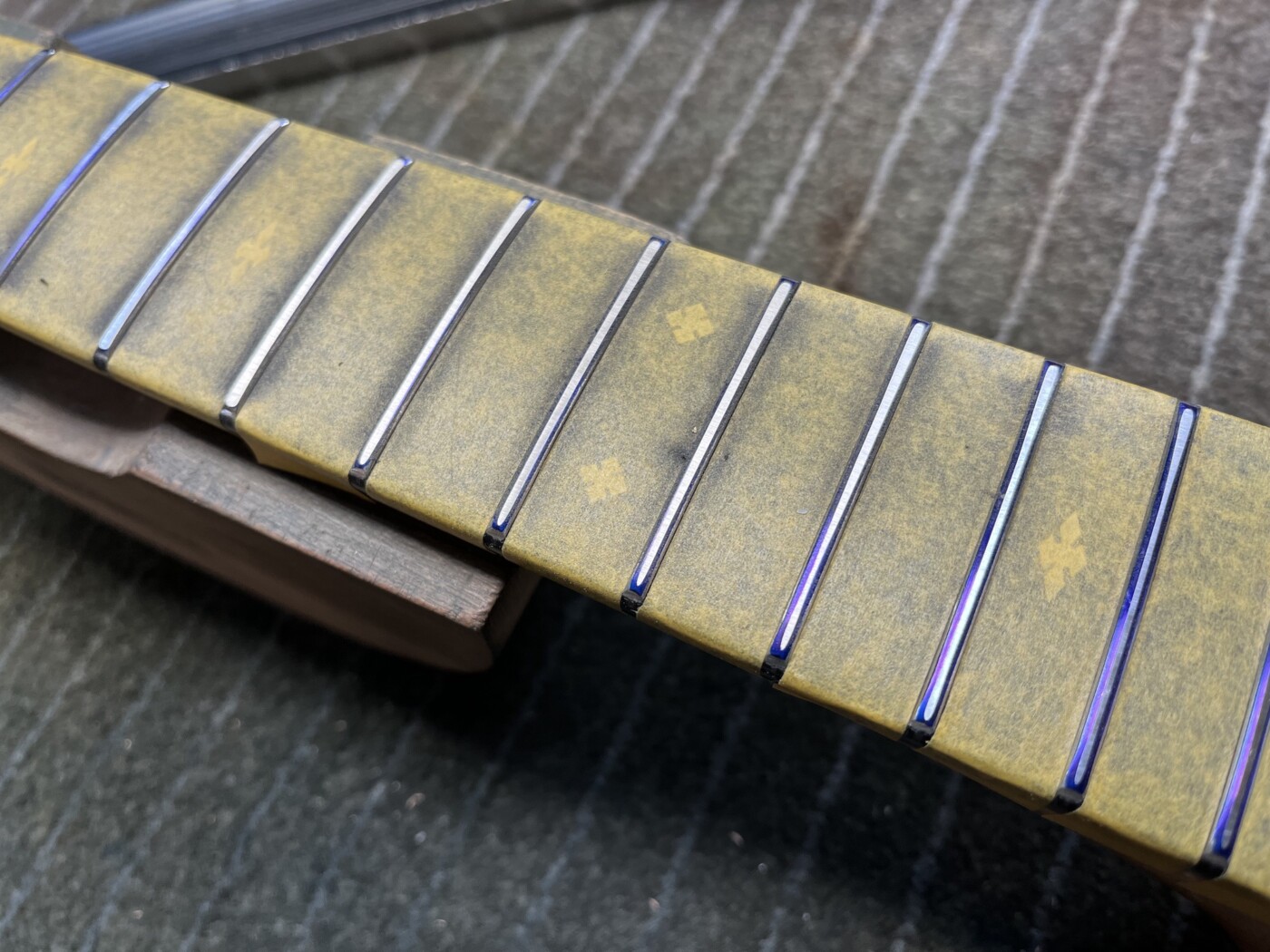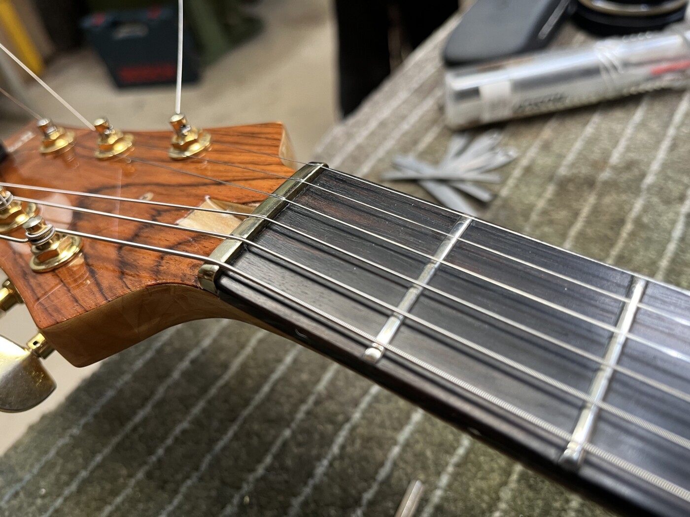 This pristine example of this model had an annoying rattle. The setup seemed fine, although the nut was high (as was the action in an attempt to battle the buzz) so my only option really was to look at the frets. Once I started levelling them I found they were rally uneven.