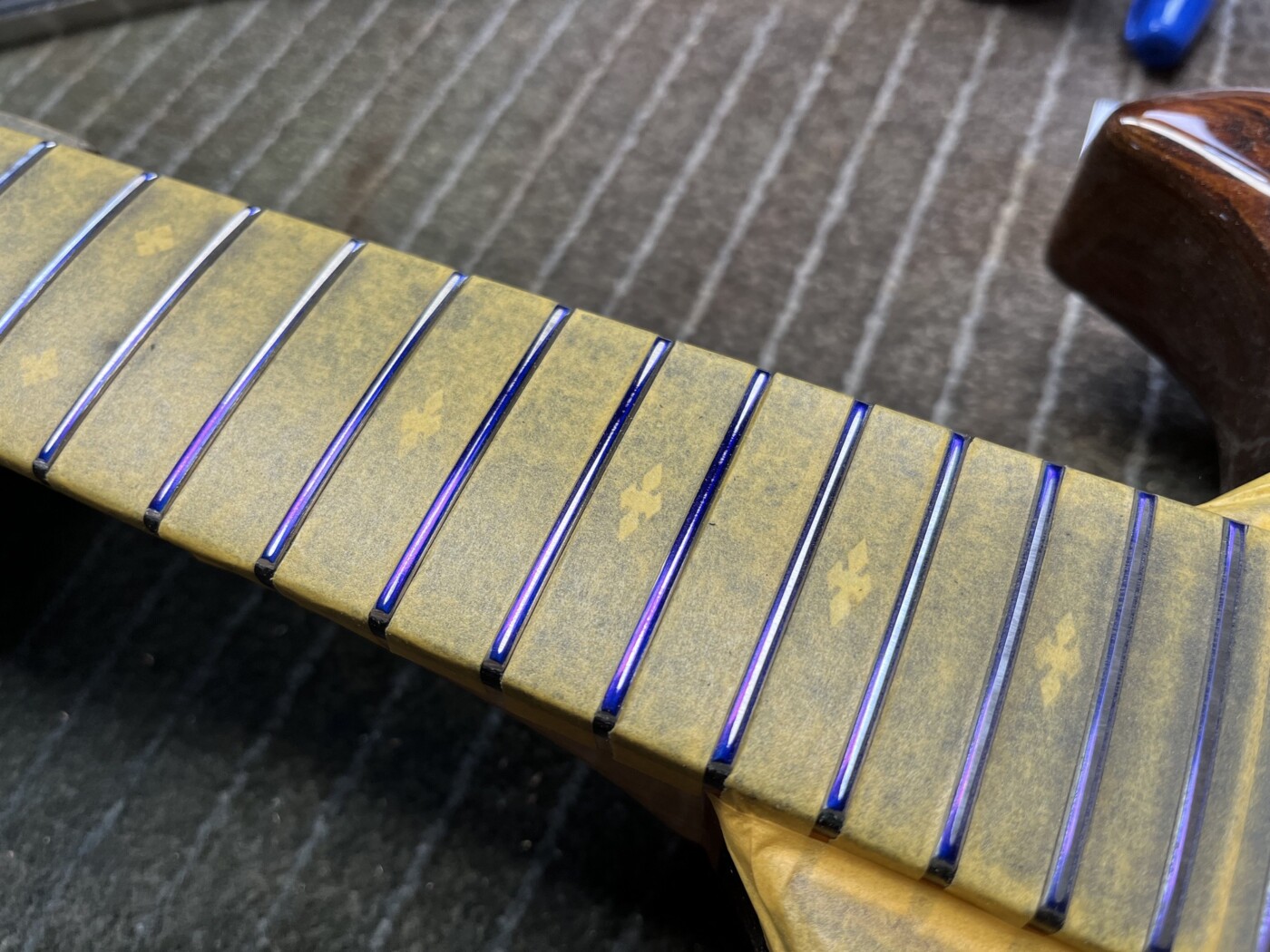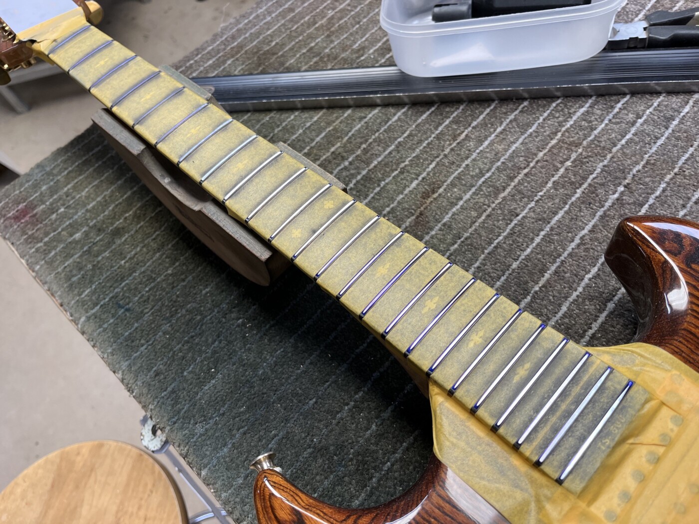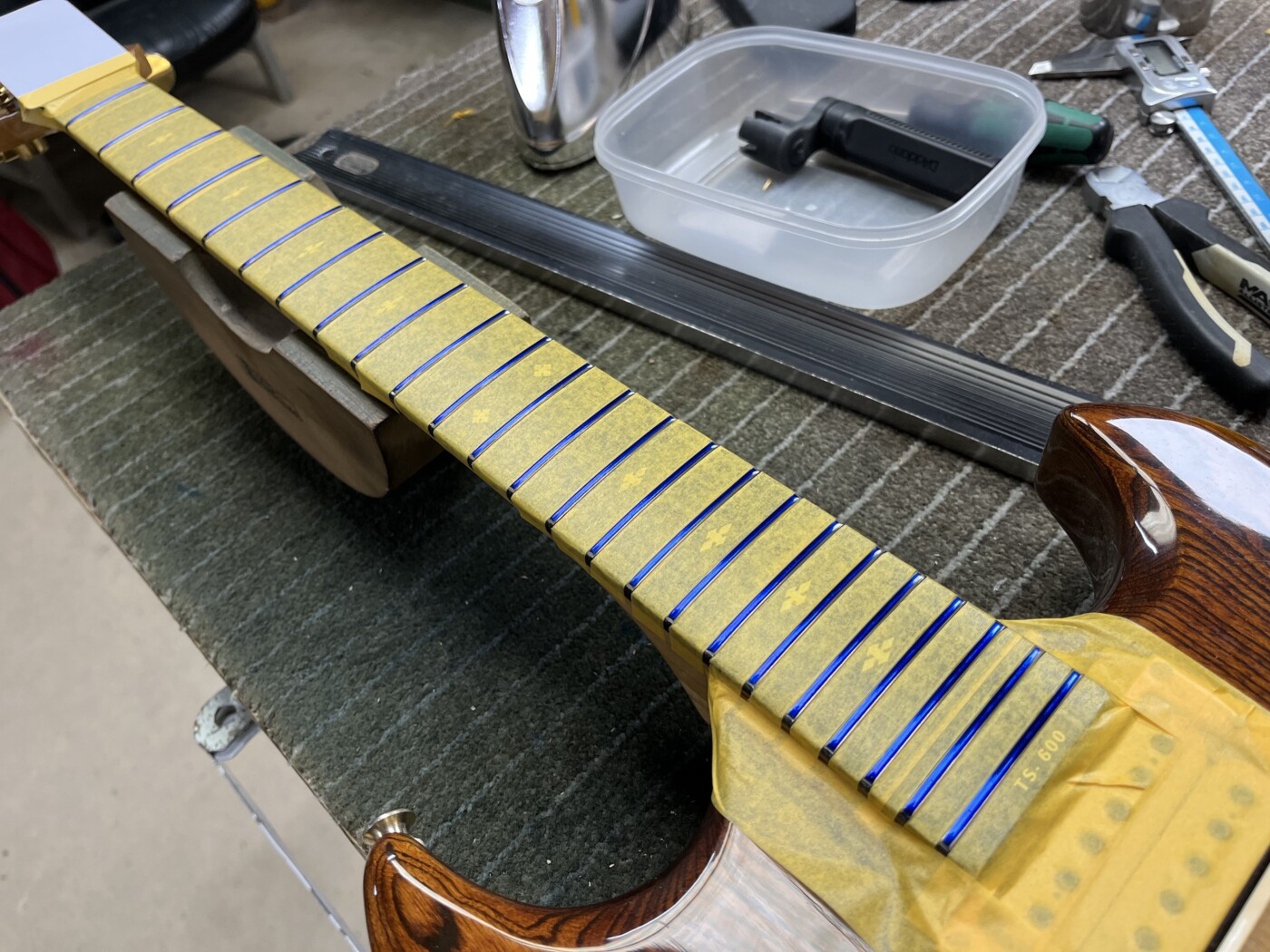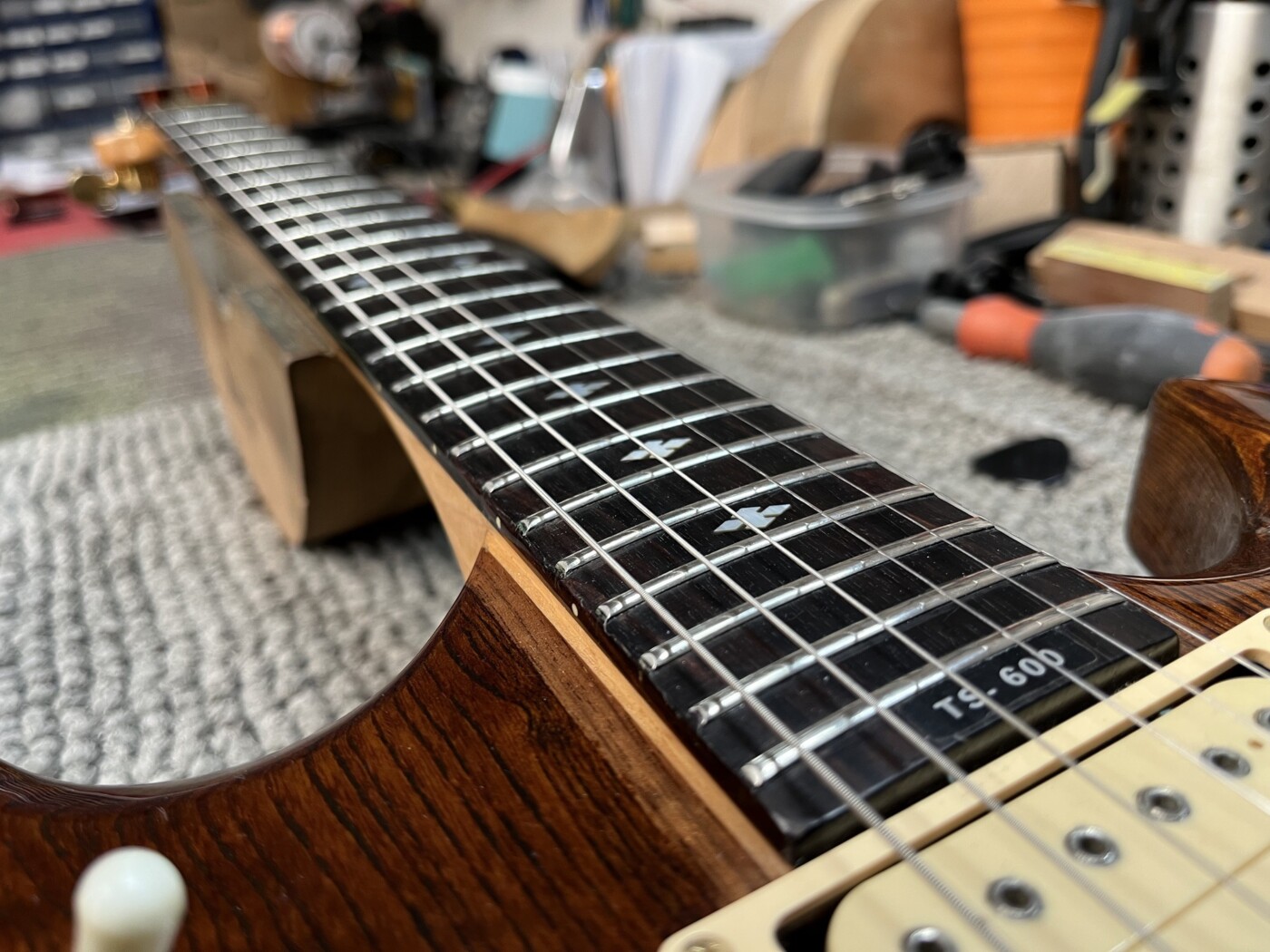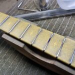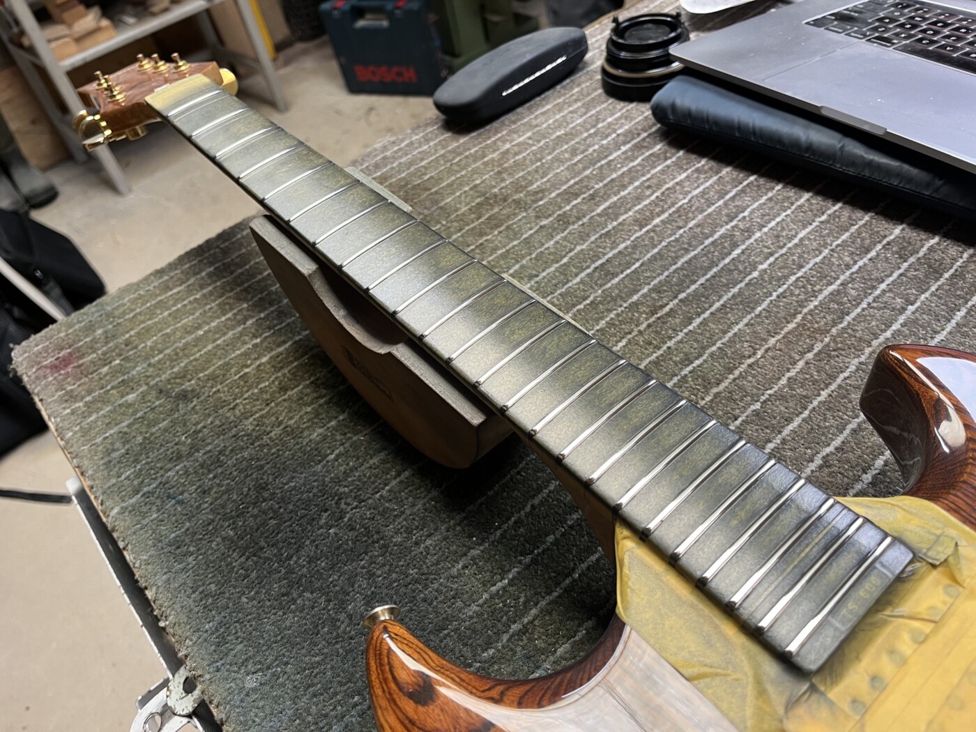 This pristine example of this model had an annoying rattle. The setup seemed fine, although the nut was high (as was the action in an attempt to battle the buzz) so my only option really was to look at the frets. Once I started levelling them I found they were rally uneven.