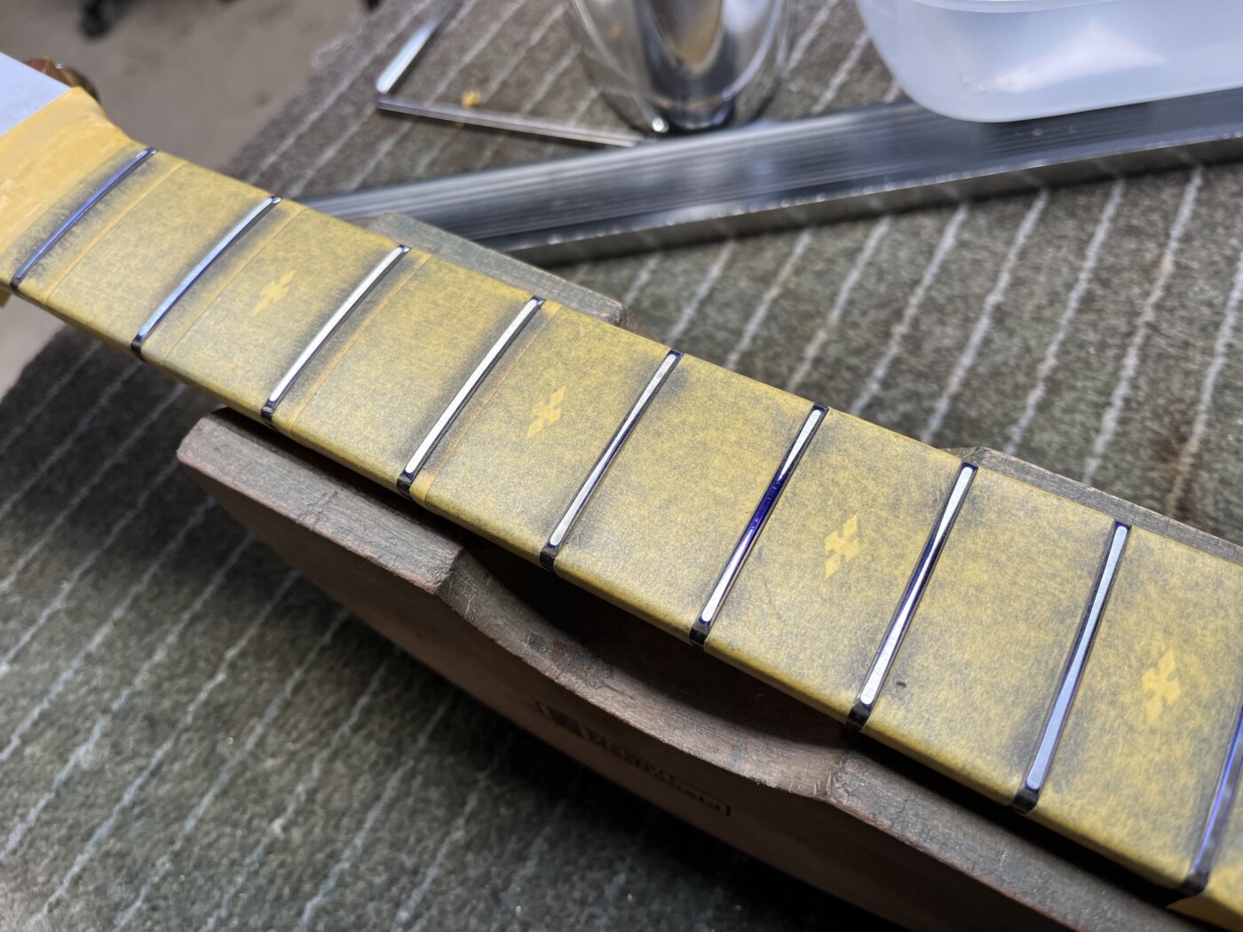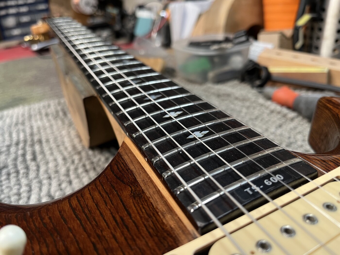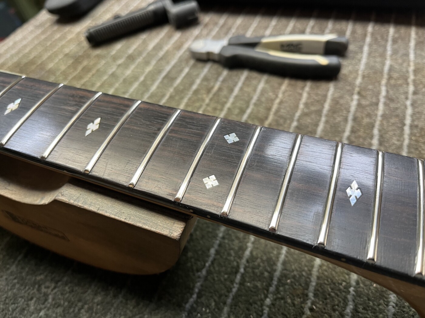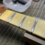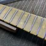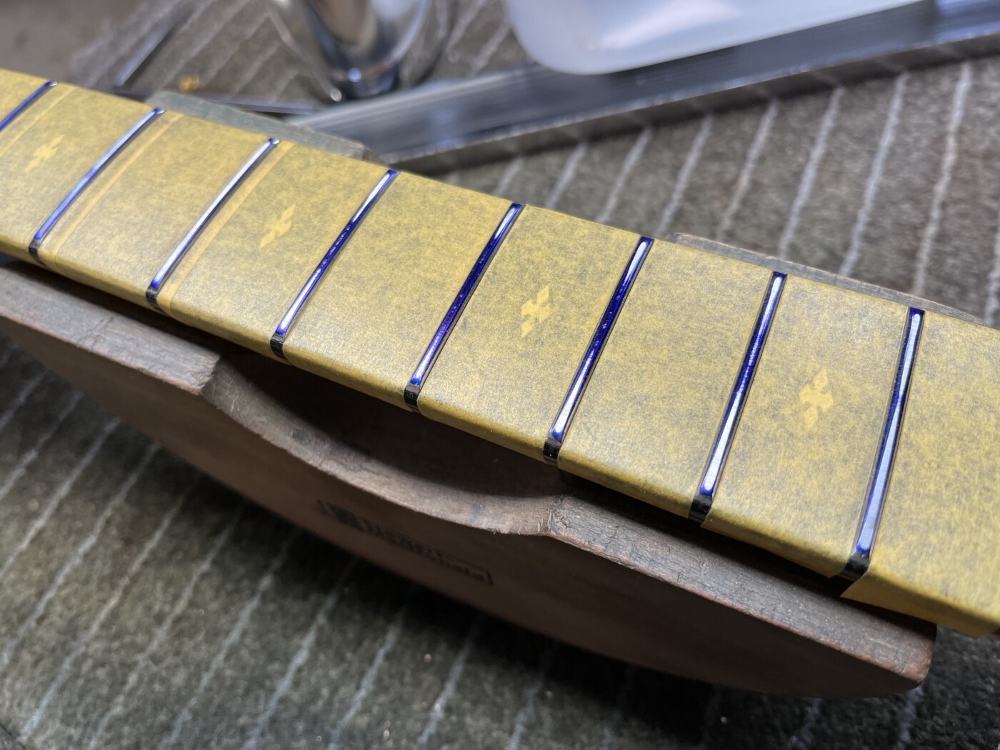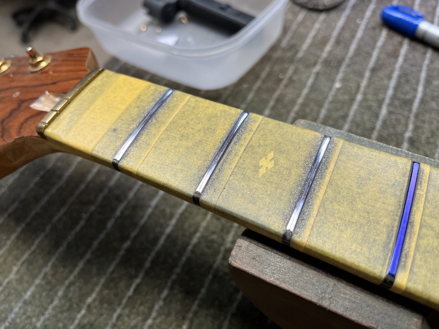 This pristine example of this model had an annoying rattle. The setup seemed fine, although the nut was high (as was the action in an attempt to battle the buzz) so my only option really was to look at the frets. Once I started levelling them I found they were rally uneven.