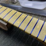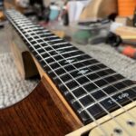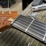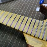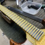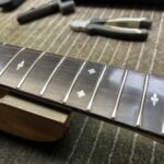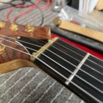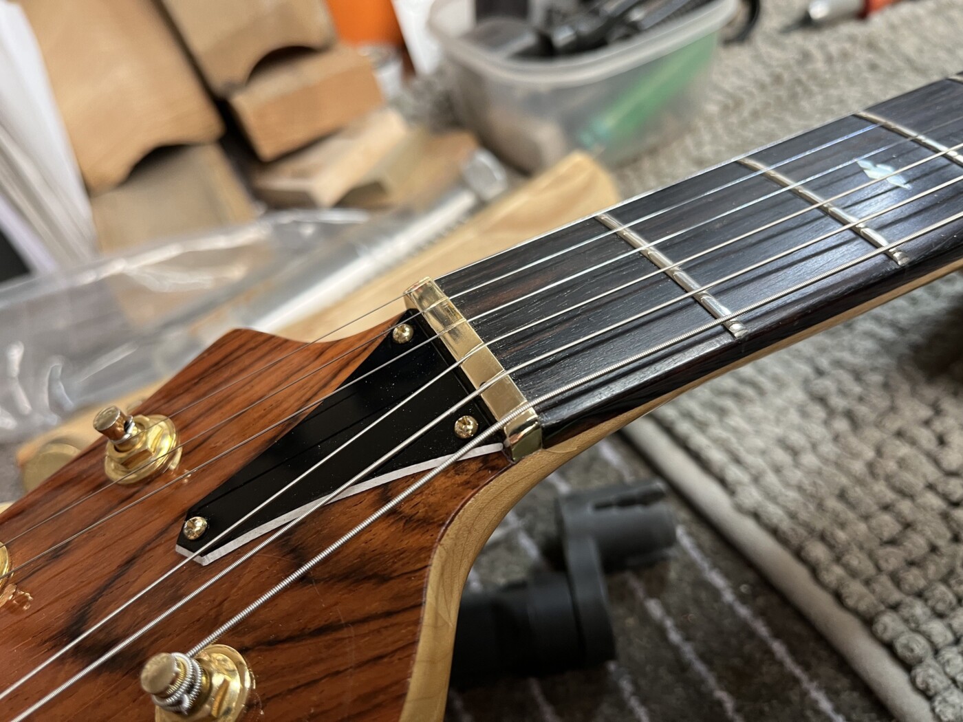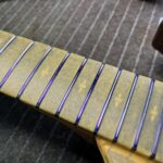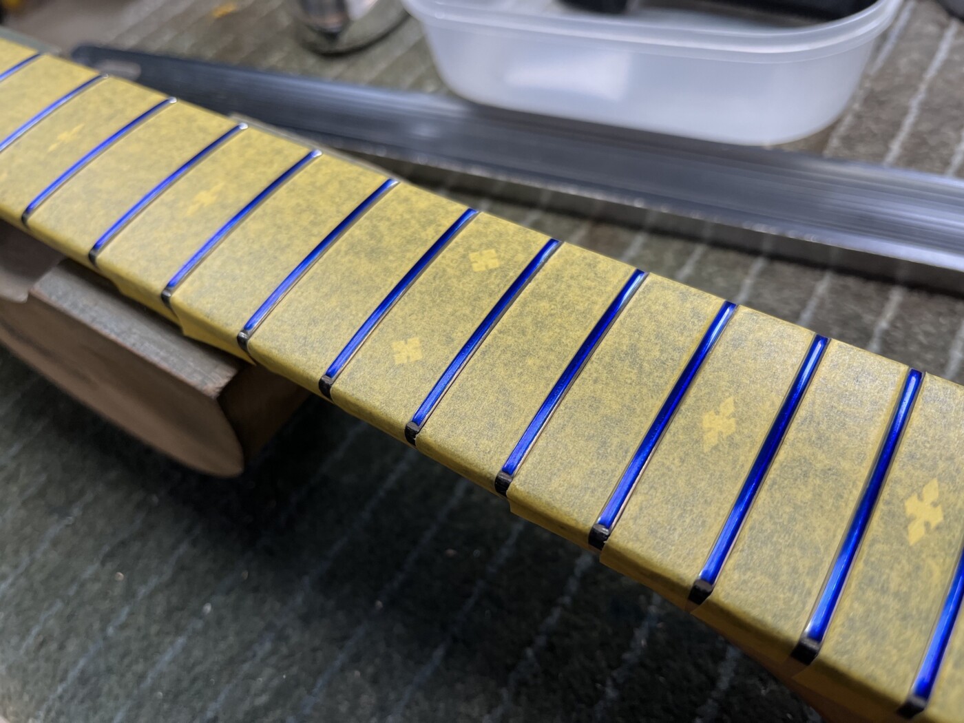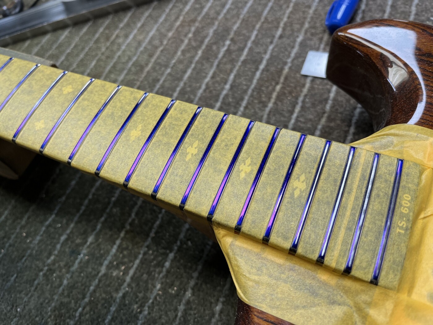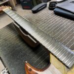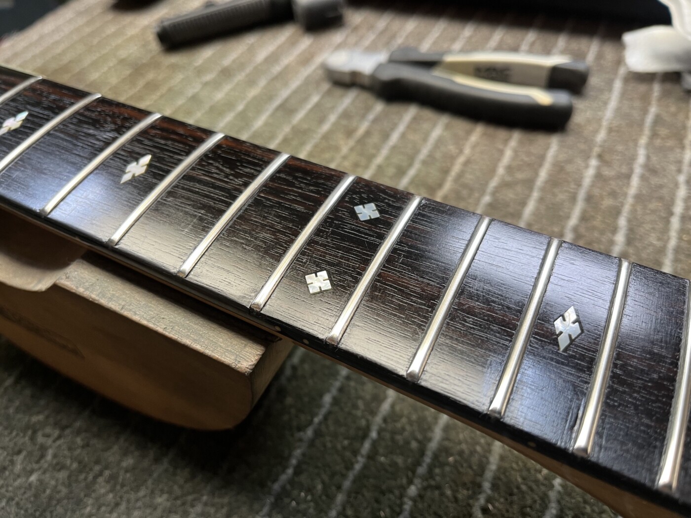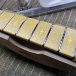 This pristine example of this model had an annoying rattle. The setup seemed fine, although the nut was high (as was the action in an attempt to battle the buzz) so my only option really was to look at the frets. Once I started levelling them I found they were rally uneven.