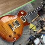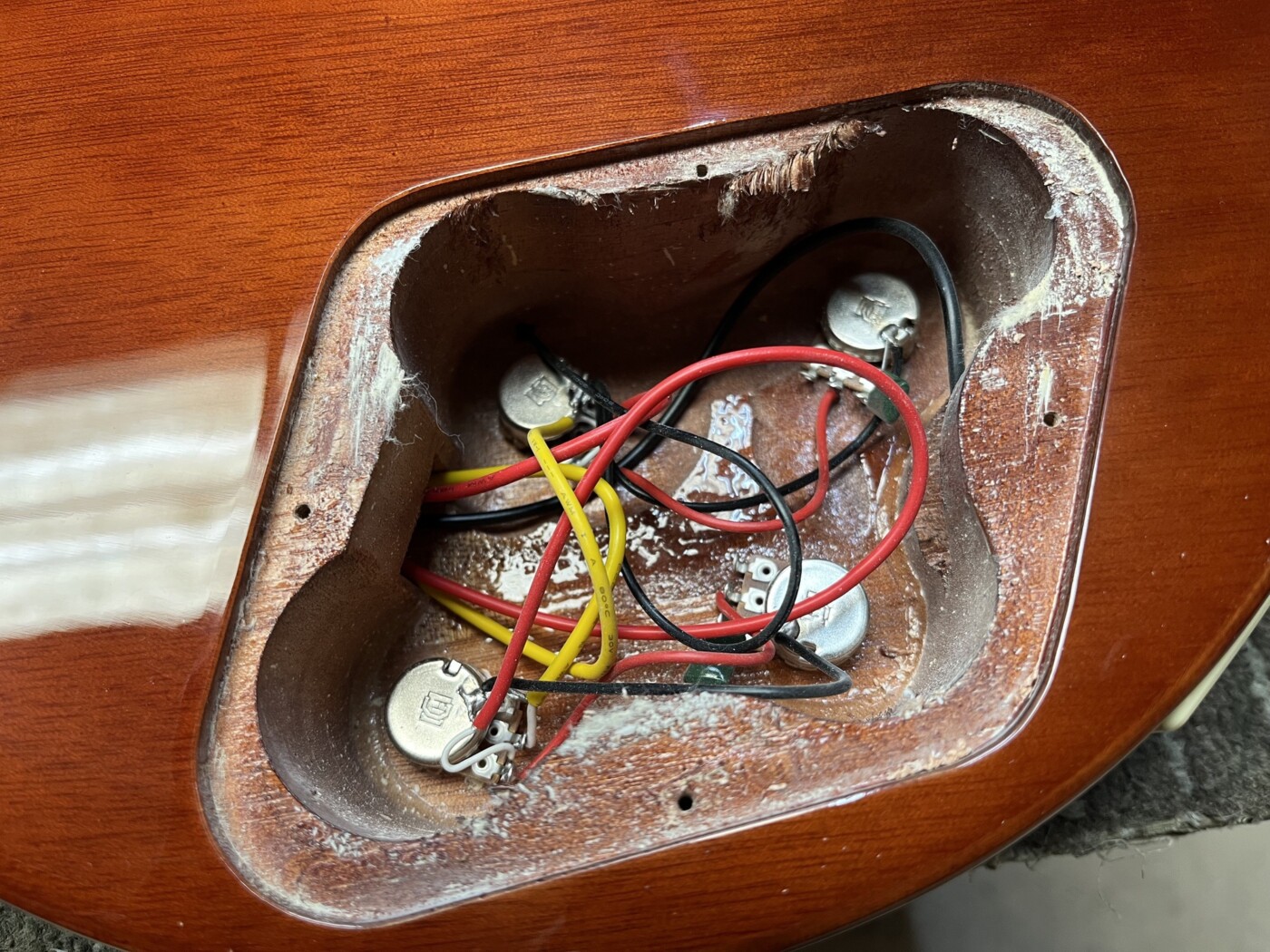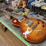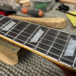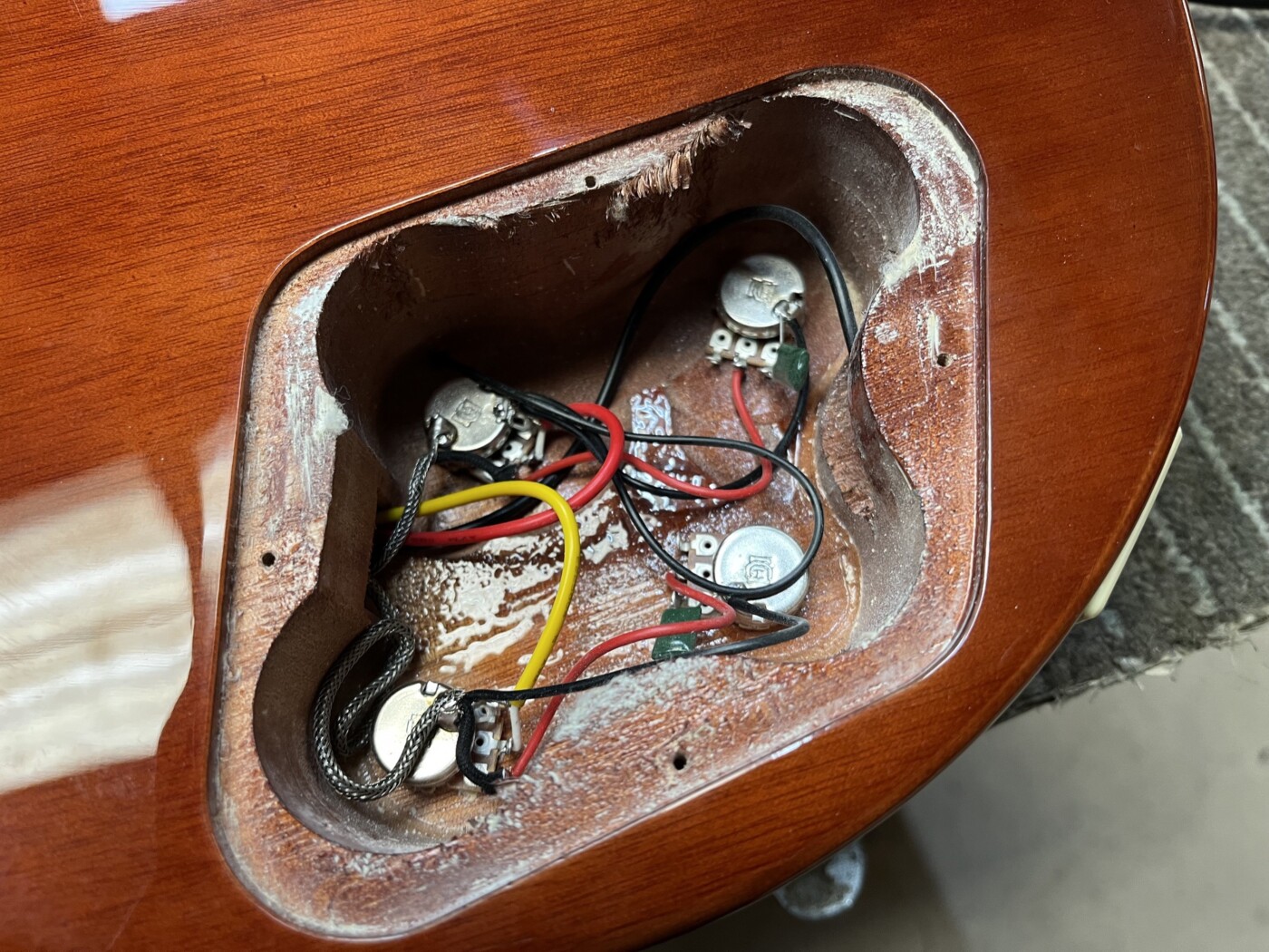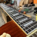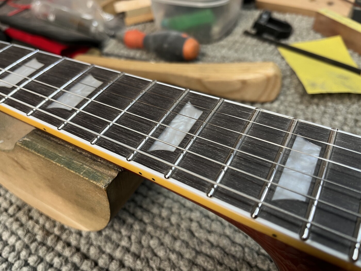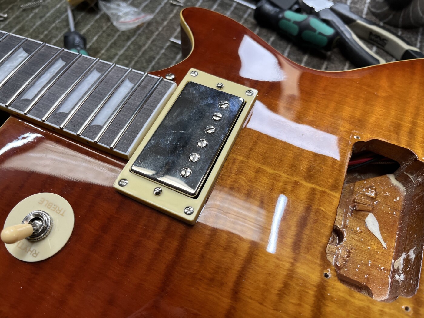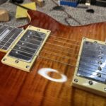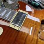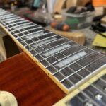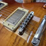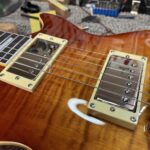 Here’s an example of a “Chibson” knock off. I made a custom “PAF” style pickup for it and along with that installed a Gibson “Greeny” neck pickup with the usual modifications. The fingerboard has a 16″ radius which feels a bit weird but doesn’t play too bad, even without a fret level!