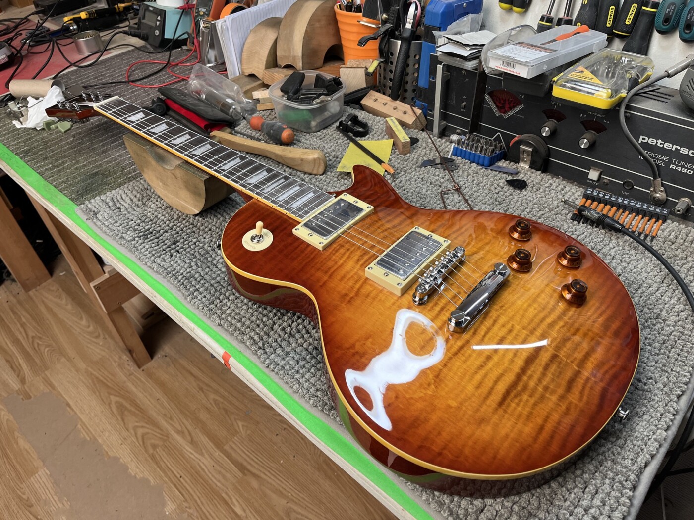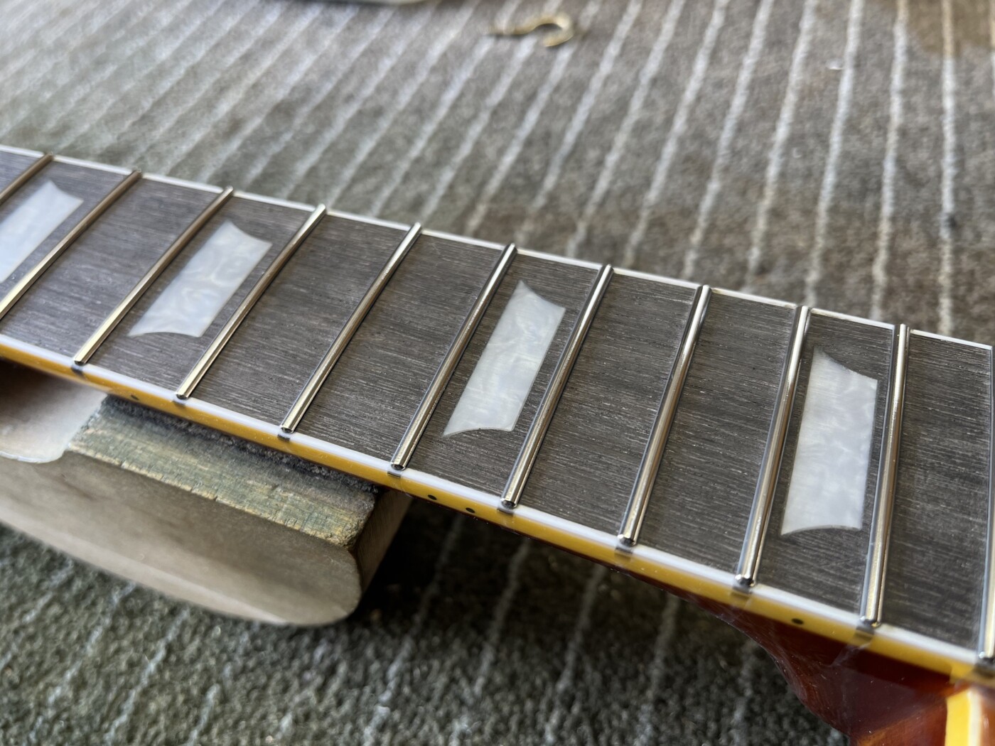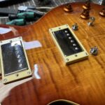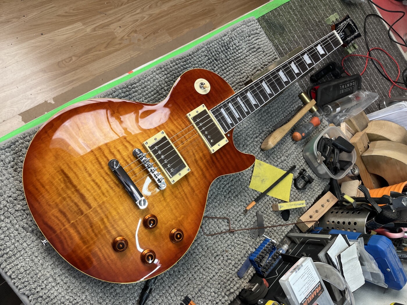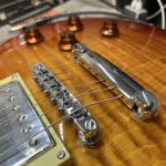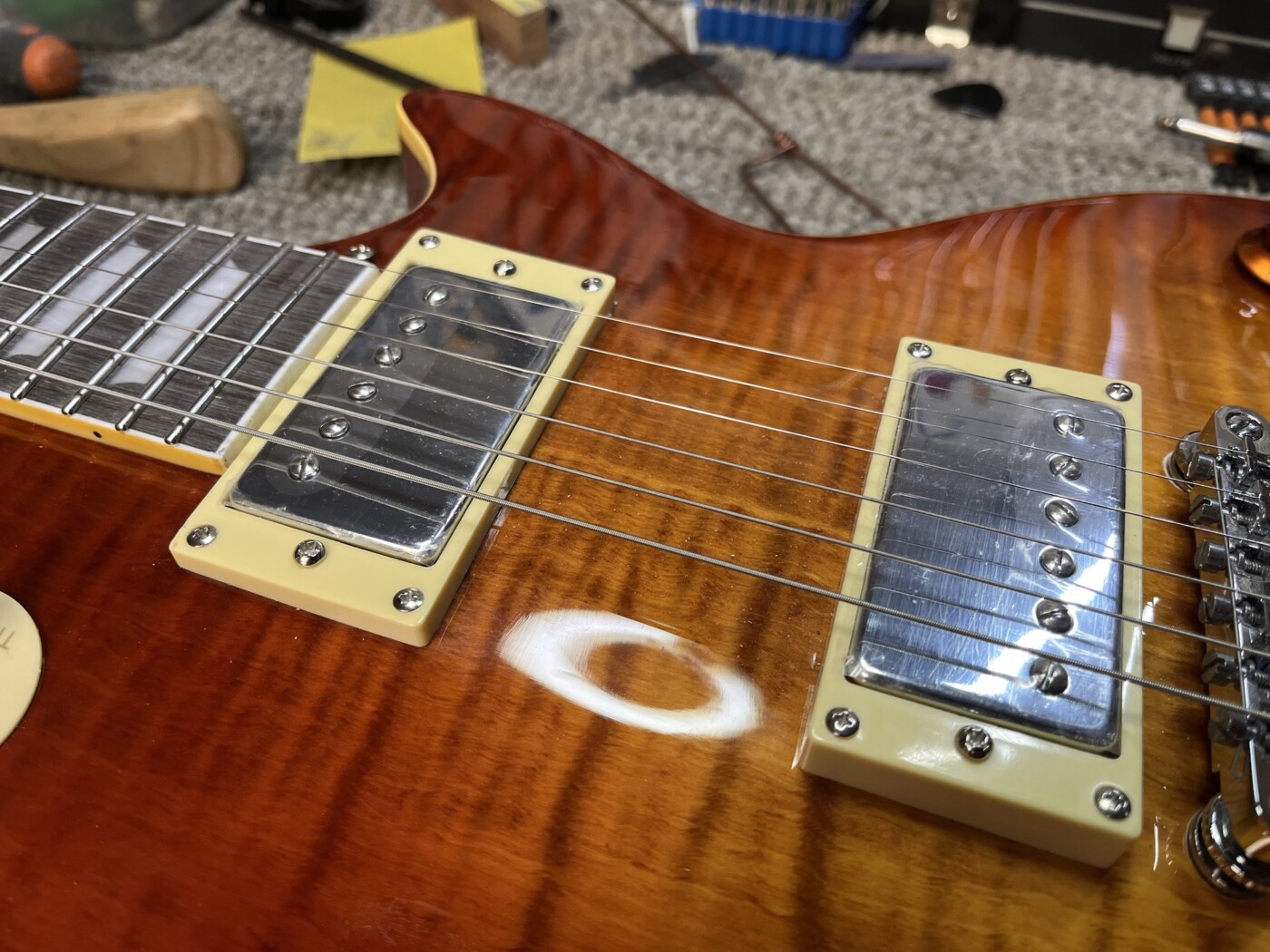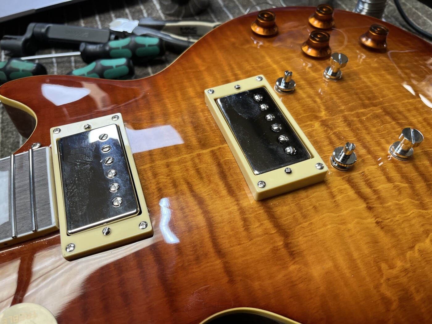 Here’s an example of a “Chibson” knock off. I made a custom “PAF” style pickup for it and along with that installed a Gibson “Greeny” neck pickup with the usual modifications. The fingerboard has a 16″ radius which feels a bit weird but doesn’t play too bad, even without a fret level!