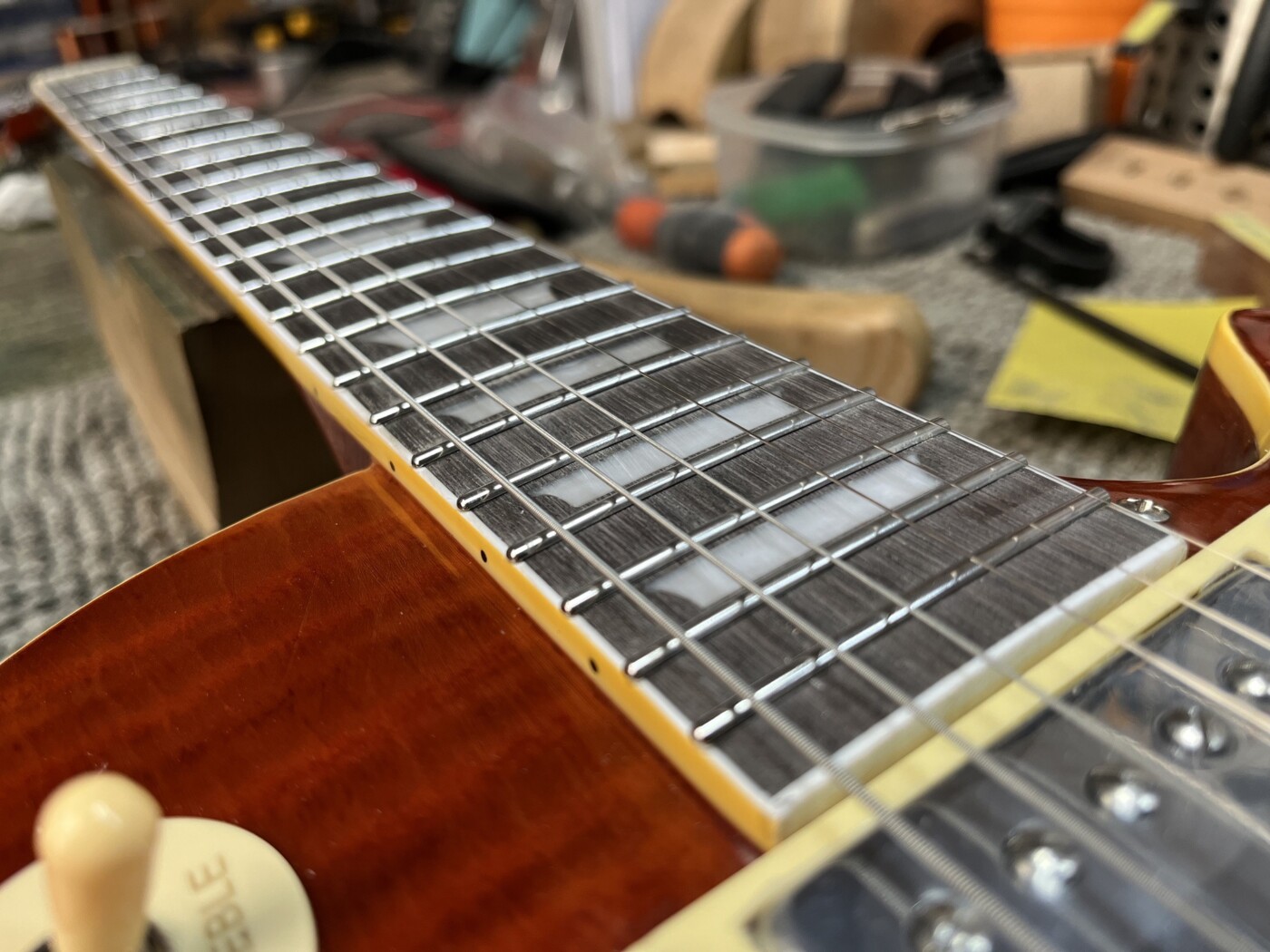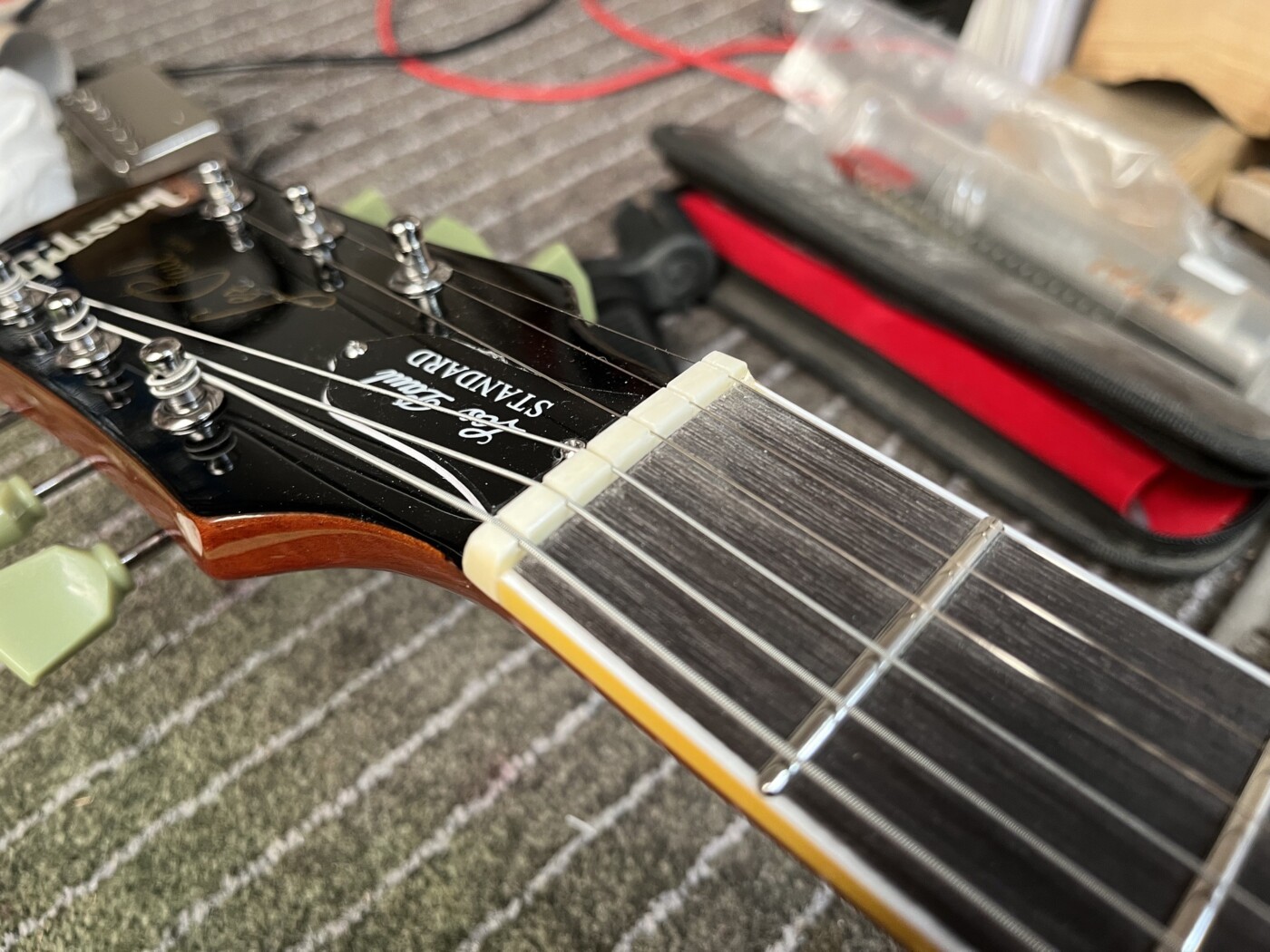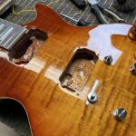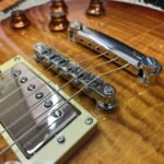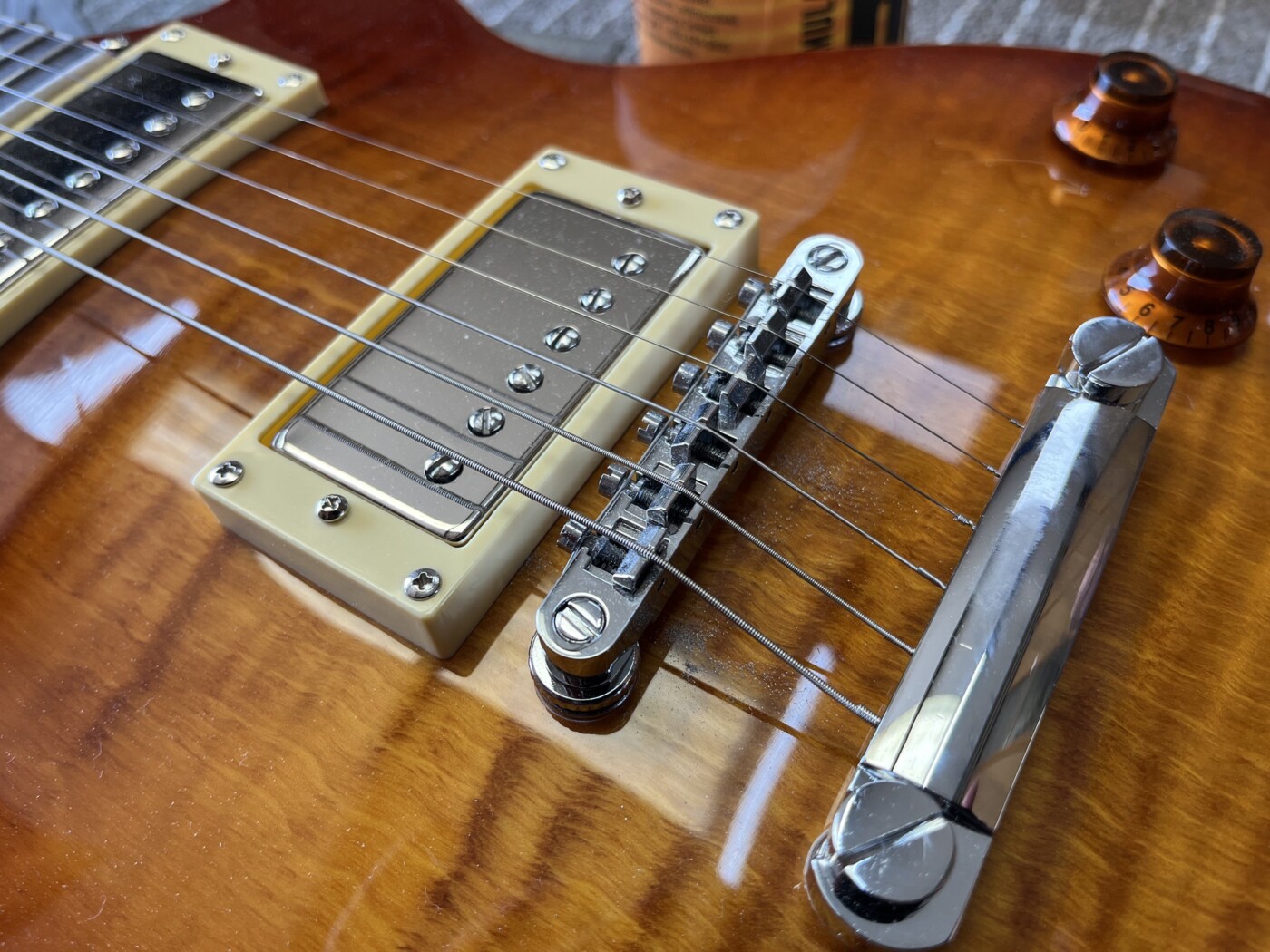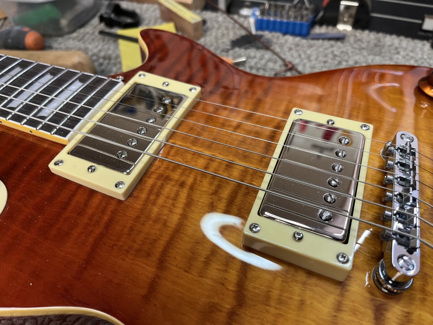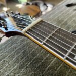 Here’s an example of a “Chibson” knock off. I made a custom “PAF” style pickup for it and along with that installed a Gibson “Greeny” neck pickup with the usual modifications. The fingerboard has a 16″ radius which feels a bit weird but doesn’t play too bad, even without a fret level!