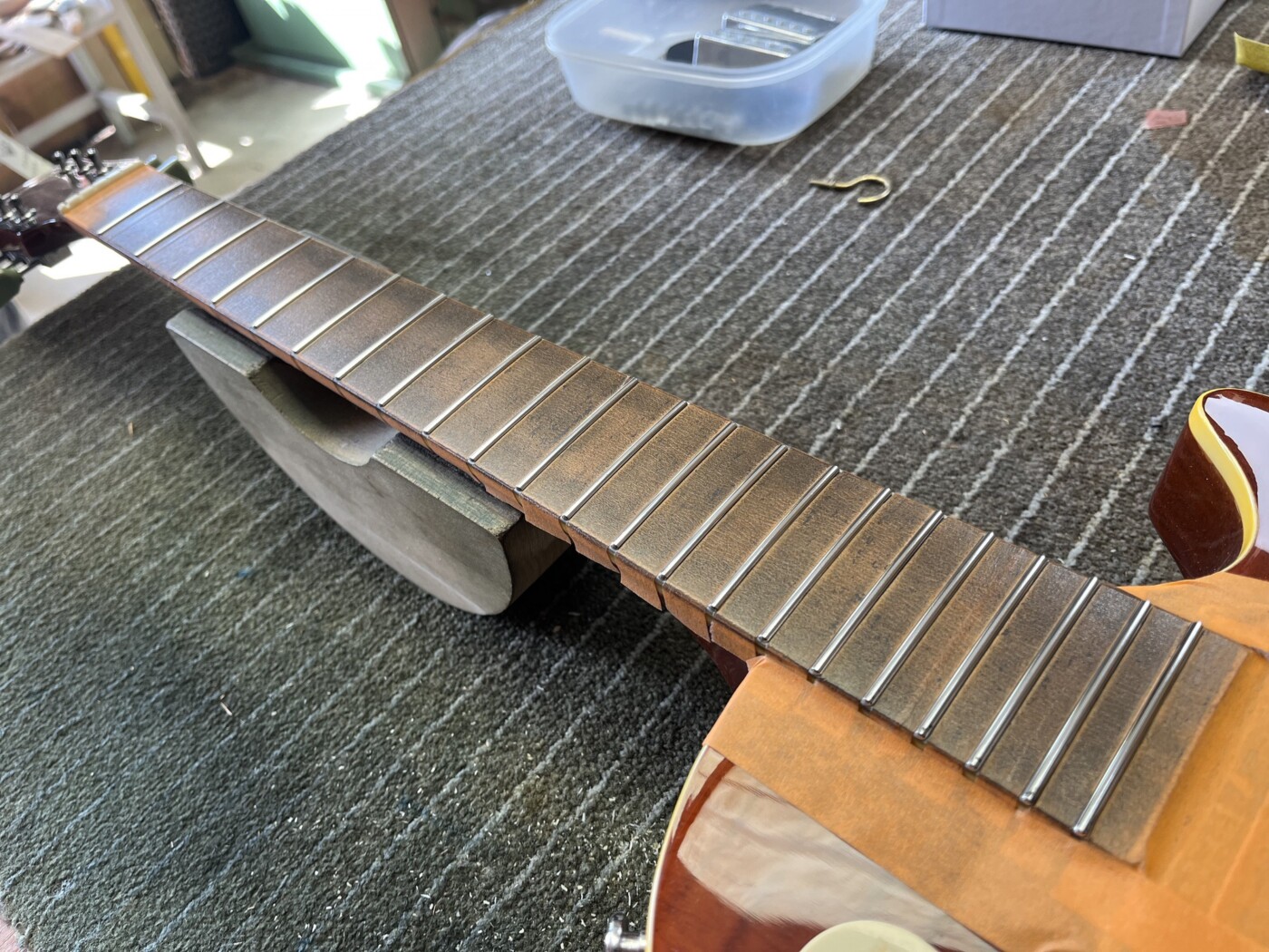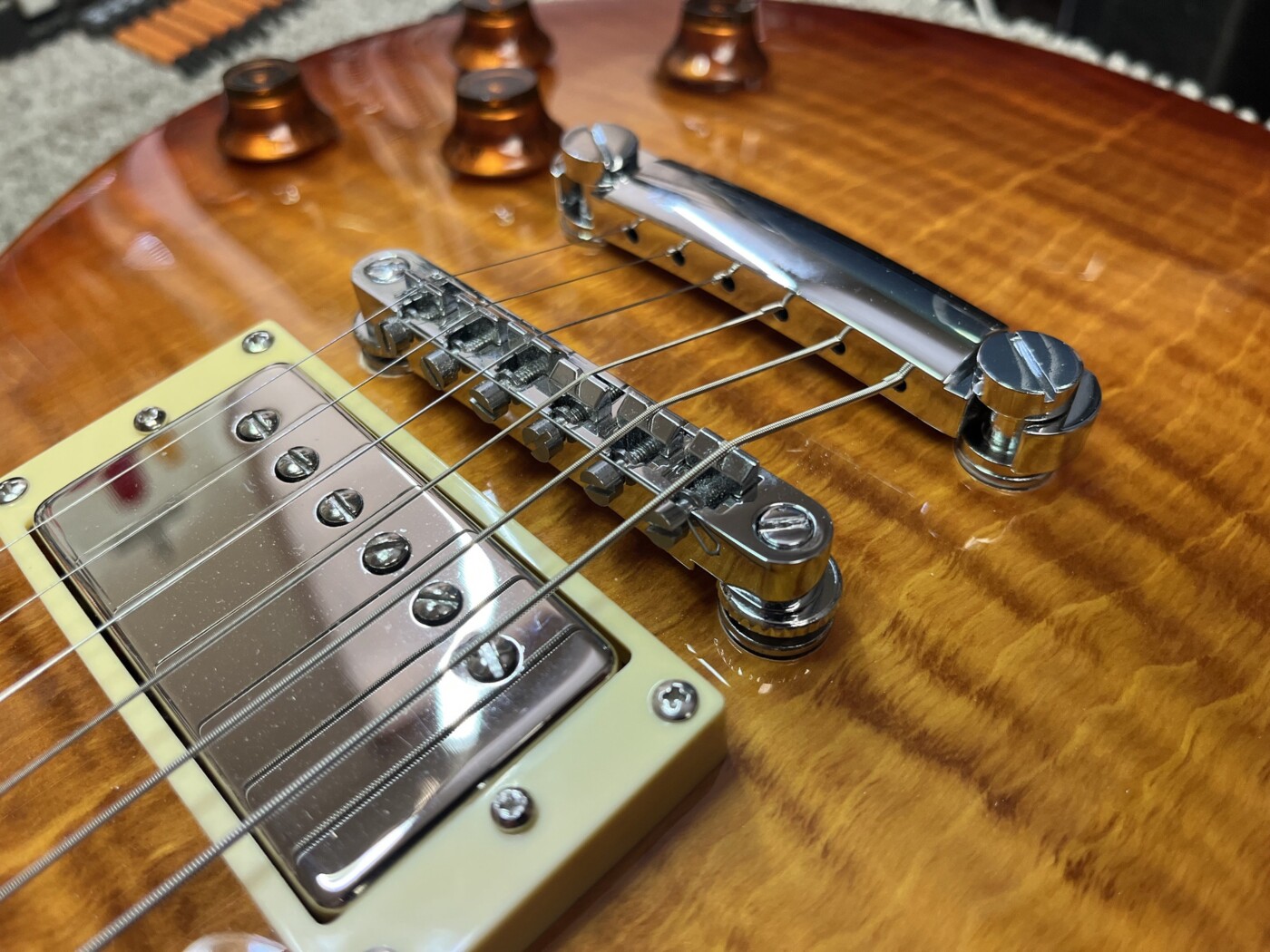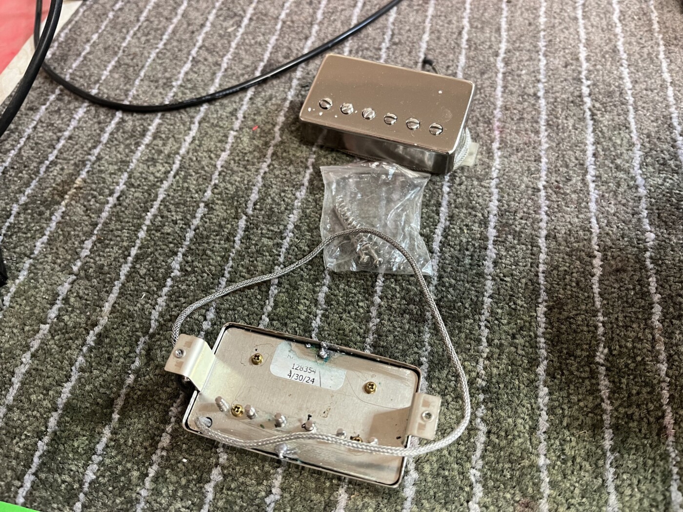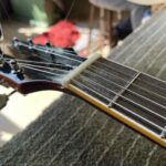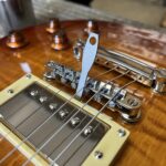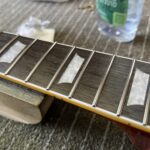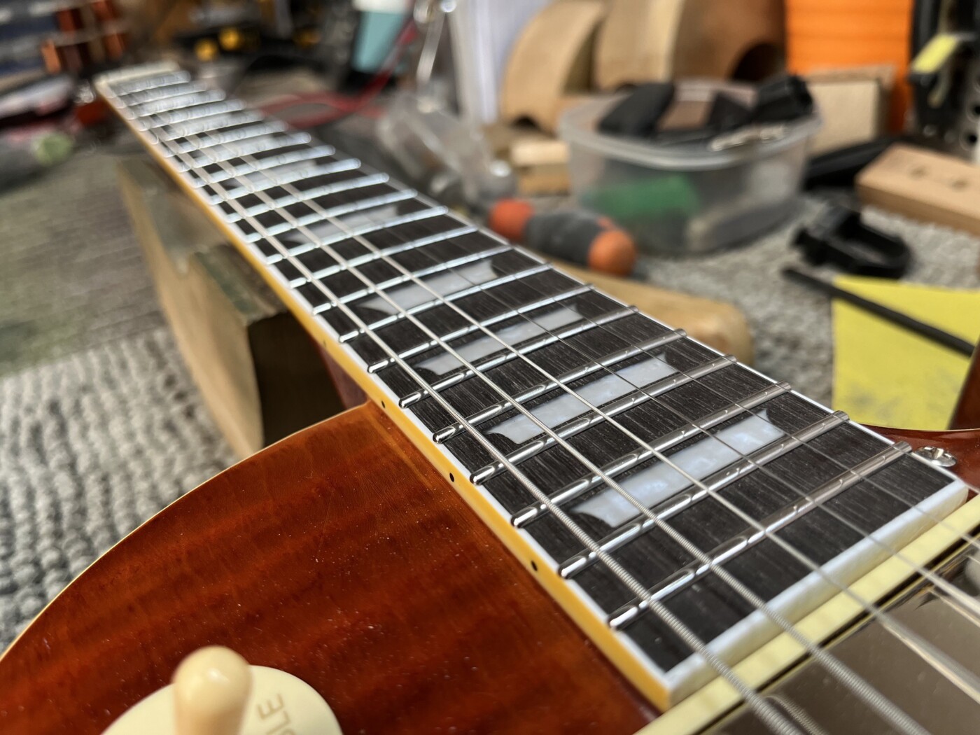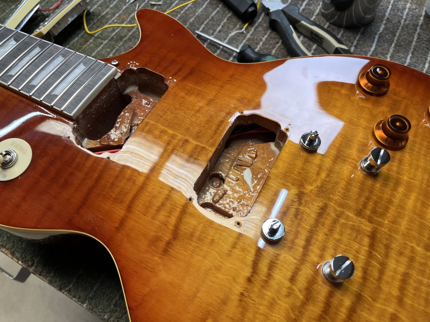Here’s an example of a “Chibson” knock off. I made a custom “PAF” style pickup for it and along with that installed a Gibson “Greeny” neck pickup with the usual modifications. The fingerboard has a 16″ radius which feels a bit weird but doesn’t play too bad, even without a fret level!
