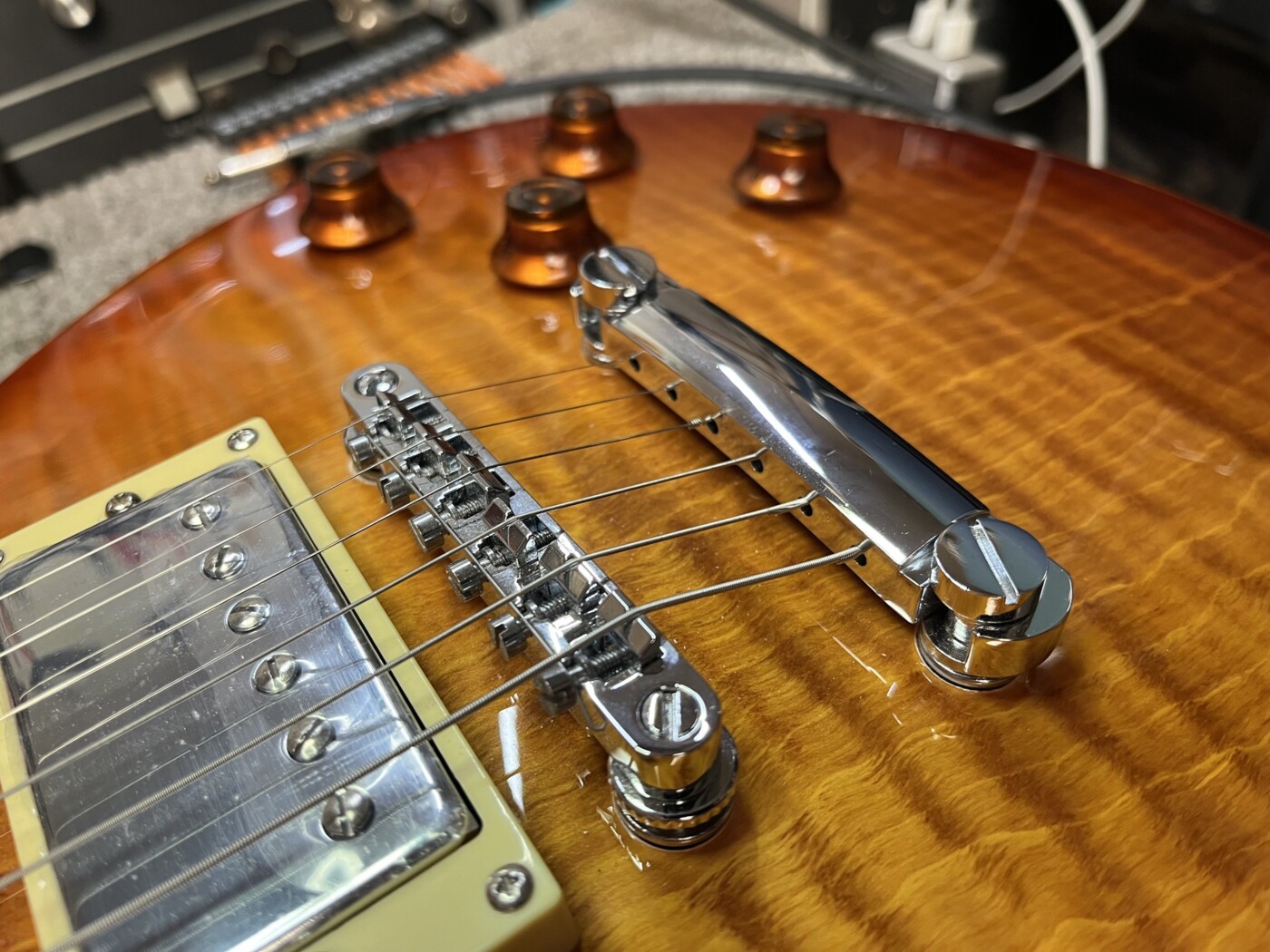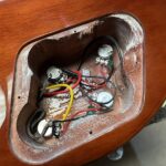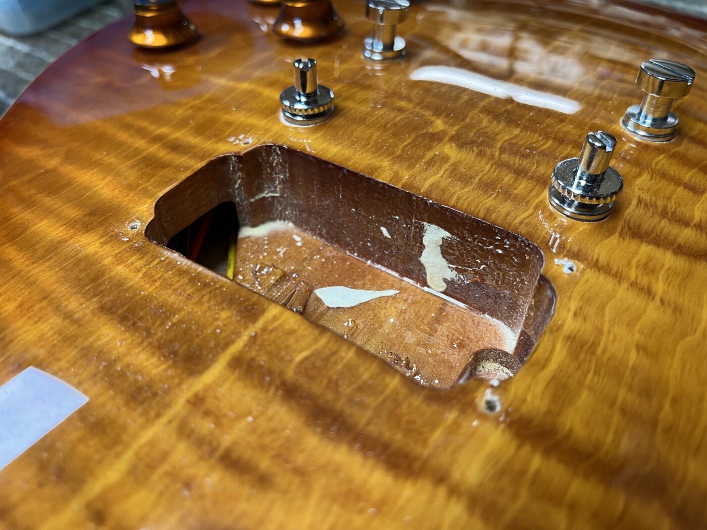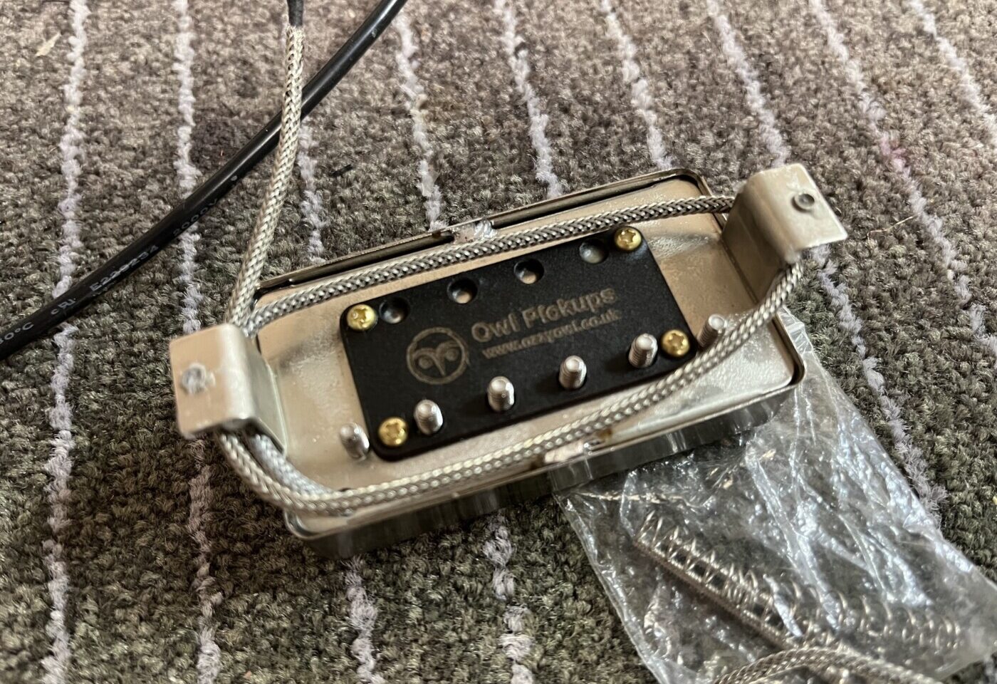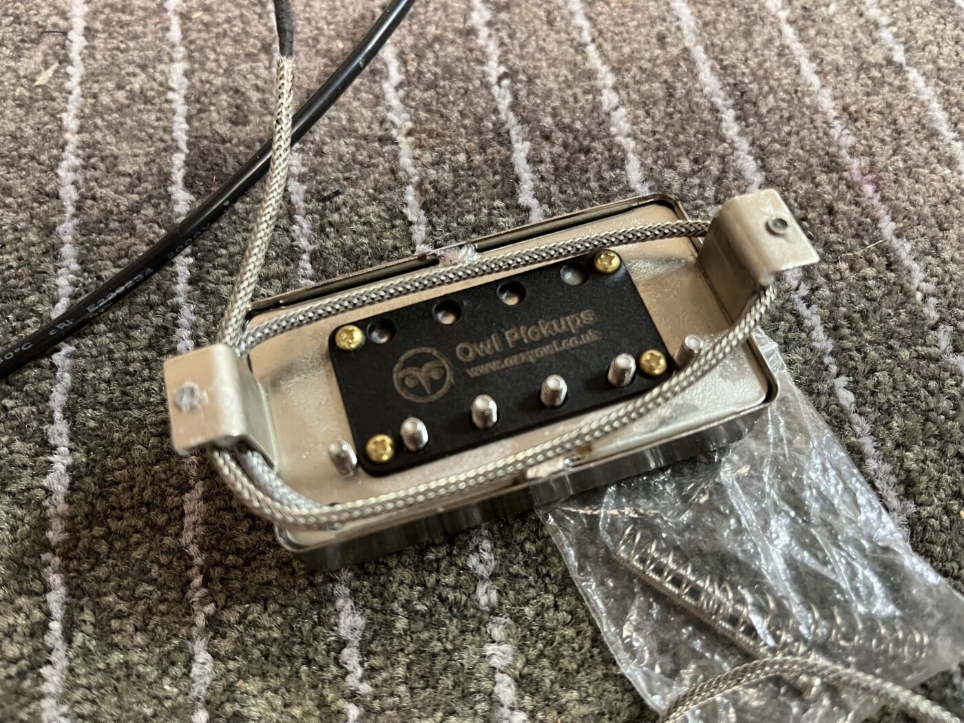 Here’s an example of a “Chibson” knock off. I made a custom “PAF” style pickup for it and along with that installed a Gibson “Greeny” neck pickup with the usual modifications. The fingerboard has a 16″ radius which feels a bit weird but doesn’t play too bad, even without a fret level!