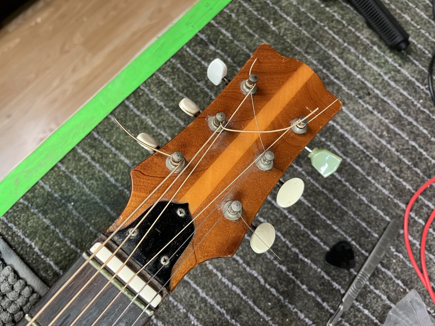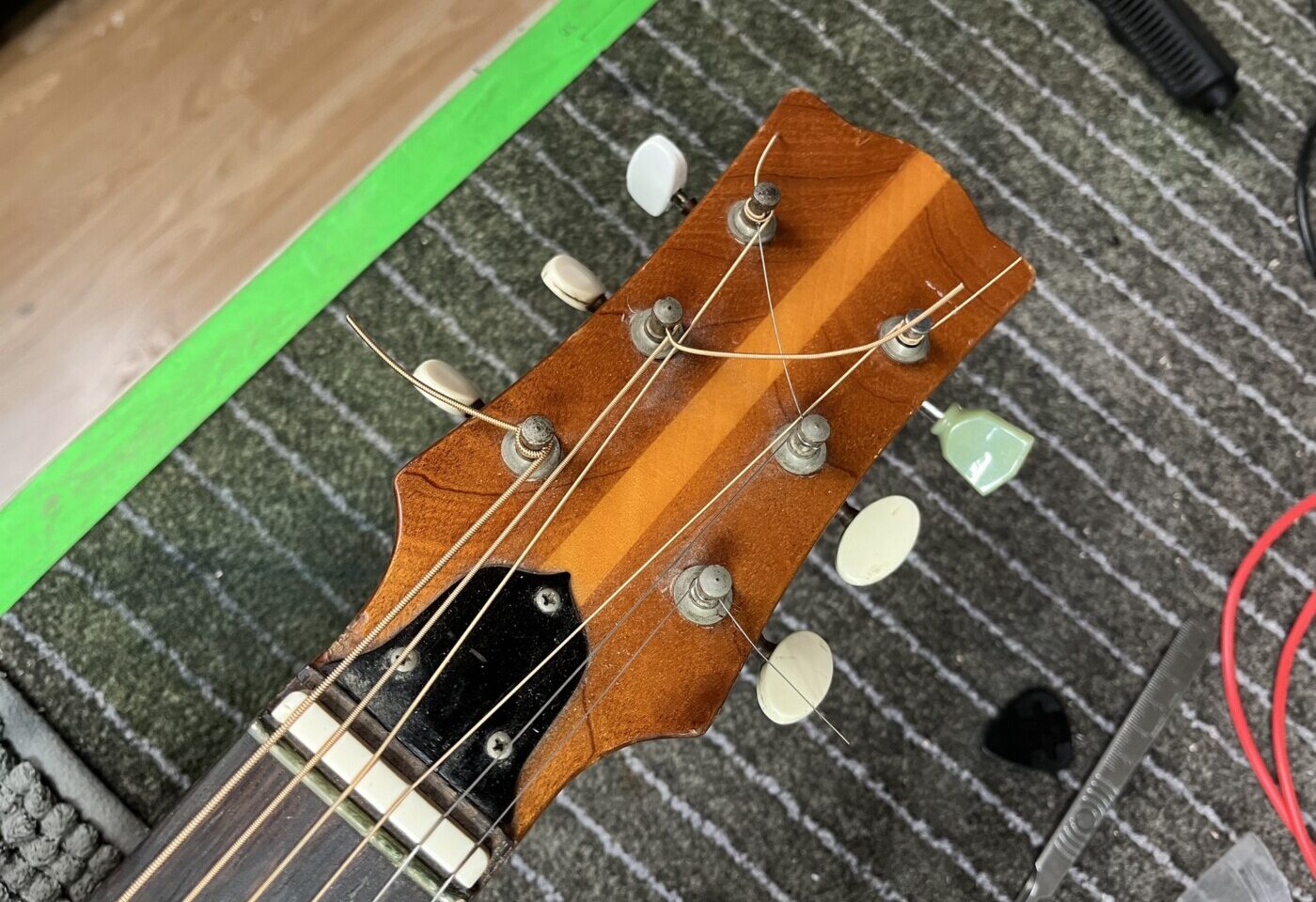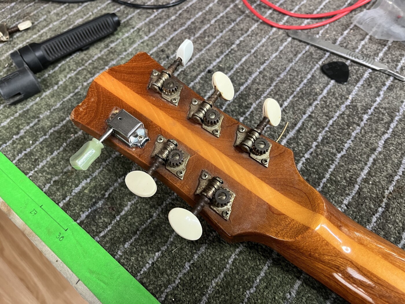 Not a pretty repair but a practical one. This guitar has great sentimental value to the owner and the gear of the G string tuner had gone. I had a spare “random”tuner that would work and it does.