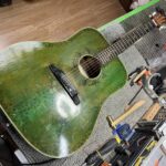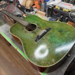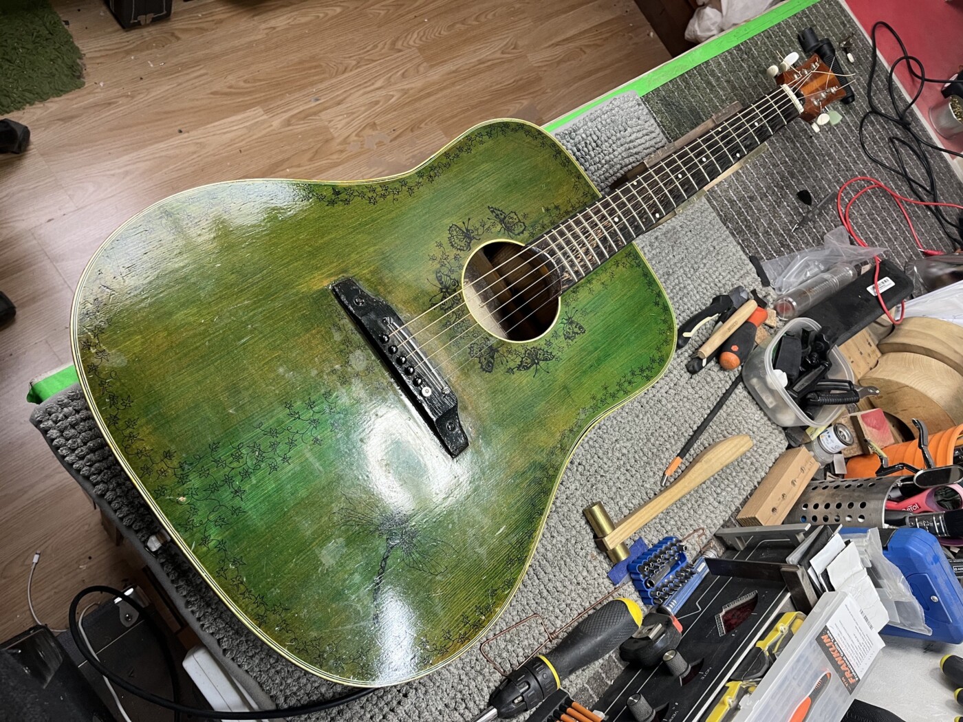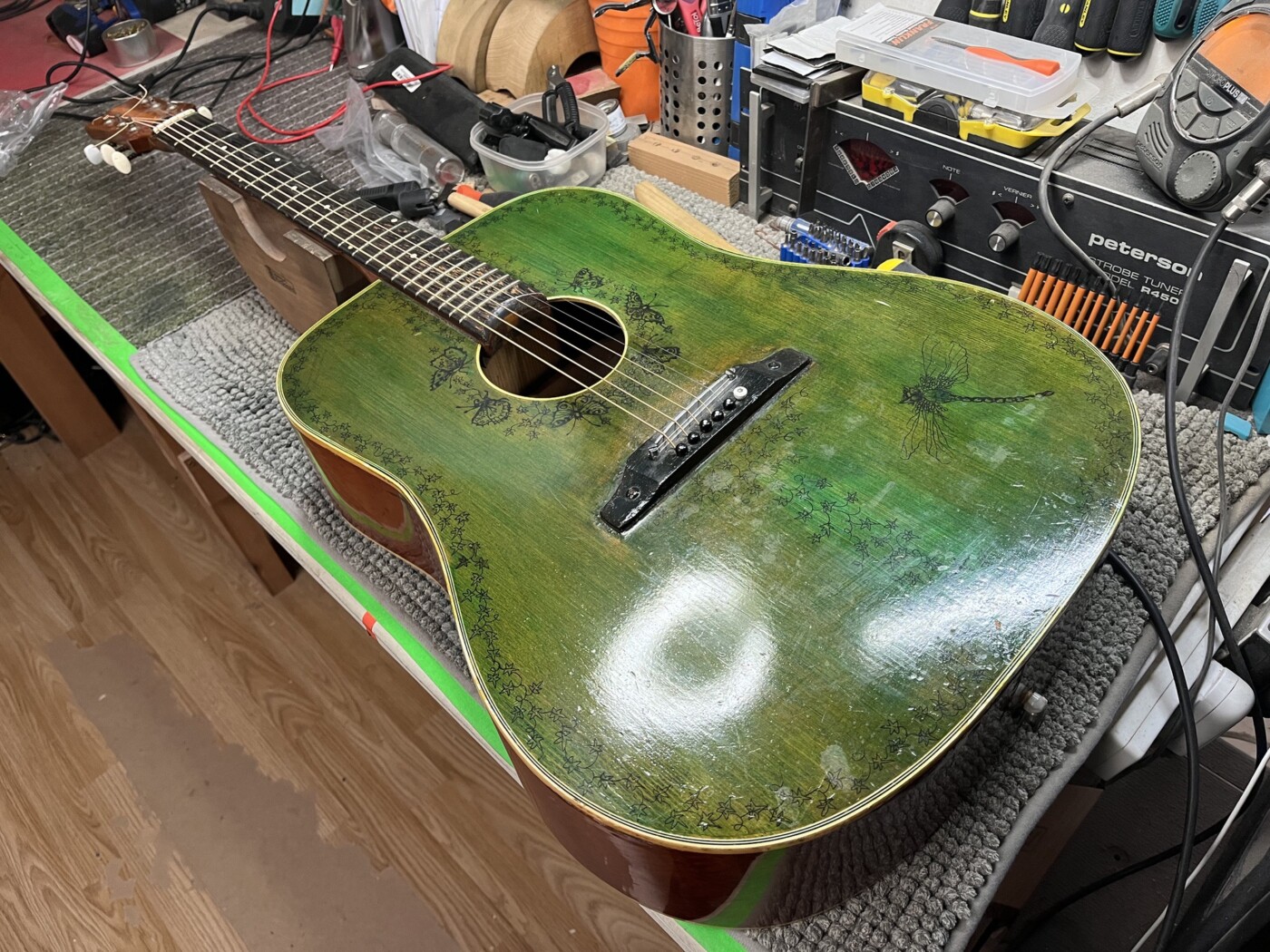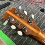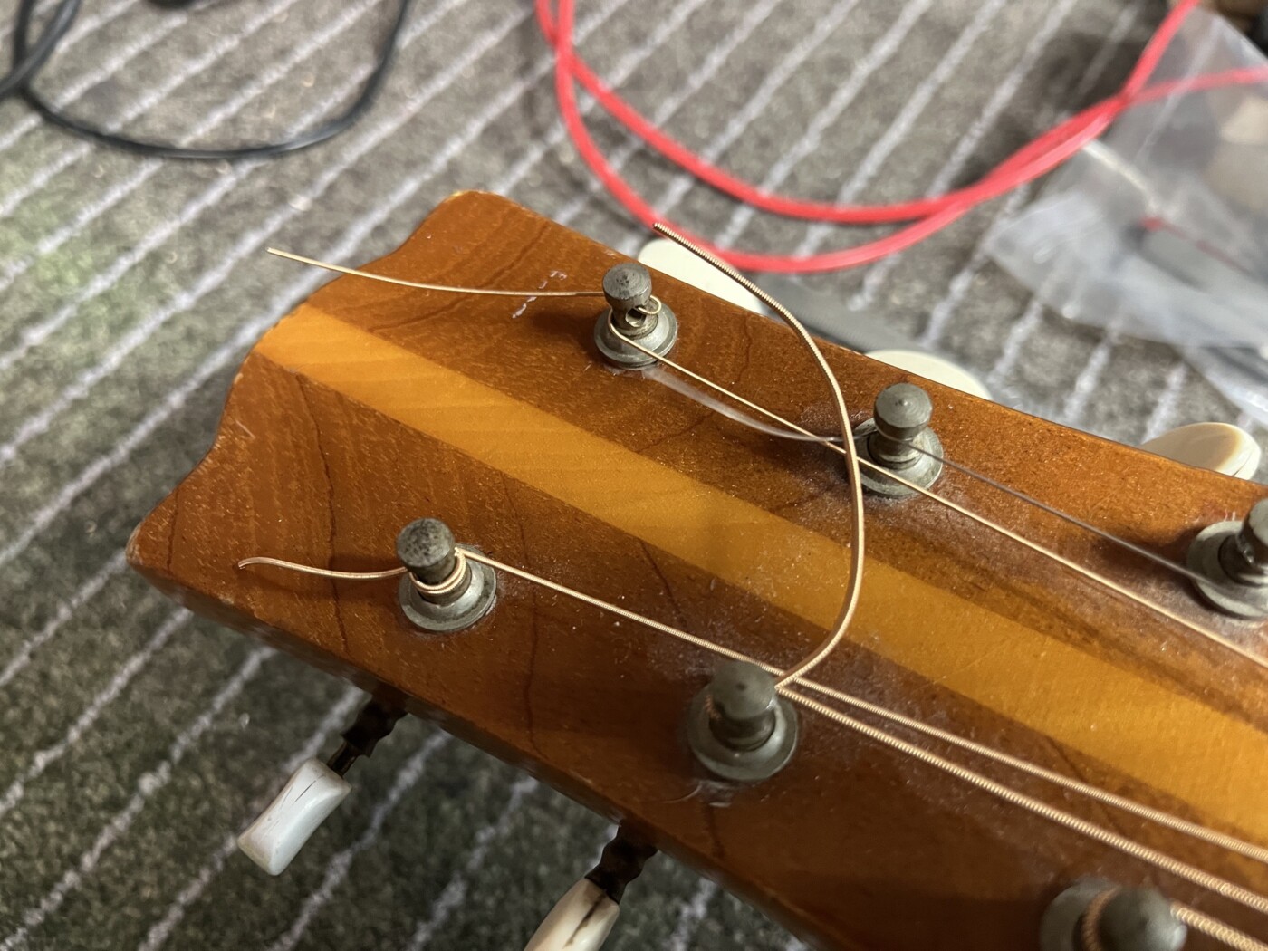 Not a pretty repair but a practical one. This guitar has great sentimental value to the owner and the gear of the G string tuner had gone. I had a spare “random”tuner that would work and it does.