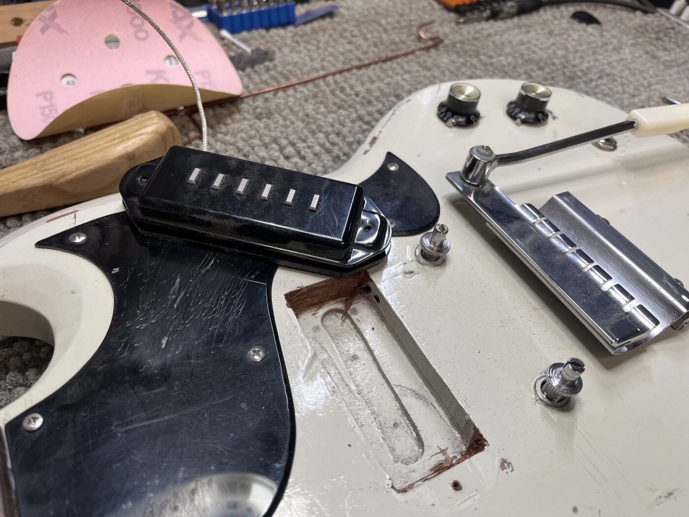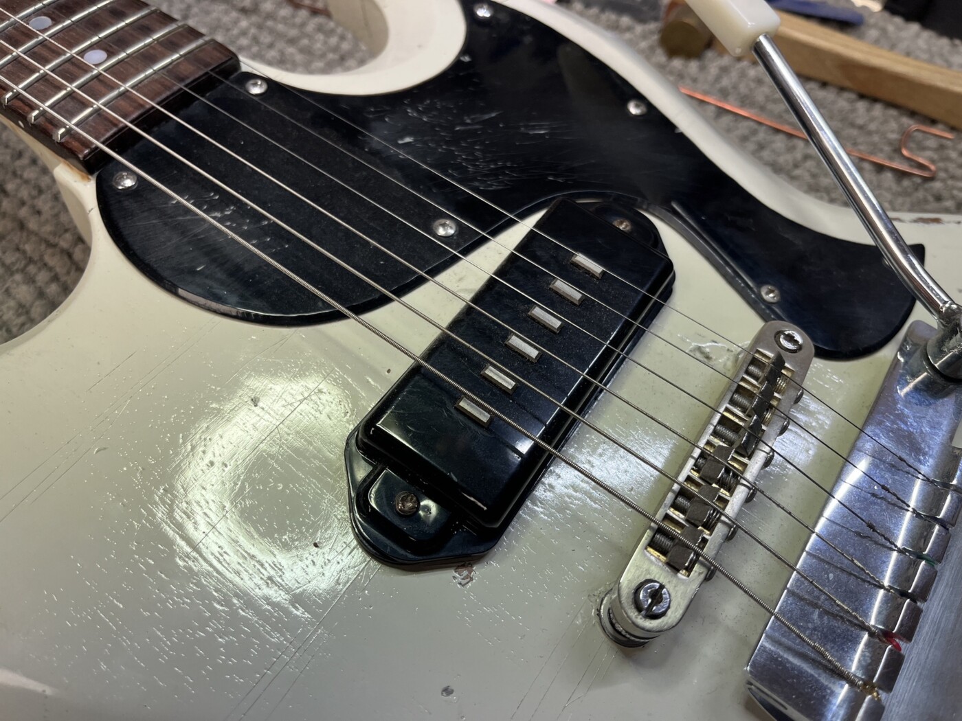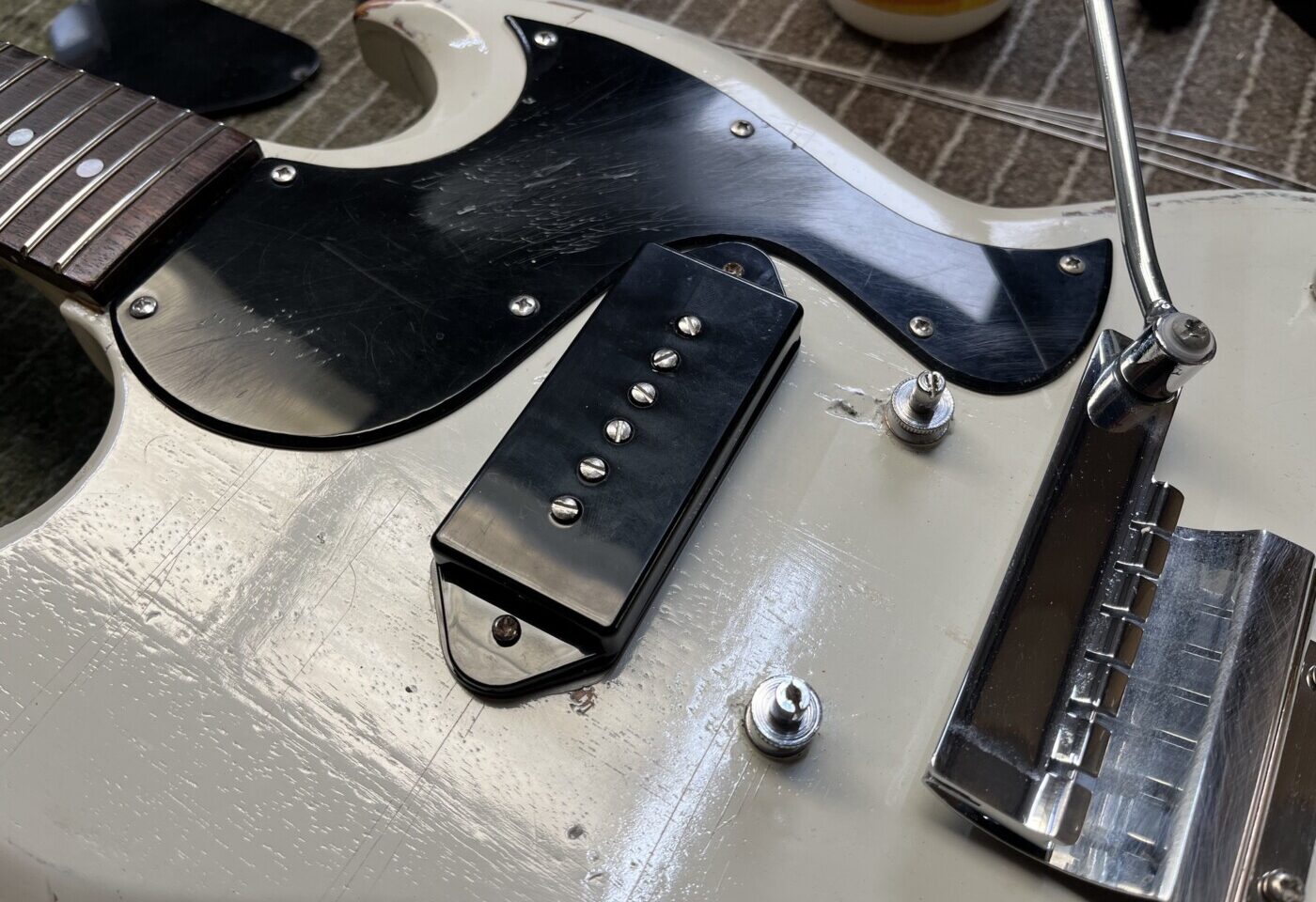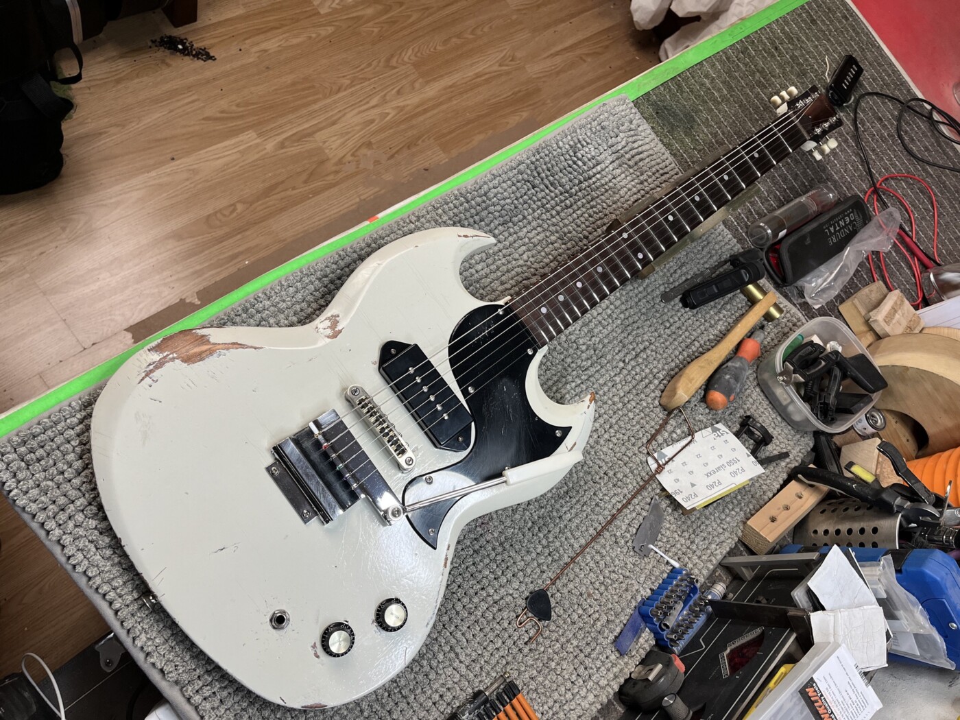 Hand Made SG (White) This SG had a setup and I made a P90 to replace the Staple one that was in it. Setup with D’Addario 10 – 46. Hand Made Charvel Copy See all projects Harley Benton 25th Anniversary Tele