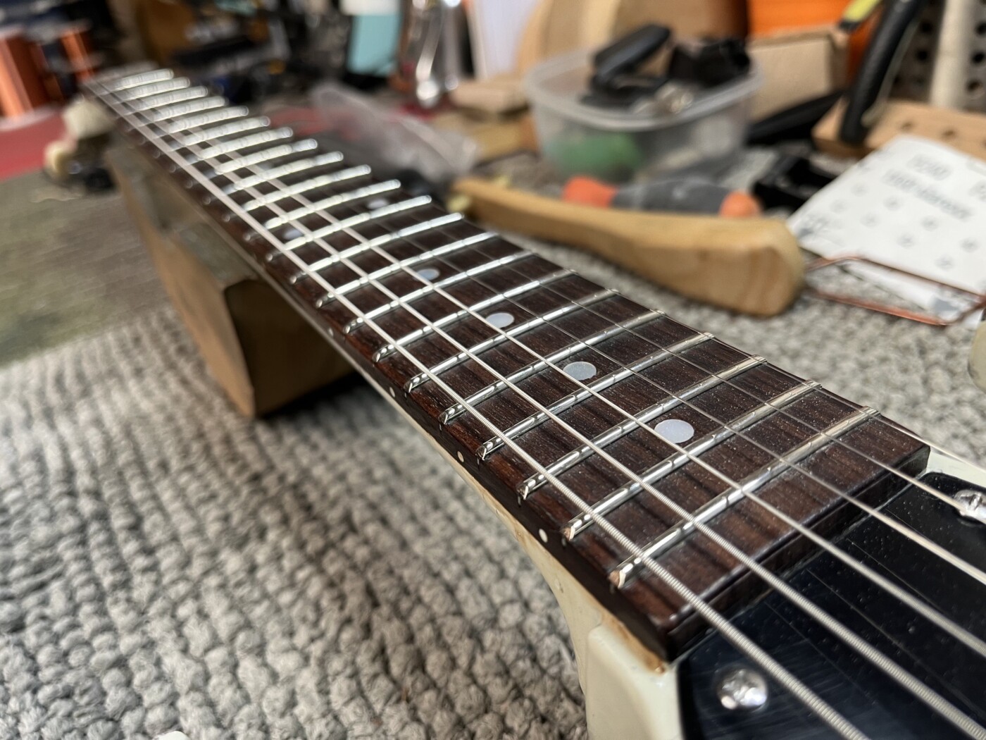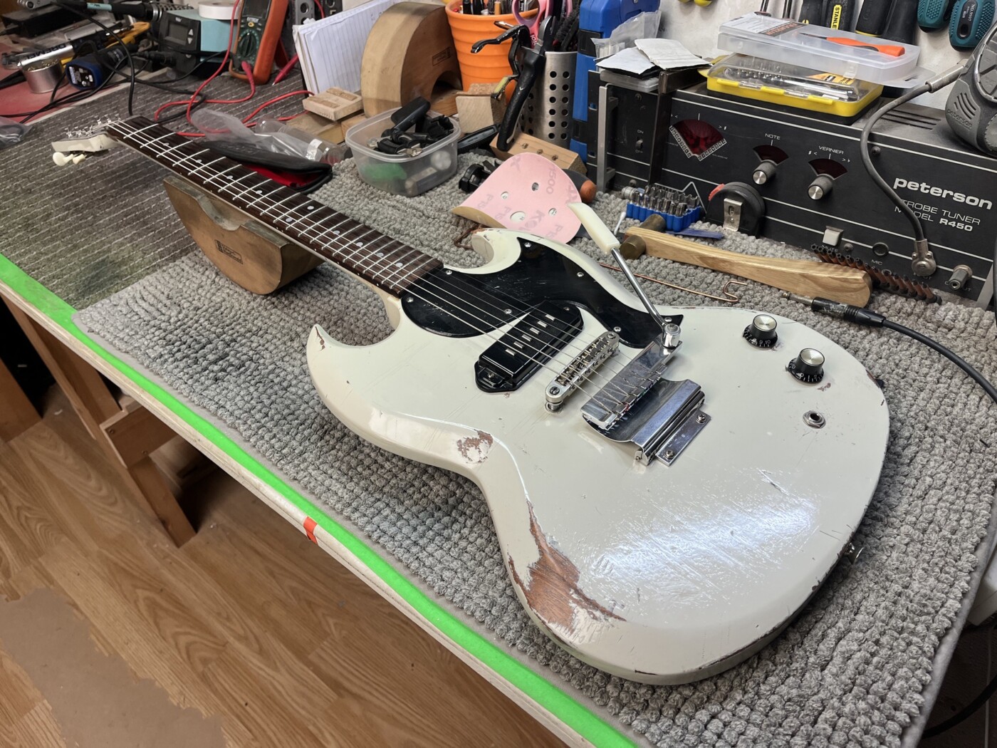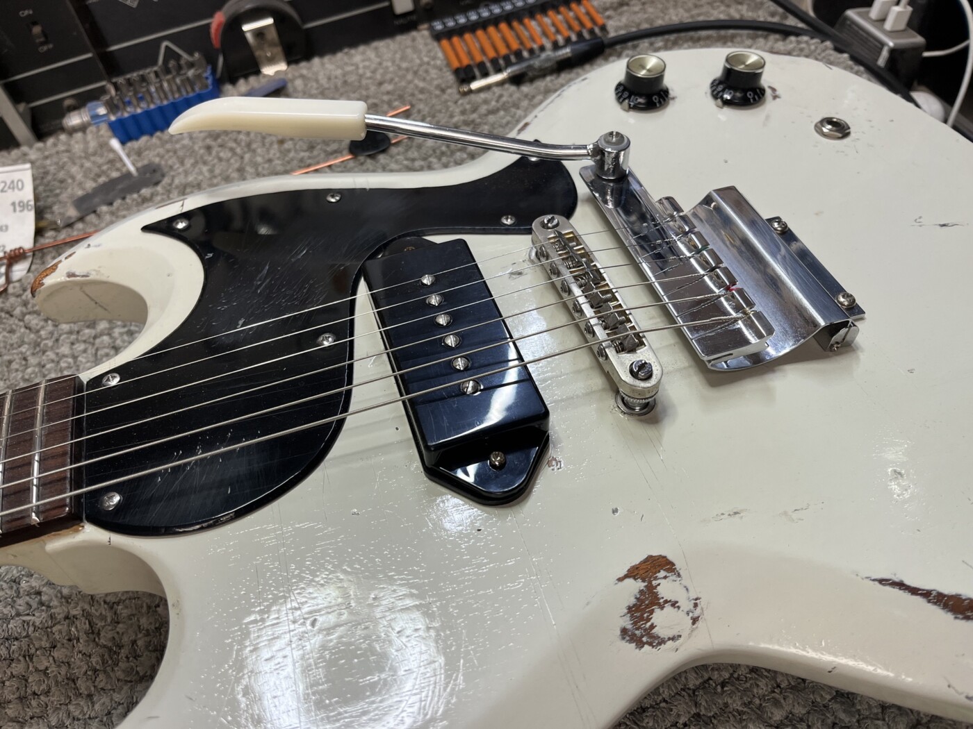 Hand Made SG (White) This SG had a setup and I made a P90 to replace the Staple one that was in it. Setup with D’Addario 10 – 46. Hand Made Charvel Copy See all projects Harley Benton 25th Anniversary Tele