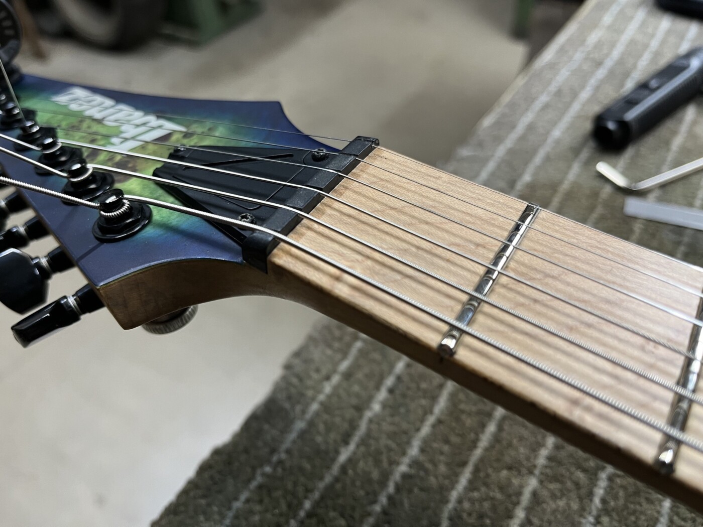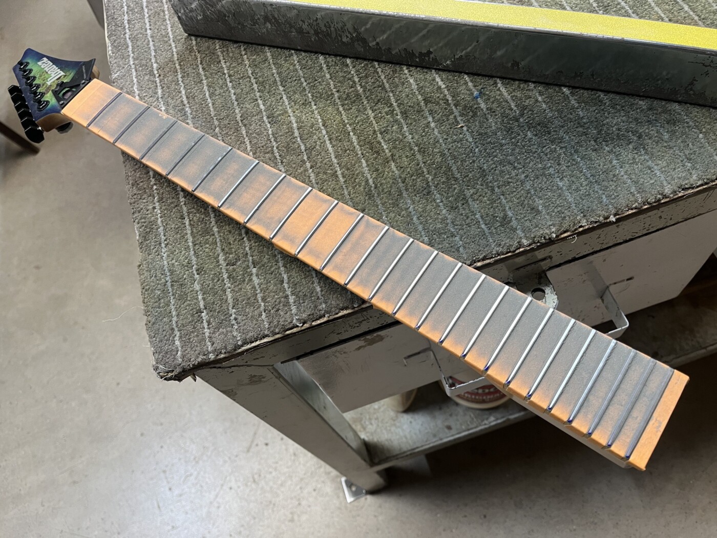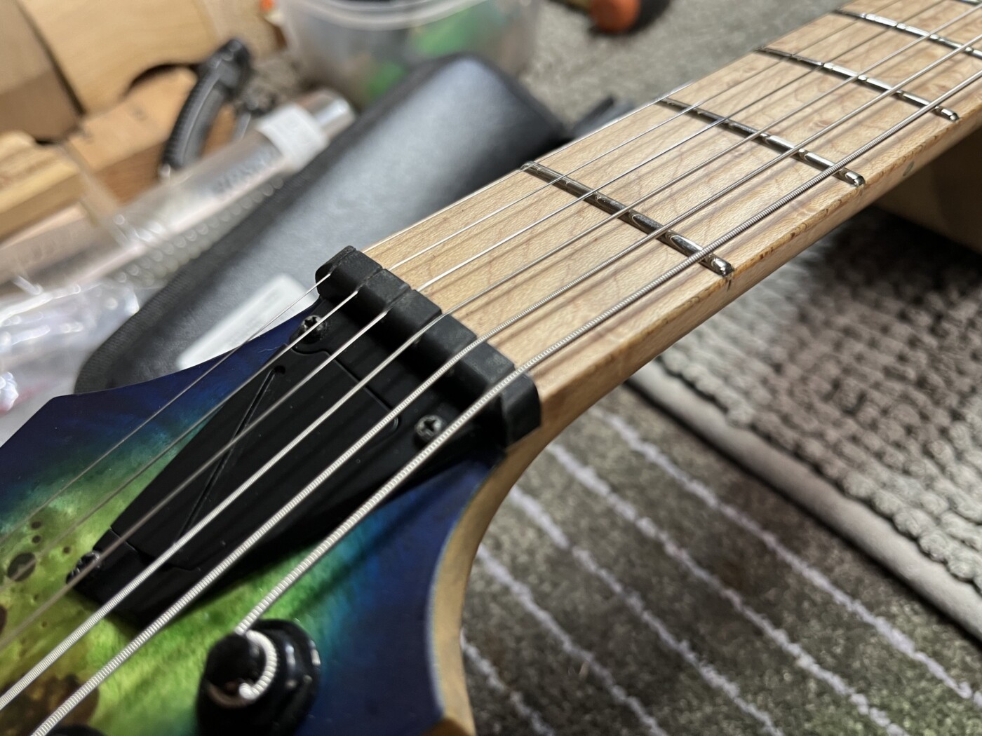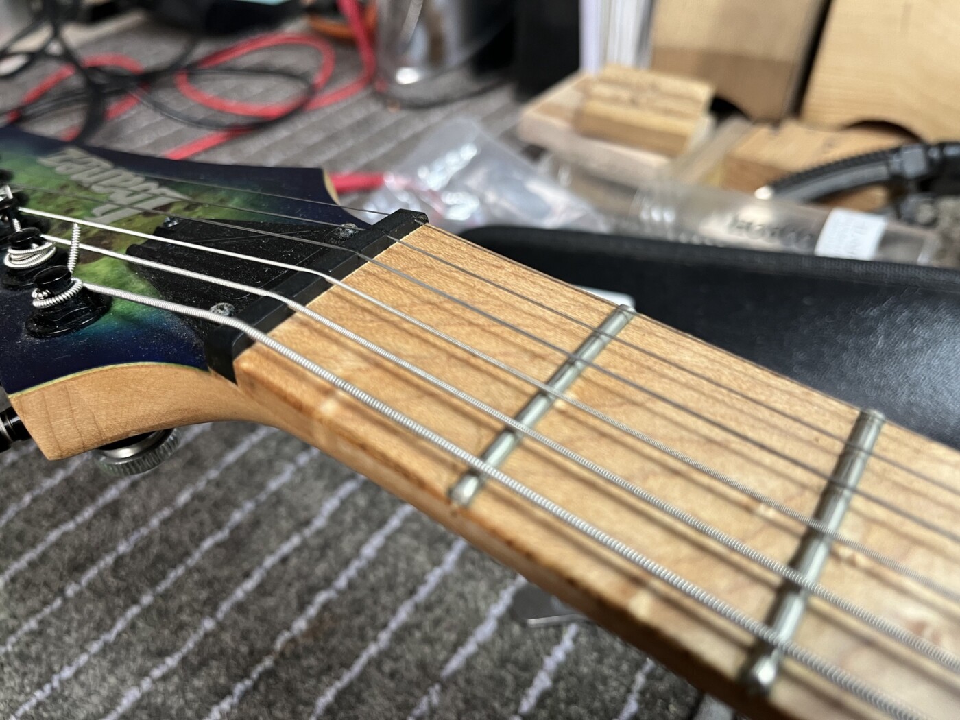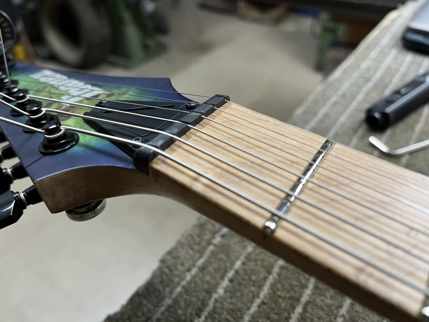 I gave this Ibanez a much needed fret level. The neck was shaped like an S and there was a real low spot around the 9th and 10th fret, especially on the D and G strings.
