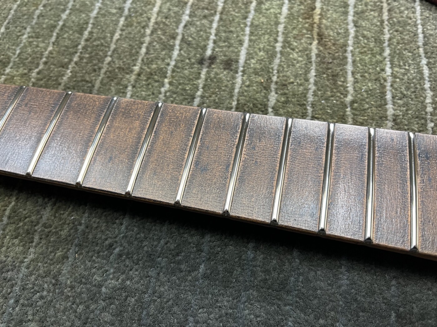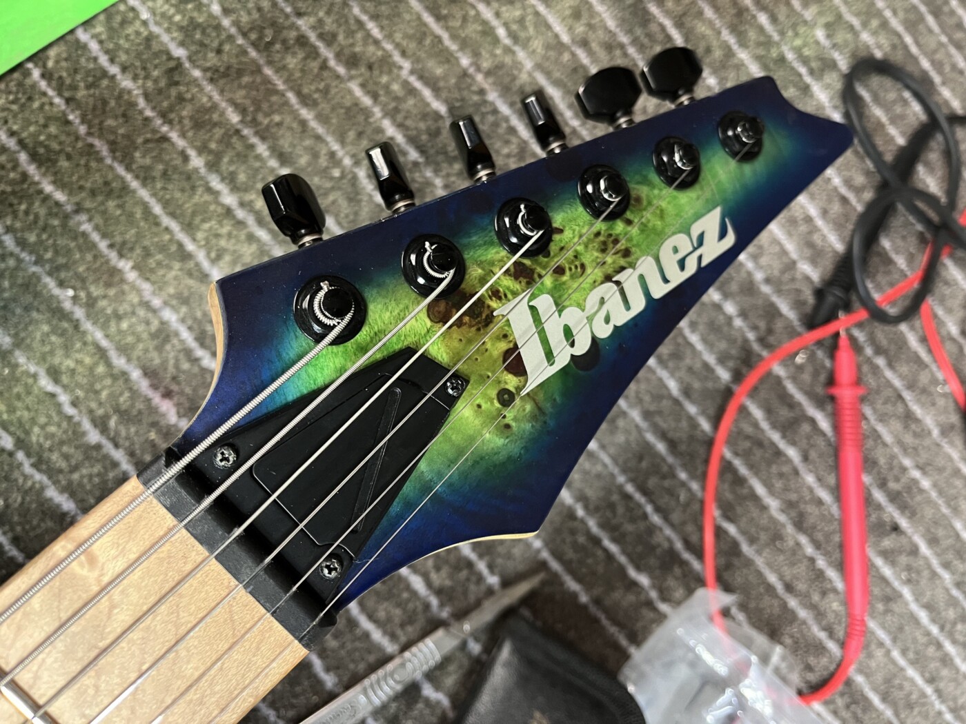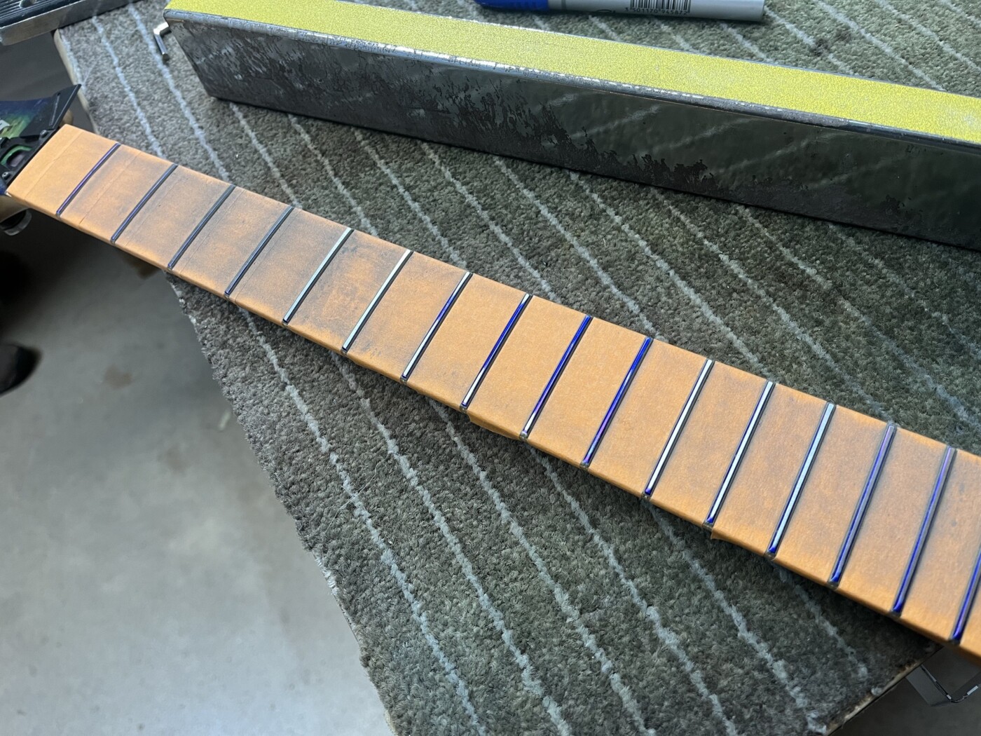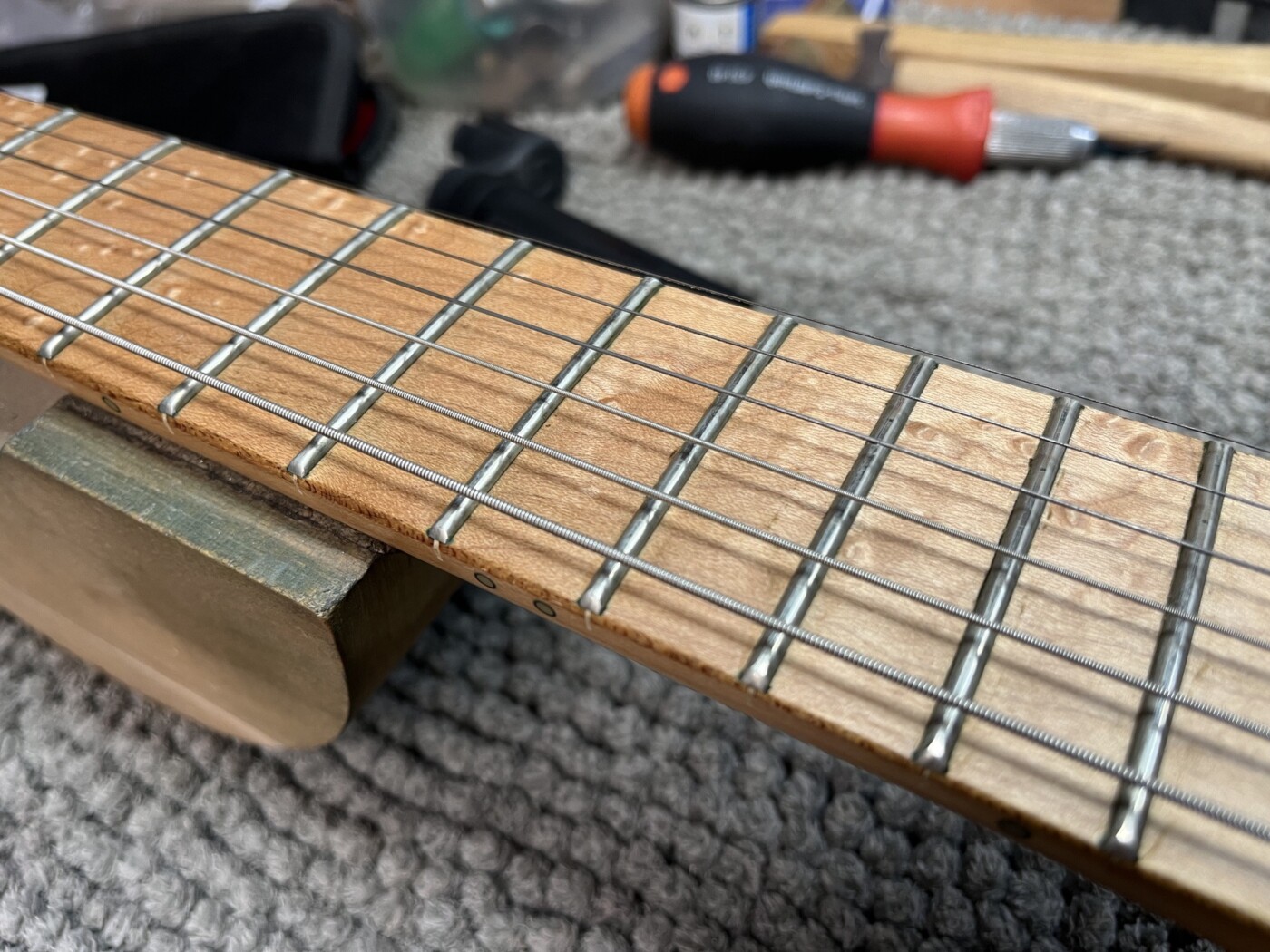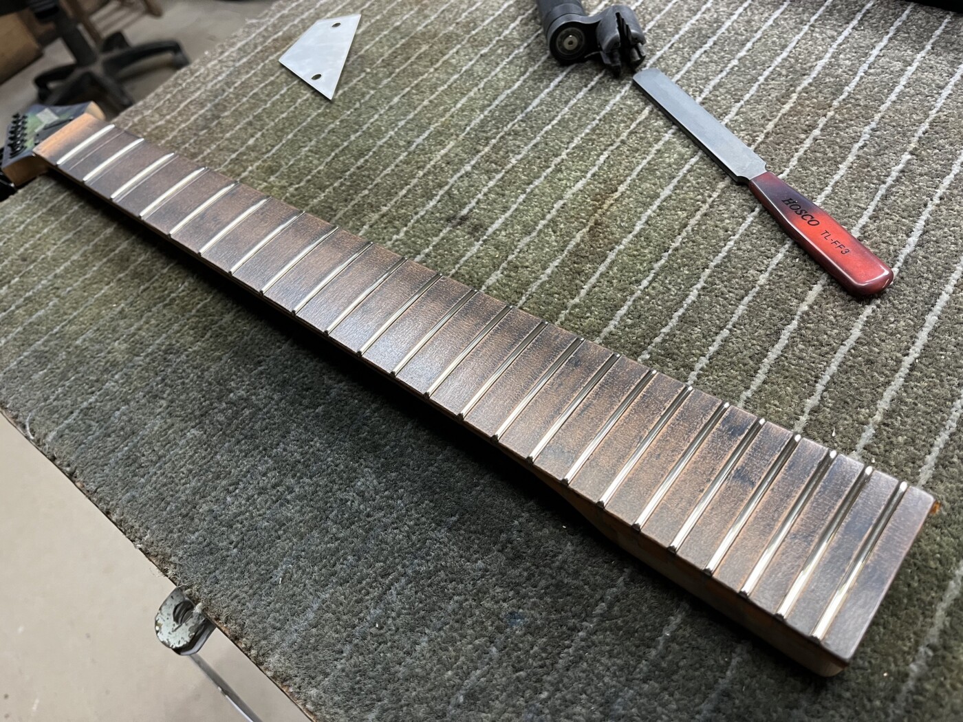 I gave this Ibanez a much needed fret level. The neck was shaped like an S and there was a real low spot around the 9th and 10th fret, especially on the D and G strings.