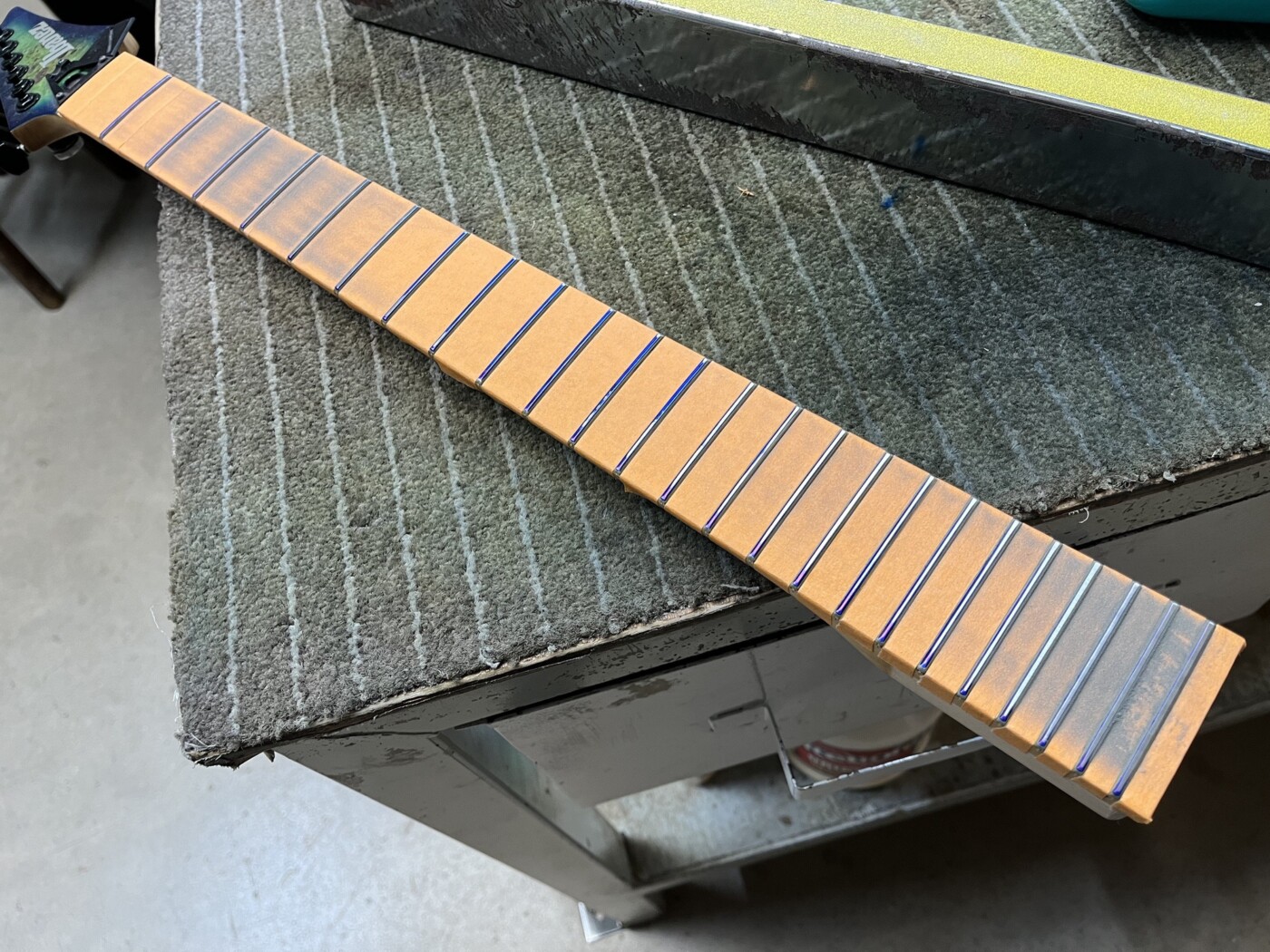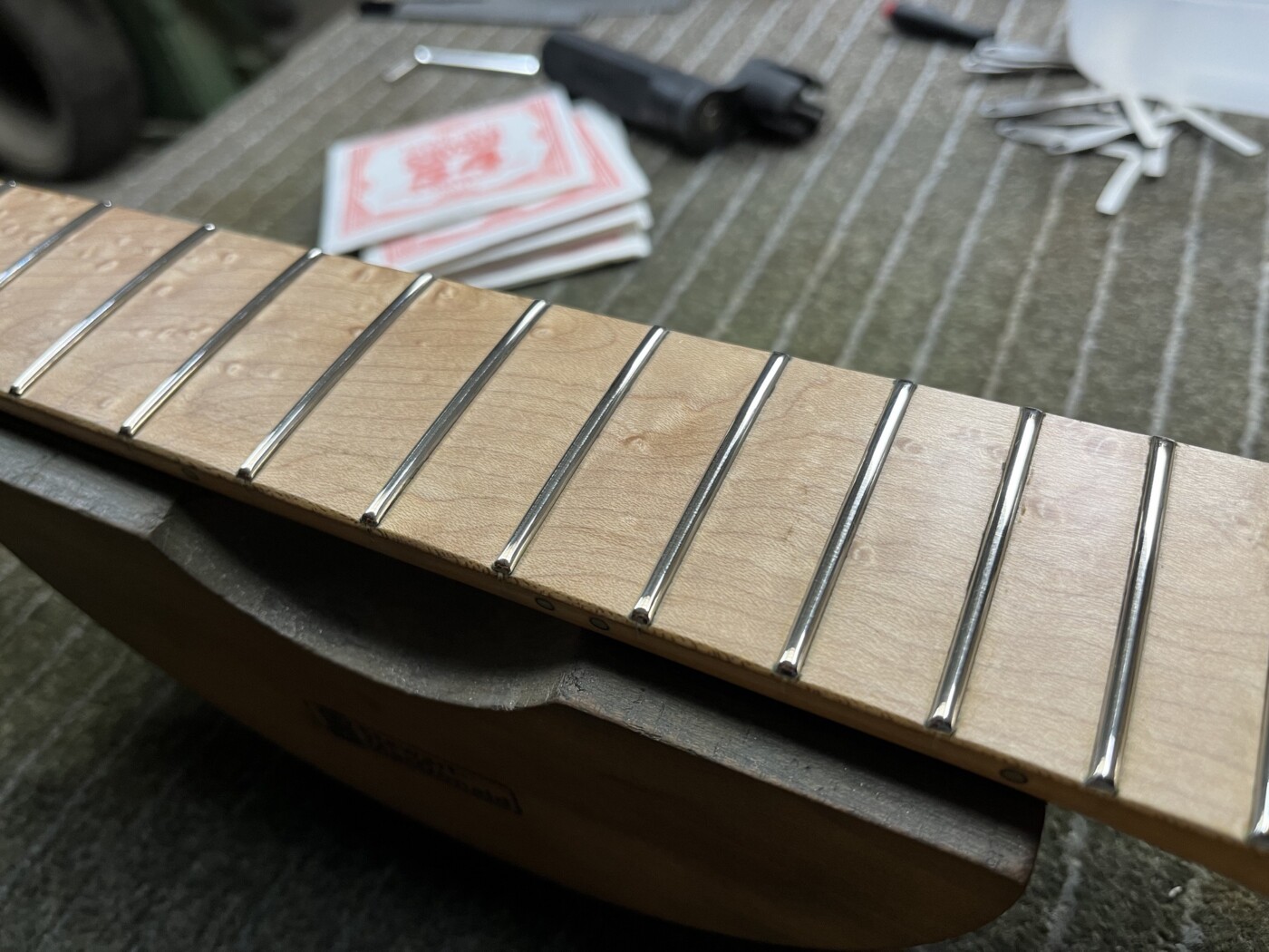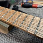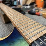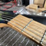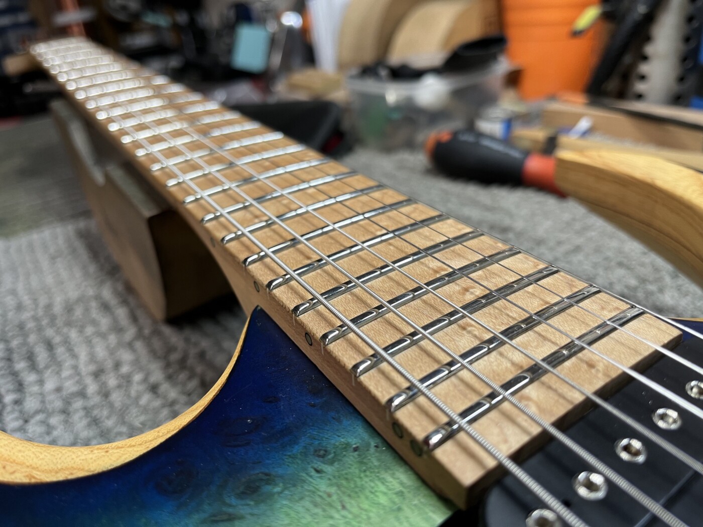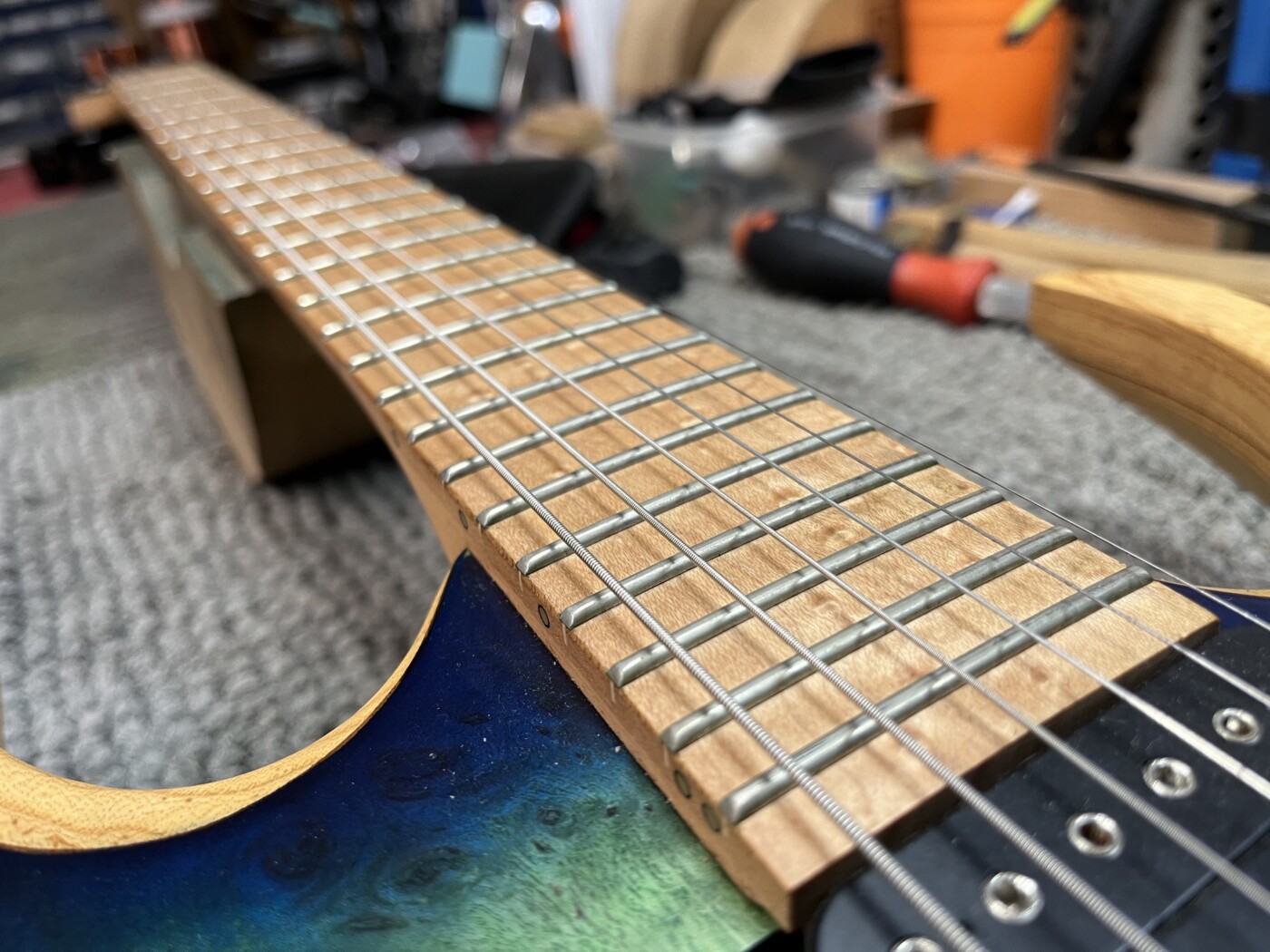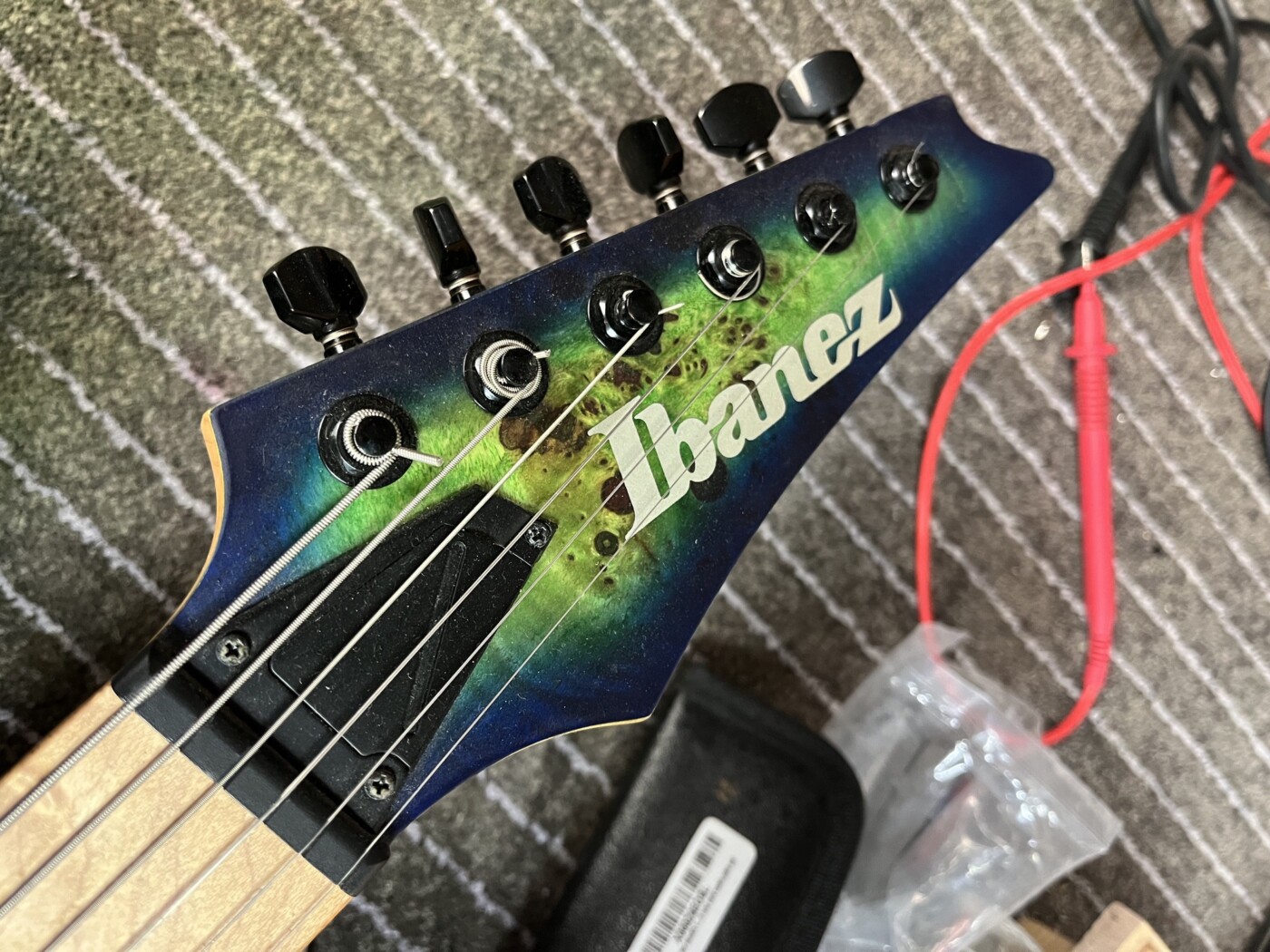 I gave this Ibanez a much needed fret level. The neck was shaped like an S and there was a real low spot around the 9th and 10th fret, especially on the D and G strings.