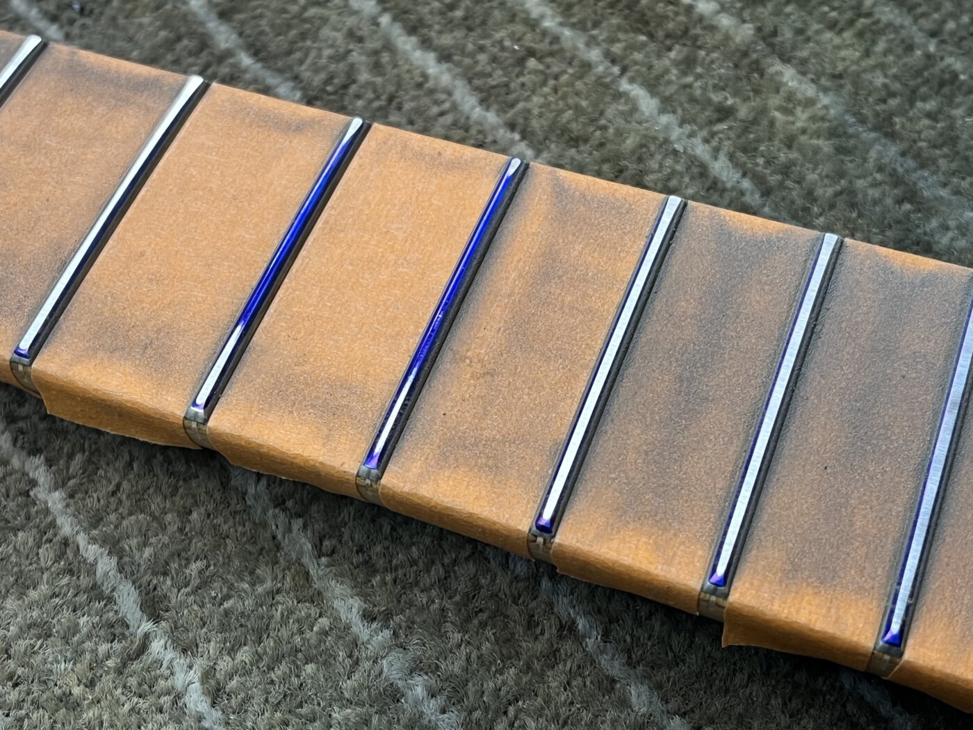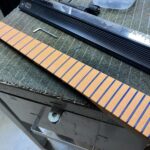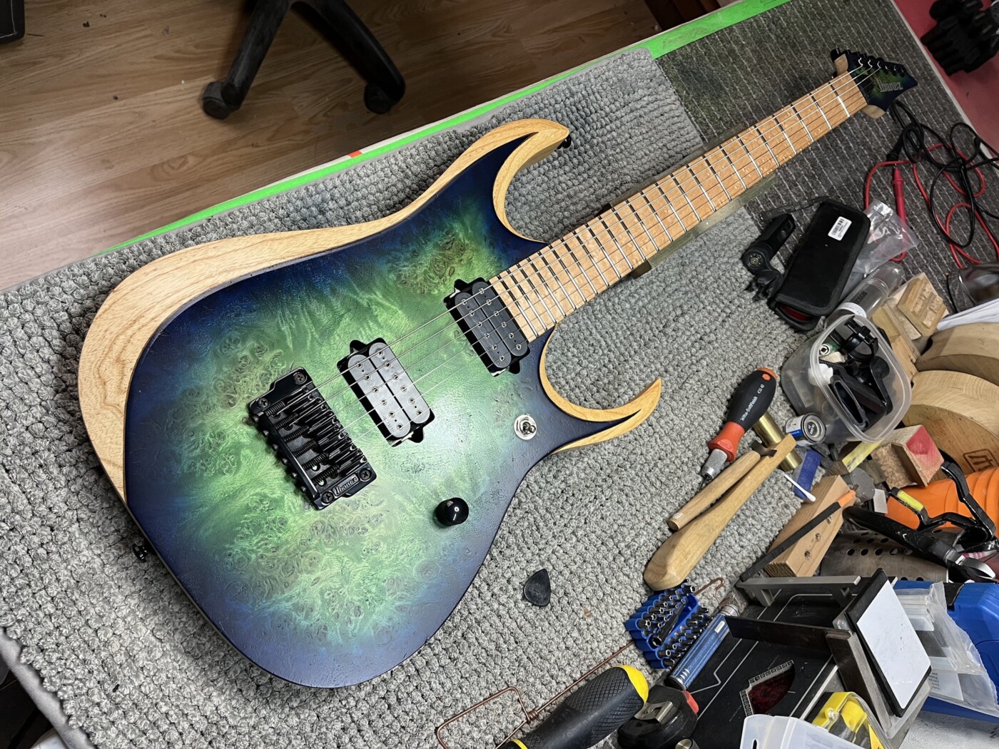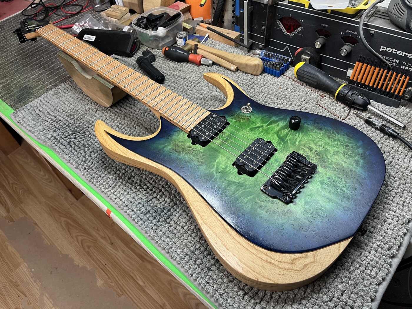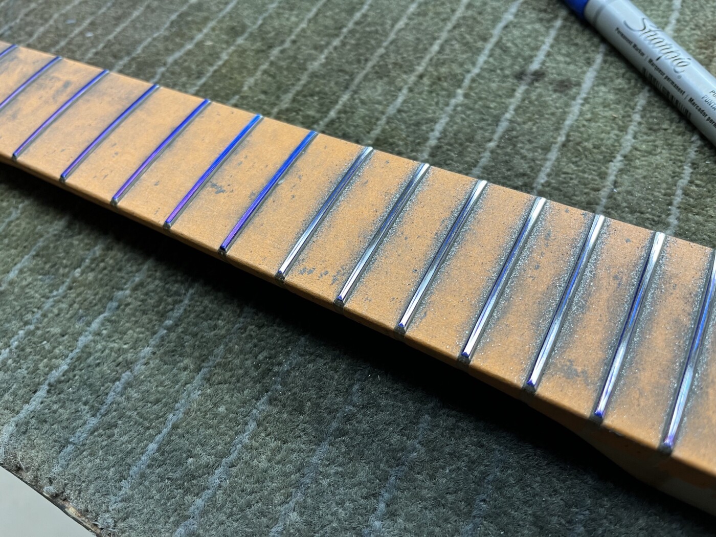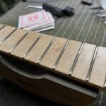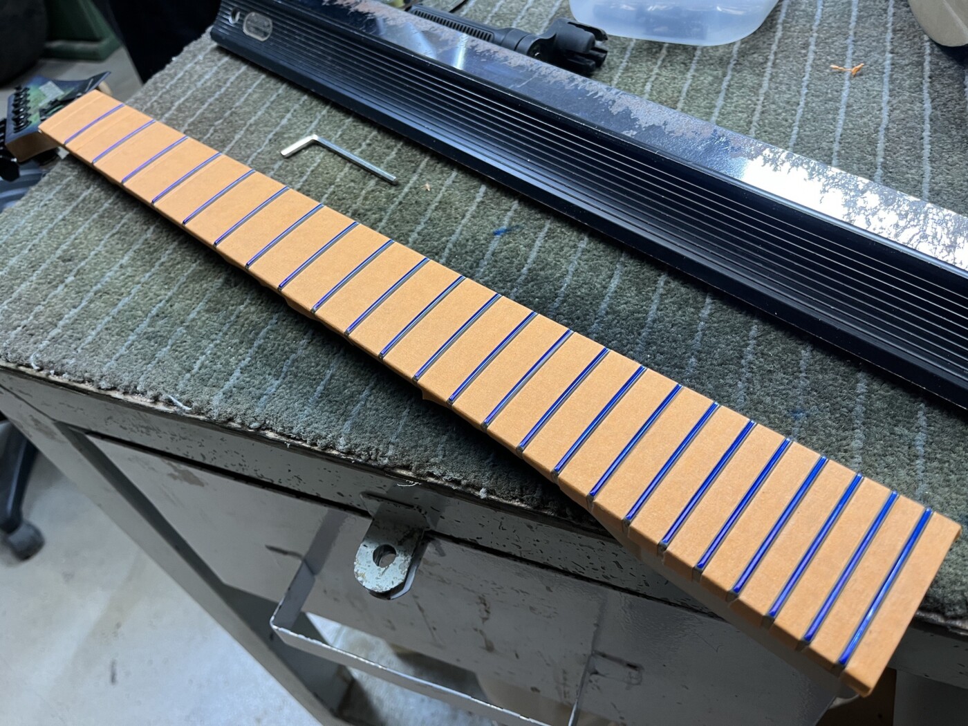 I gave this Ibanez a much needed fret level. The neck was shaped like an S and there was a real low spot around the 9th and 10th fret, especially on the D and G strings.