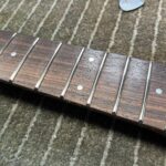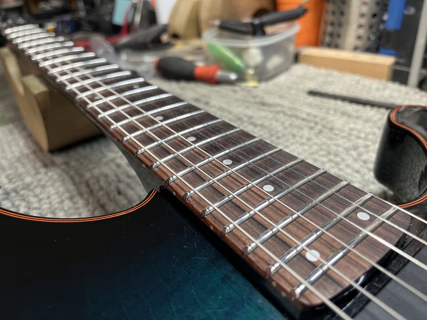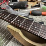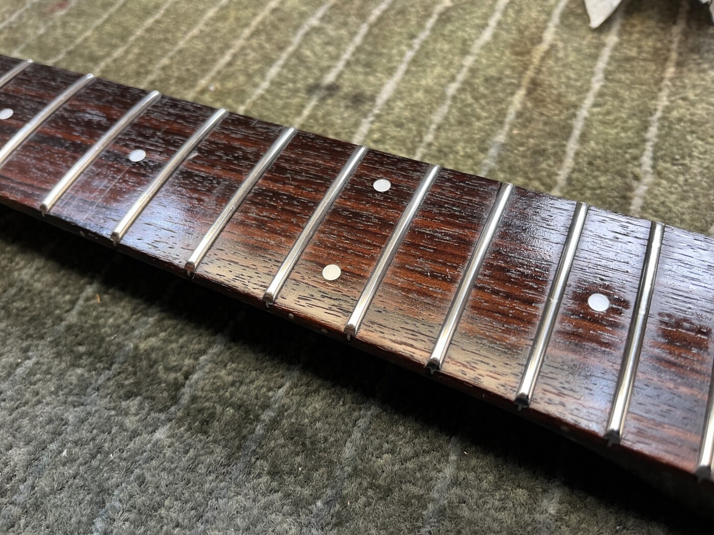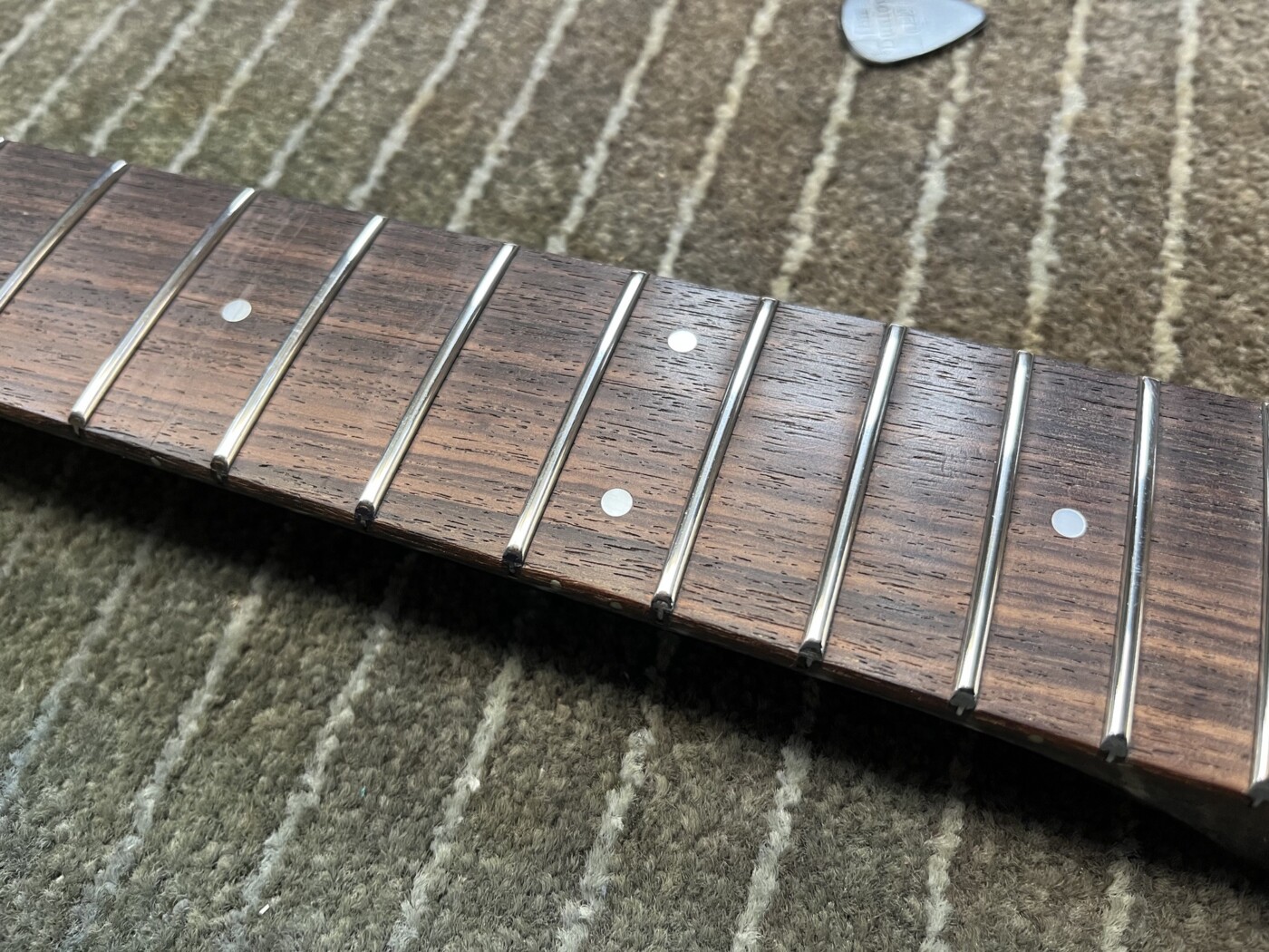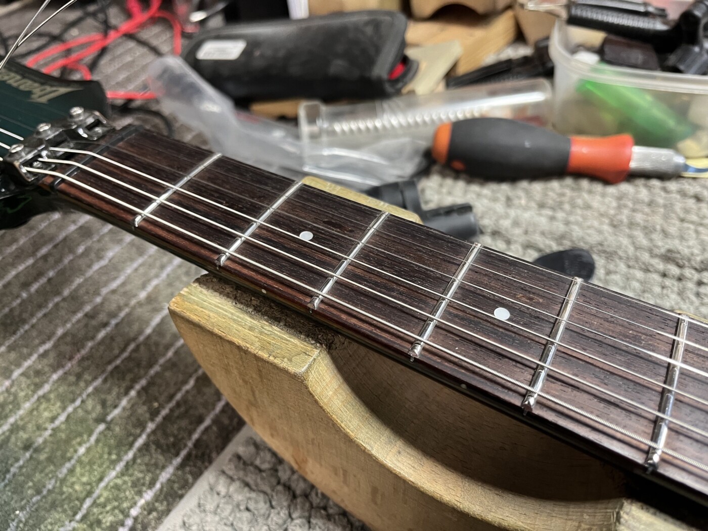 I re-fretted this guitar a while back. It’s come back with a suspected high 5th fret. On inspection it turned out that the 4th was actually low along with a few other frets. In fact once I levelled them it became apparent that the whole neck had moved around substantially.