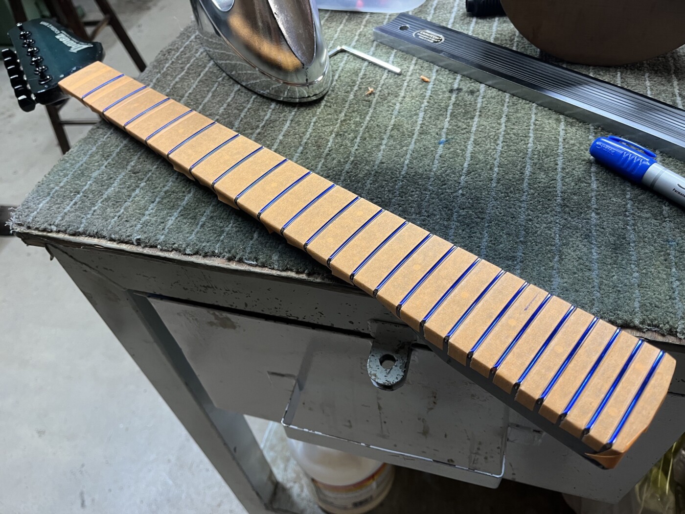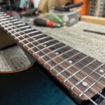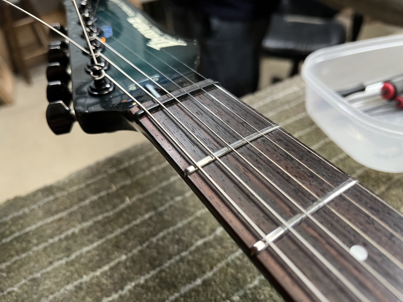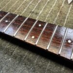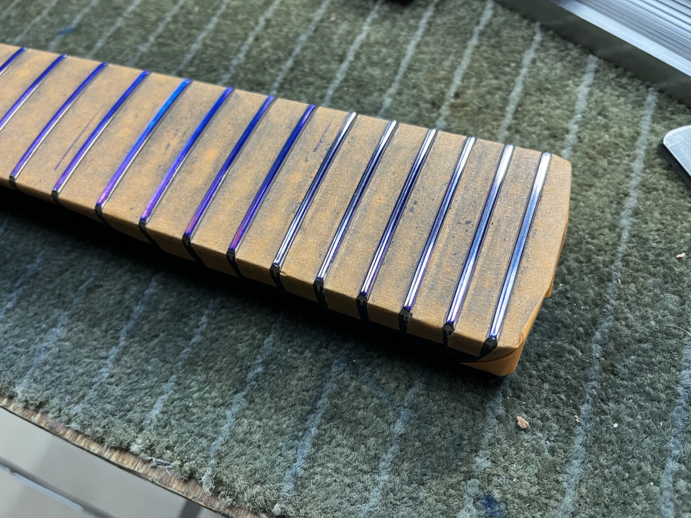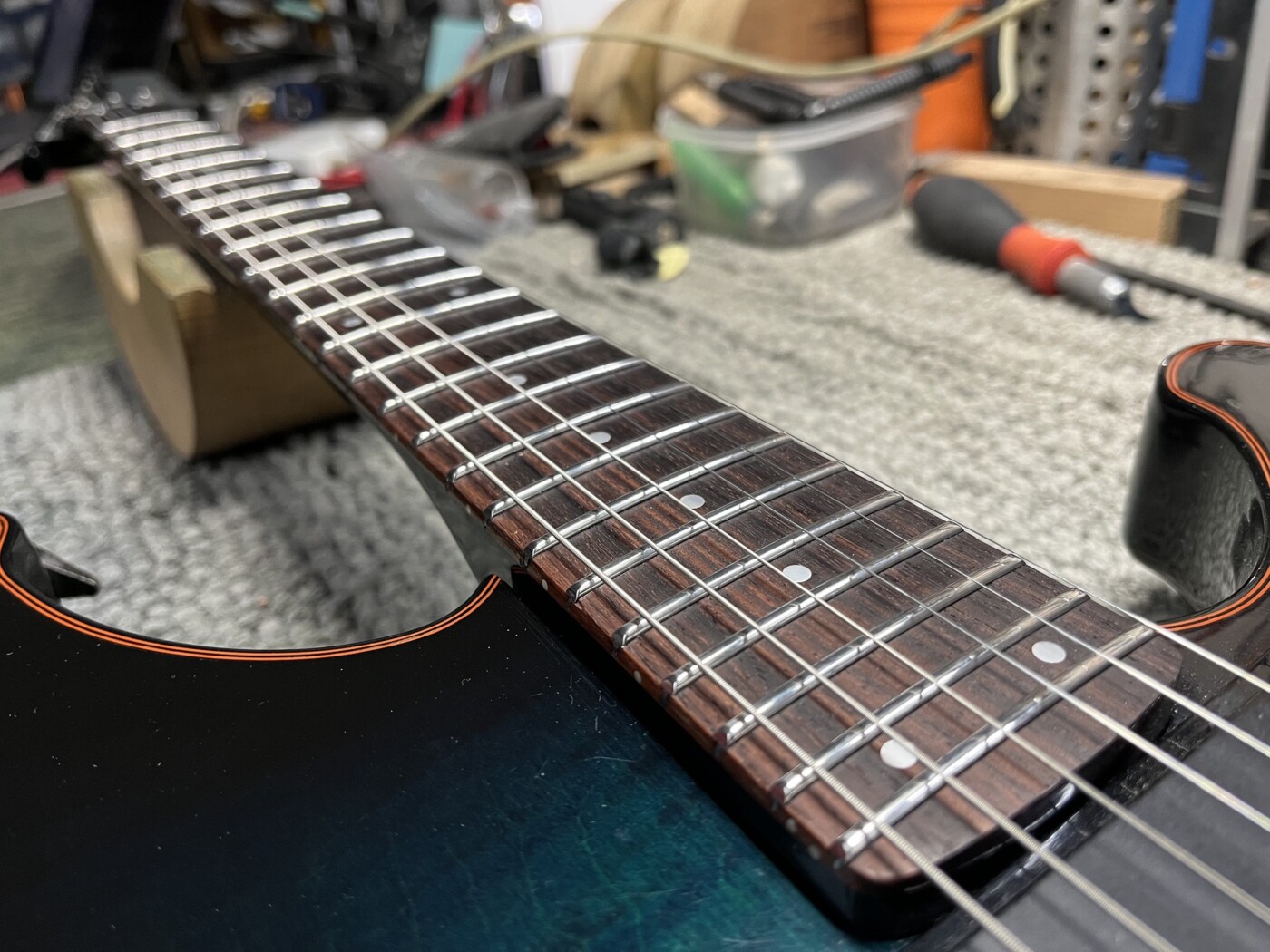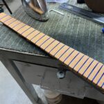 I re-fretted this guitar a while back. It’s come back with a suspected high 5th fret. On inspection it turned out that the 4th was actually low along with a few other frets. In fact once I levelled them it became apparent that the whole neck had moved around substantially.