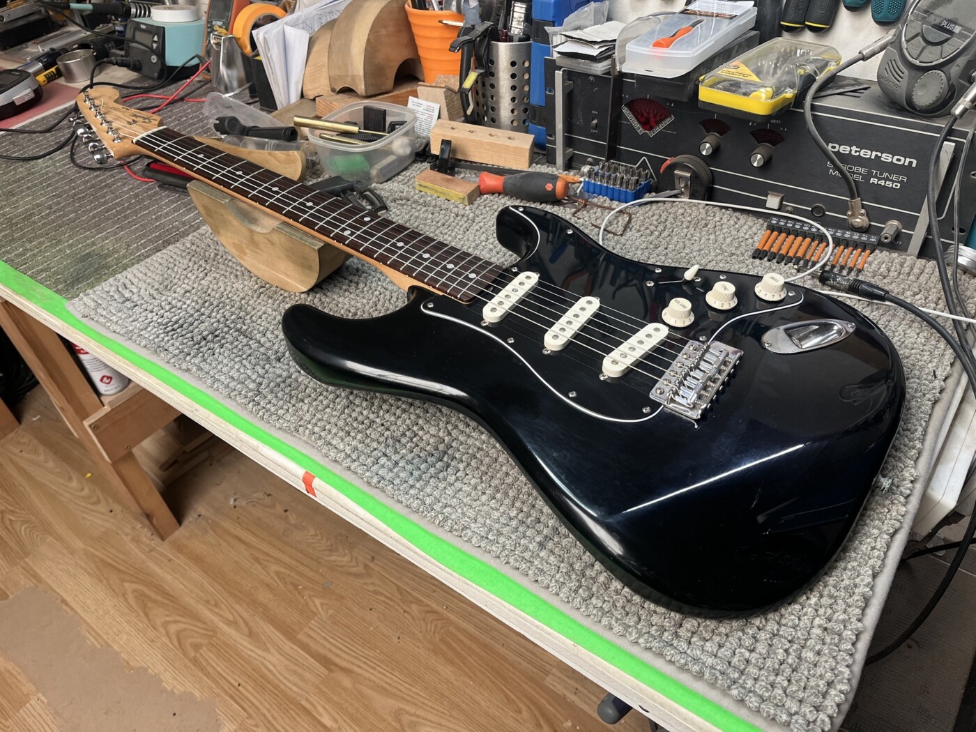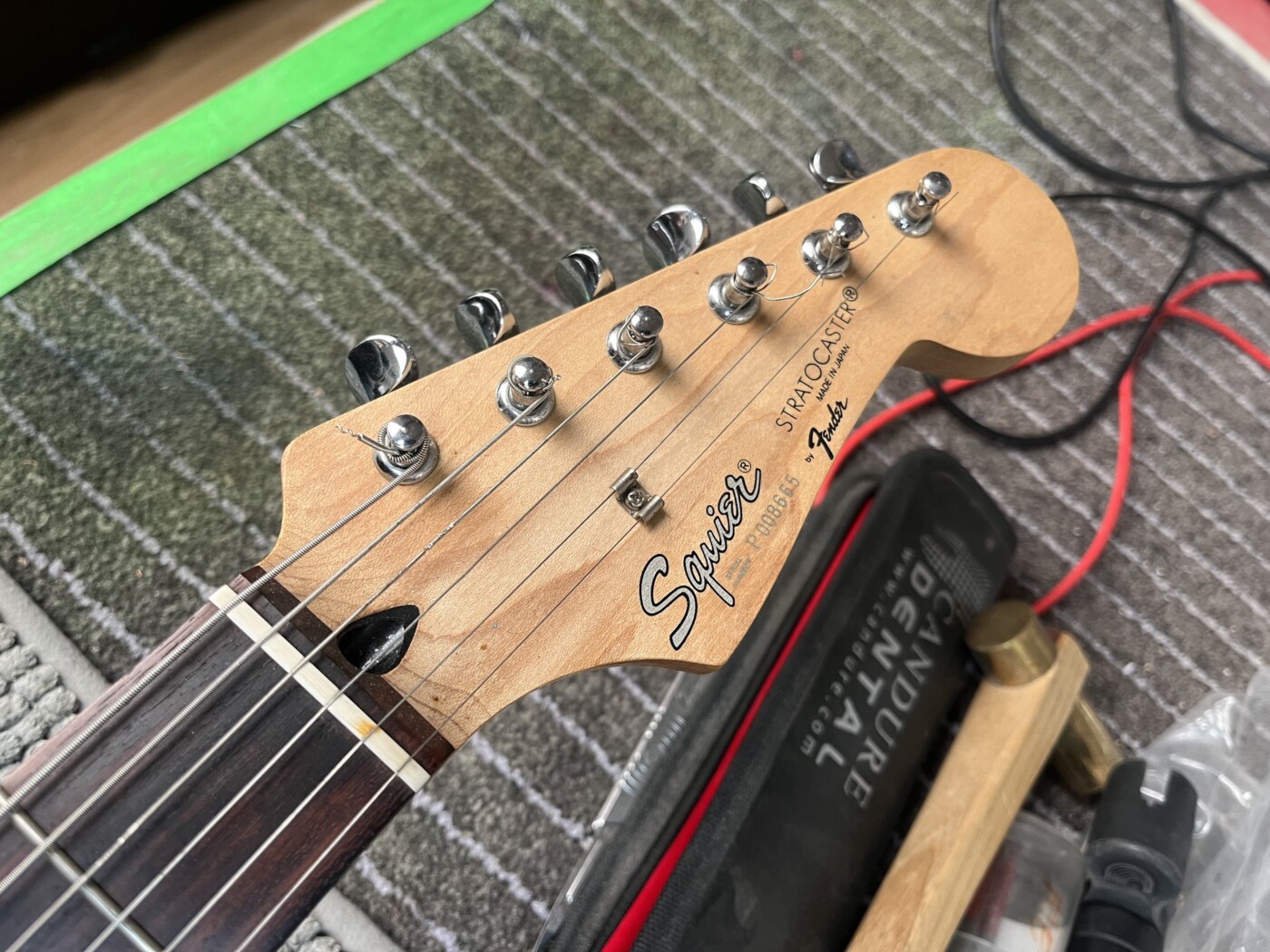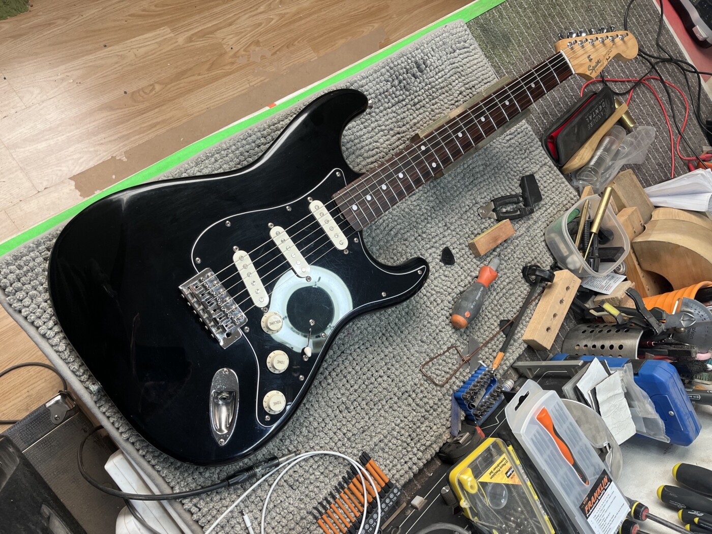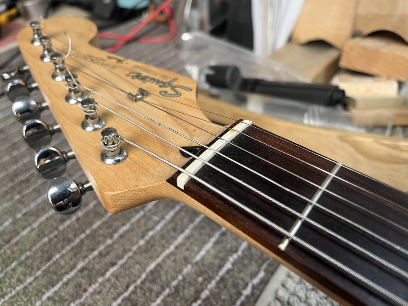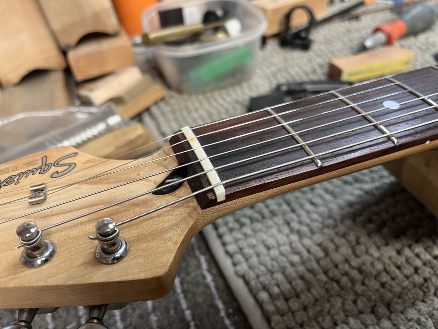 Fairly straight forward setup on this Squier. The treble tone pot was always off when switched in which suggested there was some kind of short circuit. On inspection I was proofed right and one of the lugs was bent over onto the output lug. There wasn’t enough relief in the neck and I loosened the truss rod as much as I could which gave me the tiniest amount, I suspect when the neck was stripped it caused the neck to warp into a back bow. Seems passable but I guess time will tell.