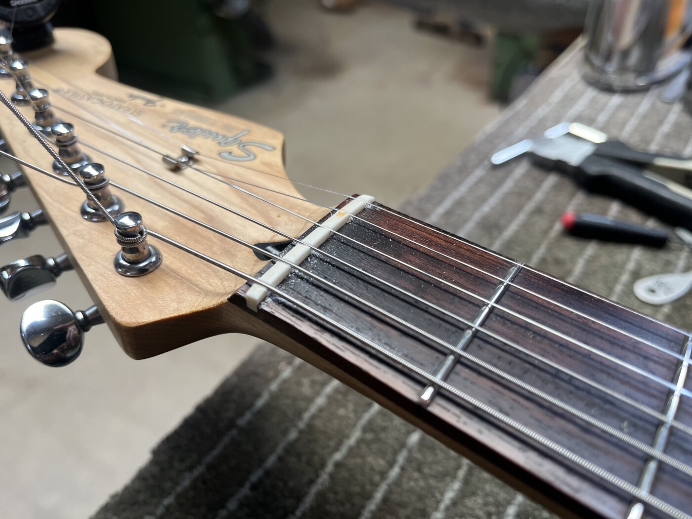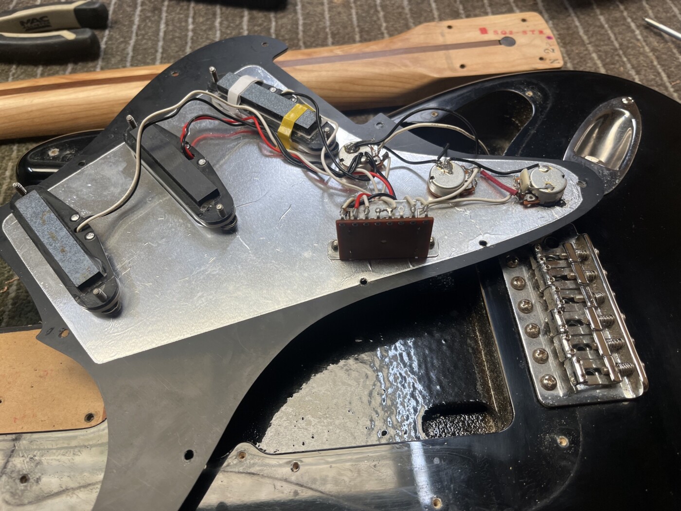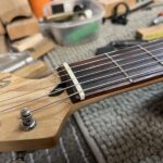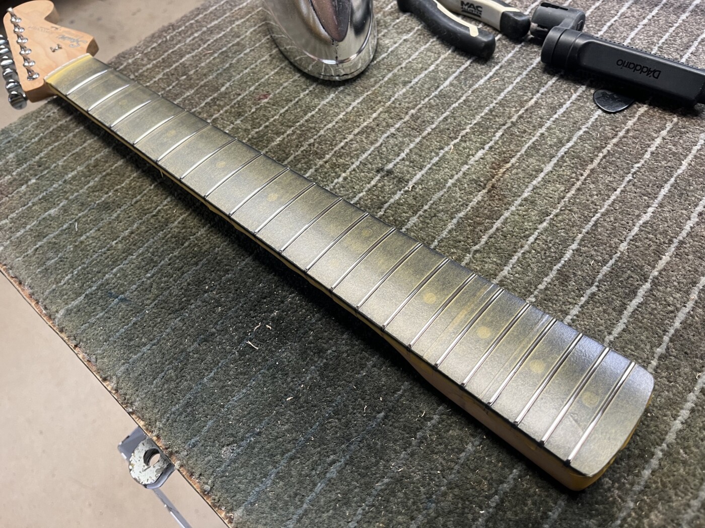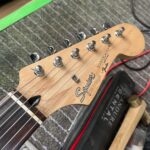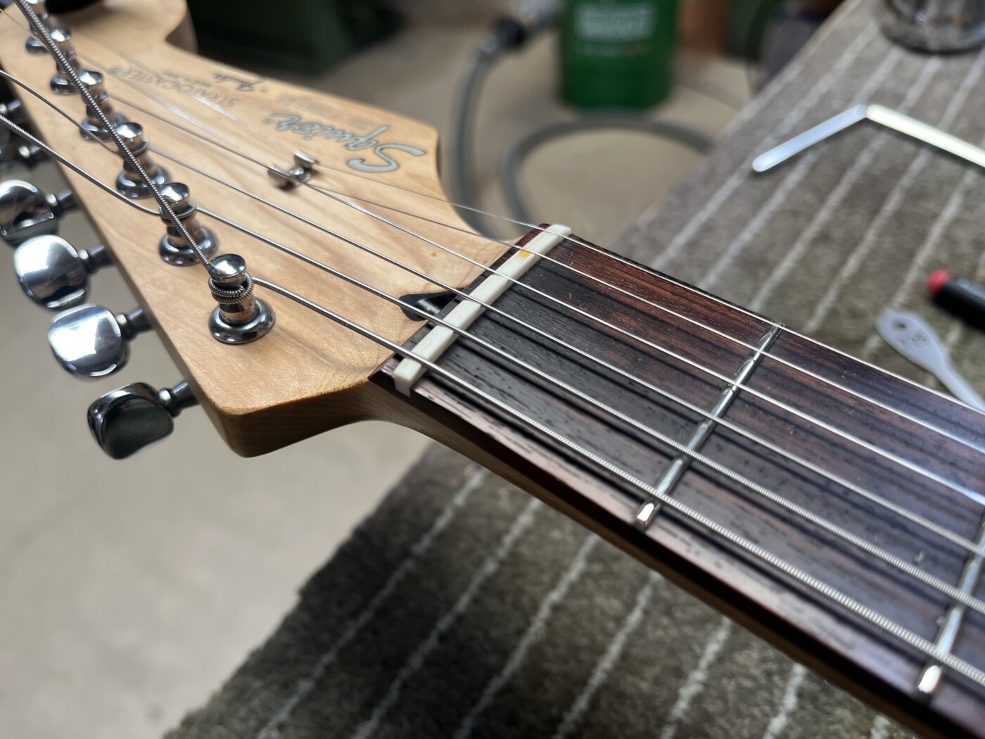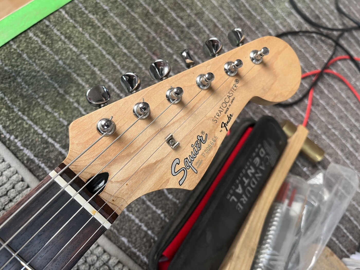 Fairly straight forward setup on this Squier. The treble tone pot was always off when switched in which suggested there was some kind of short circuit. On inspection I was proofed right and one of the lugs was bent over onto the output lug. There wasn’t enough relief in the neck and I loosened the truss rod as much as I could which gave me the tiniest amount, I suspect when the neck was stripped it caused the neck to warp into a back bow. Seems passable but I guess time will tell.