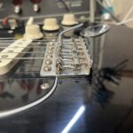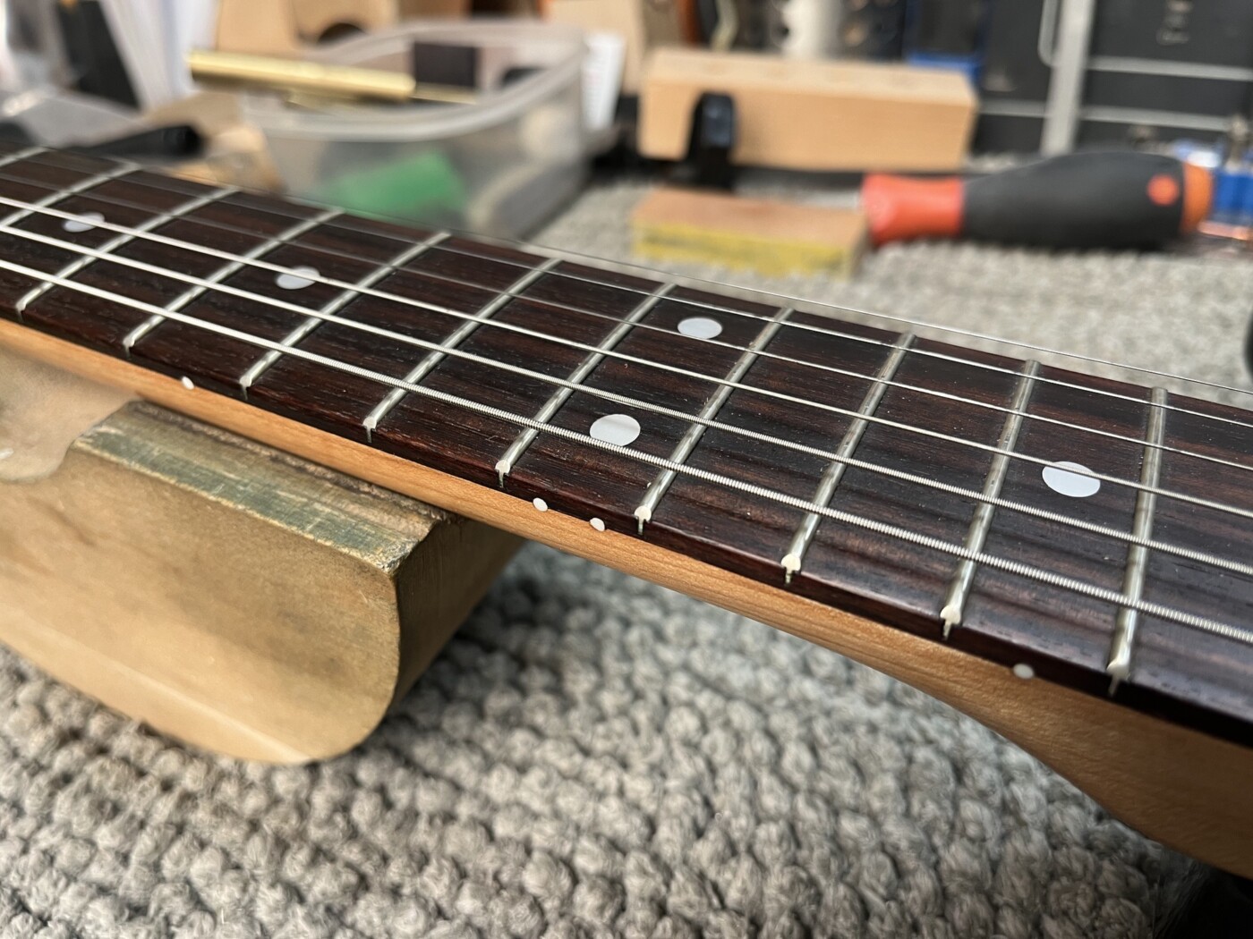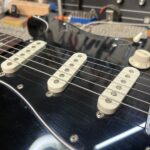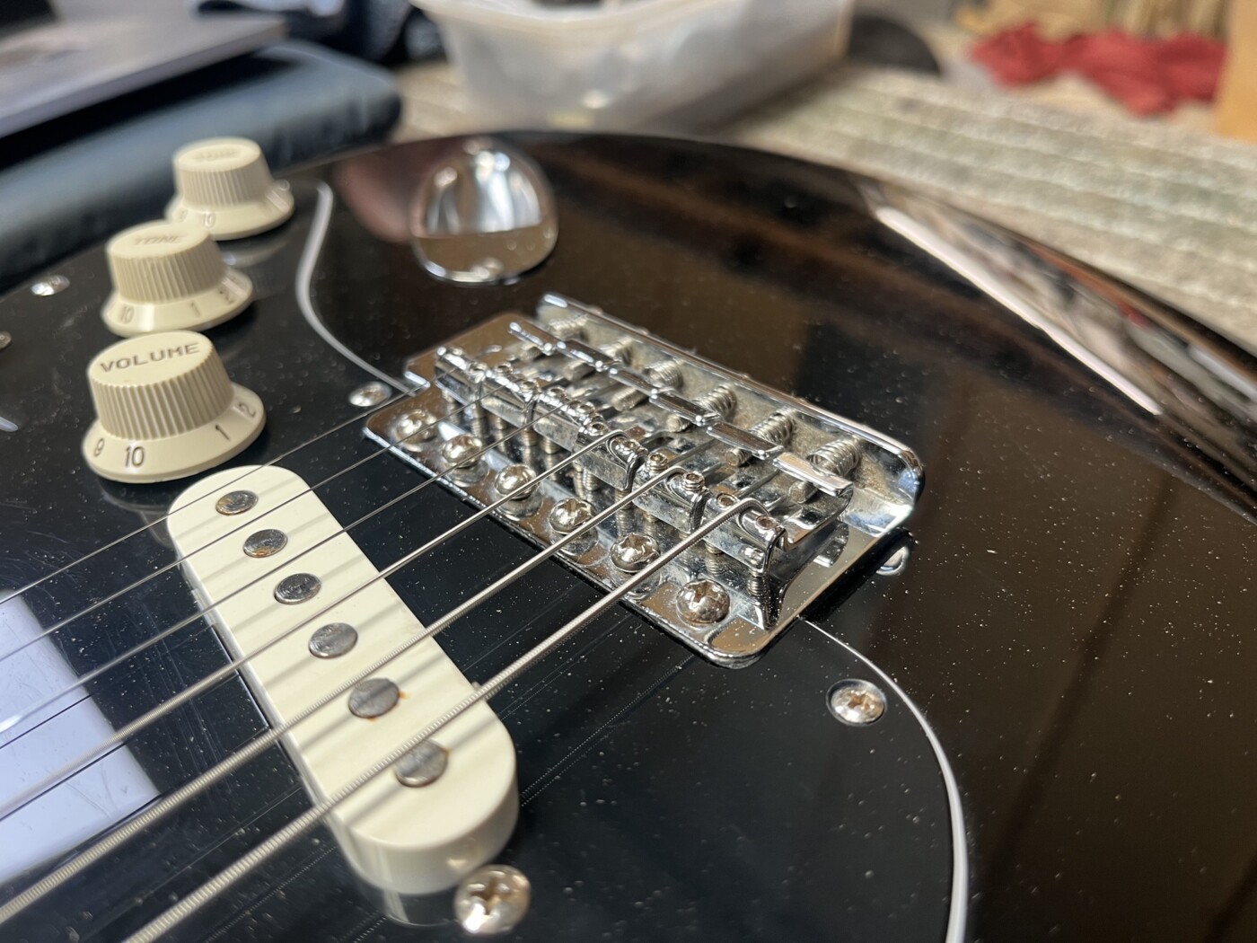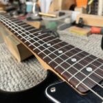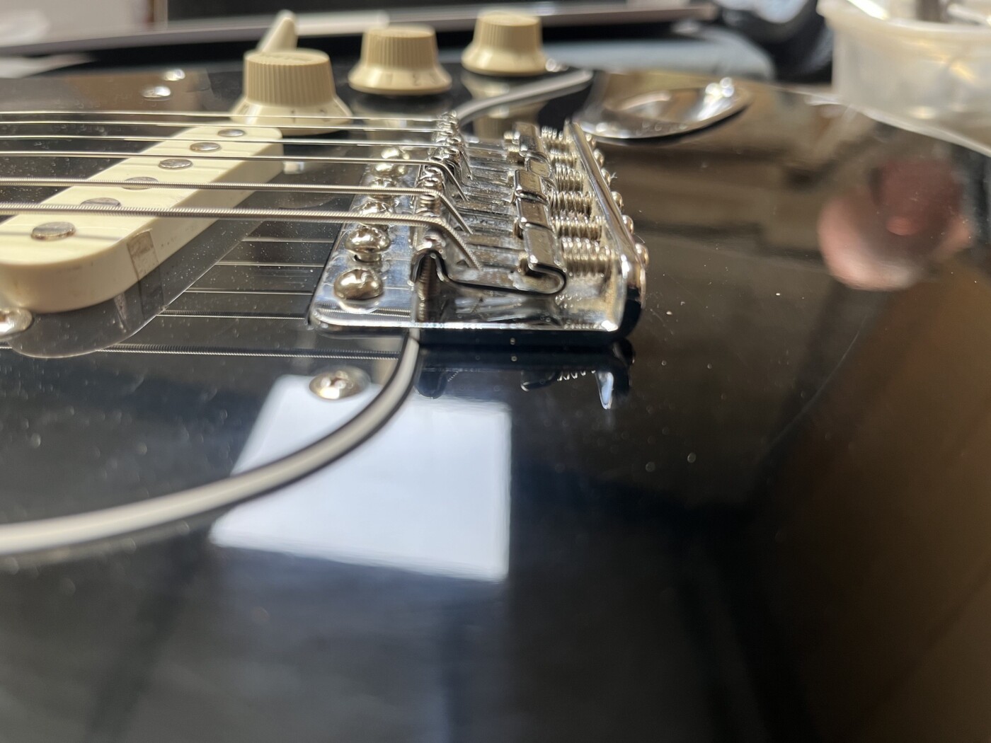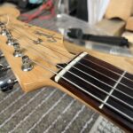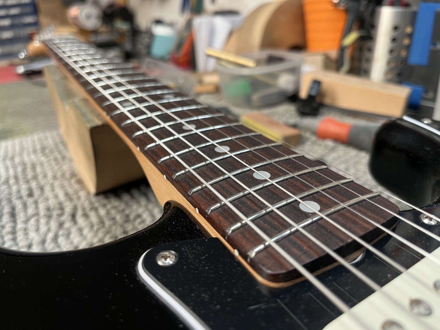 Fairly straight forward setup on this Squier. The treble tone pot was always off when switched in which suggested there was some kind of short circuit. On inspection I was proofed right and one of the lugs was bent over onto the output lug. There wasn’t enough relief in the neck and I loosened the truss rod as much as I could which gave me the tiniest amount, I suspect when the neck was stripped it caused the neck to warp into a back bow. Seems passable but I guess time will tell.