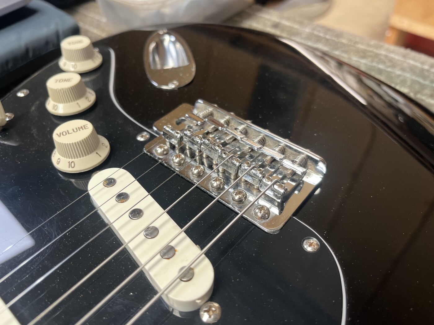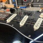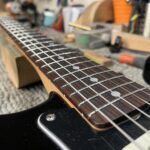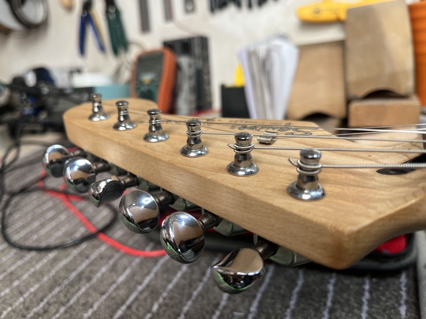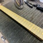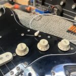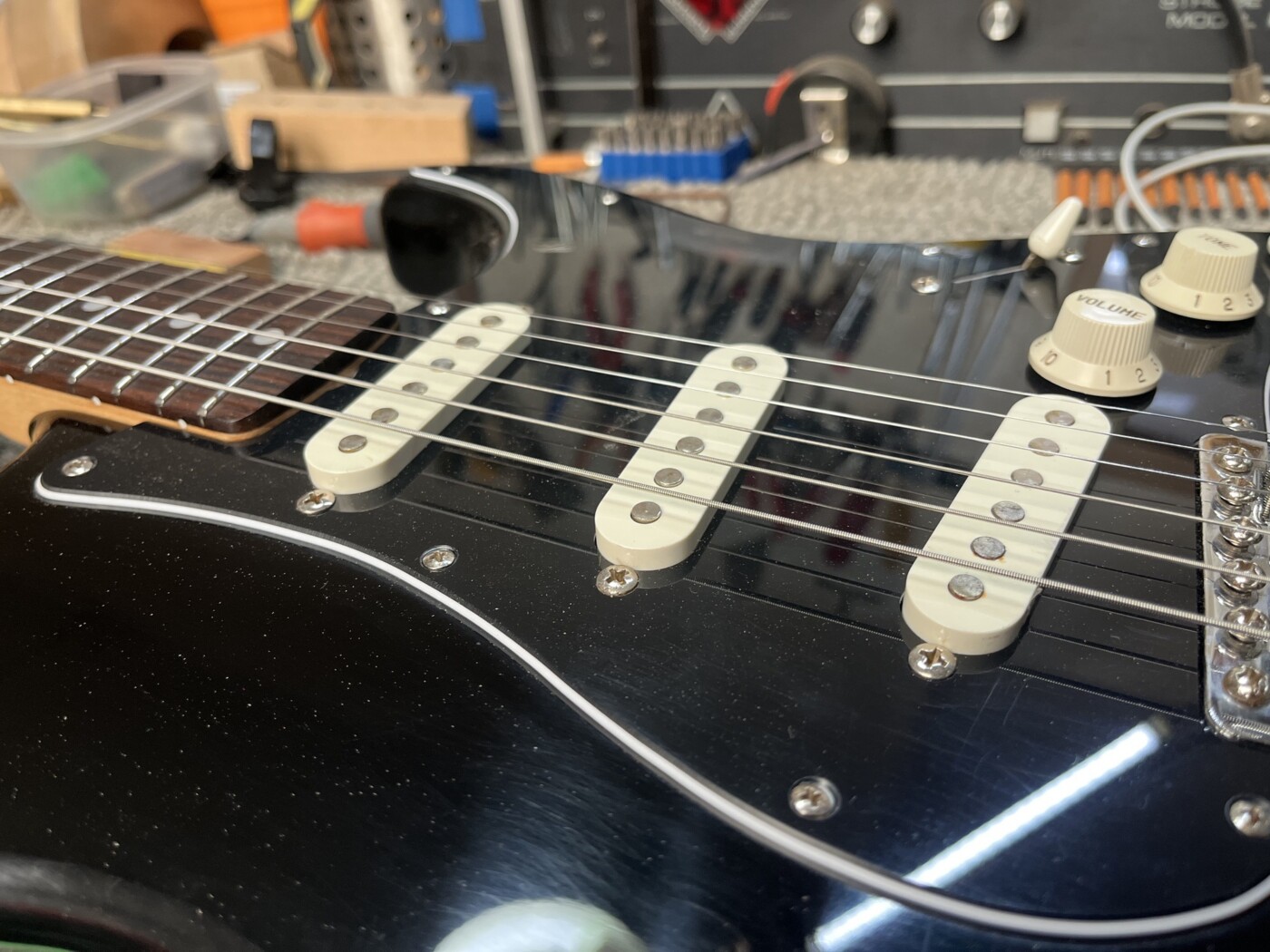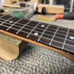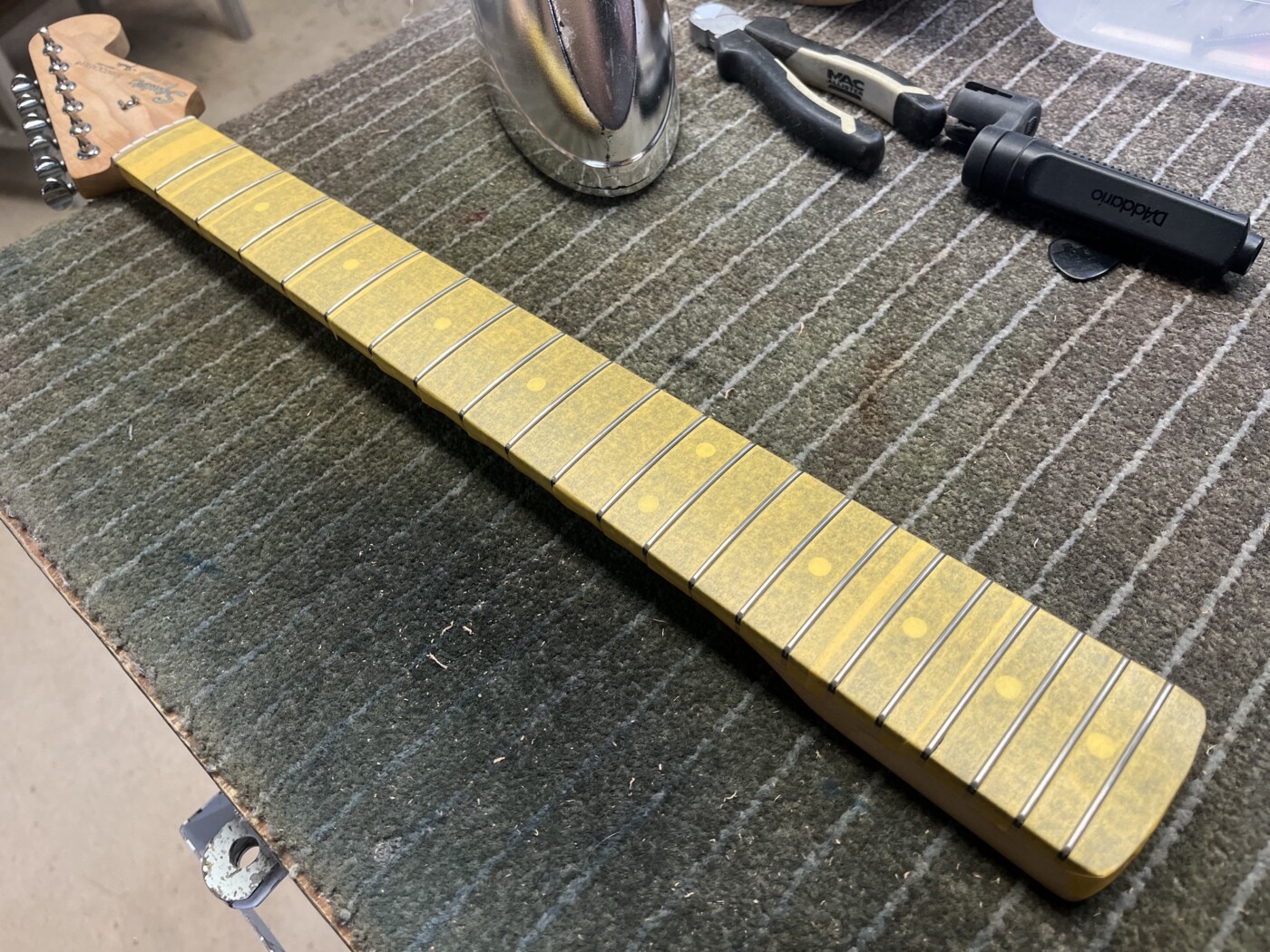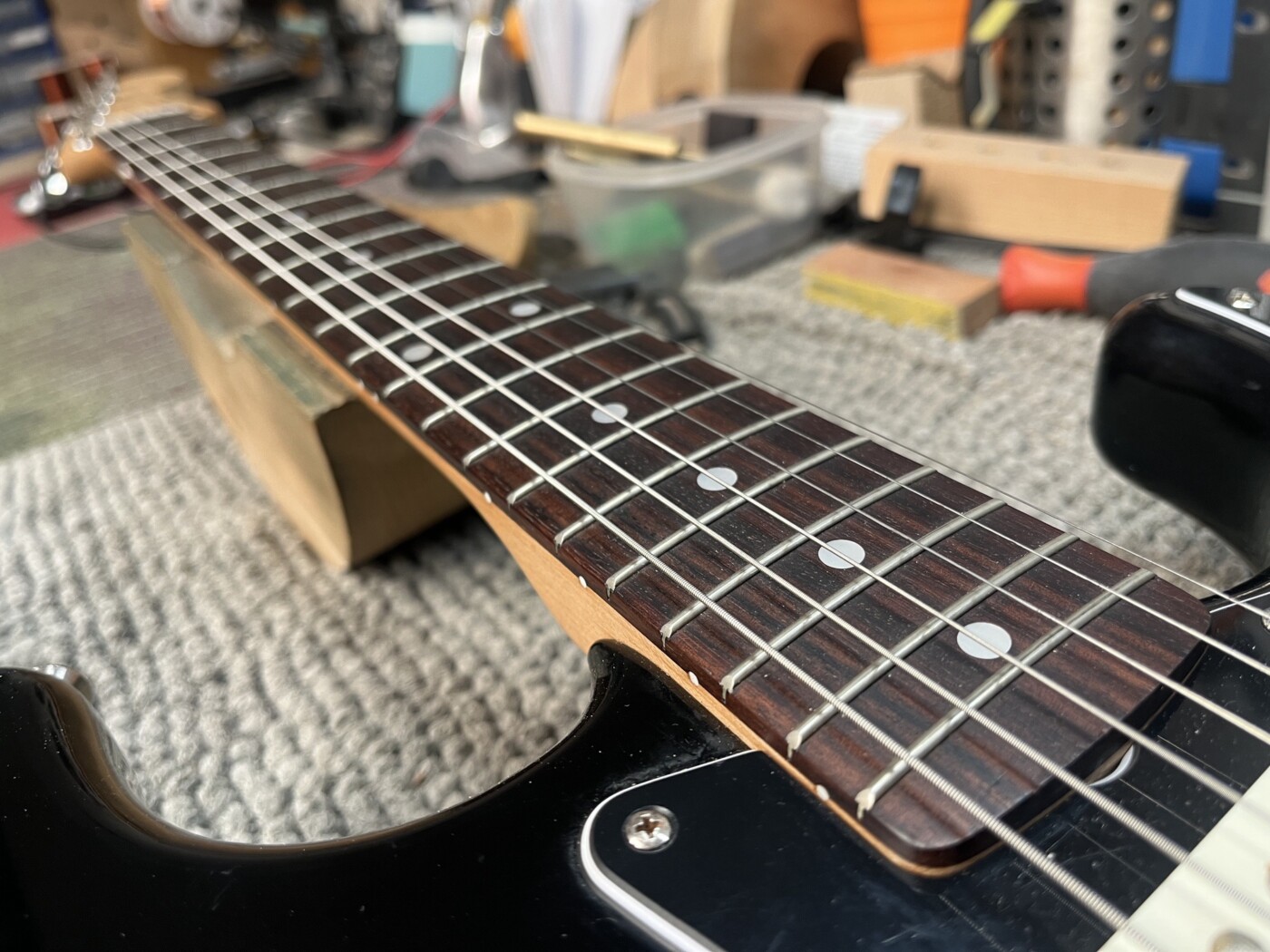 Fairly straight forward setup on this Squier. The treble tone pot was always off when switched in which suggested there was some kind of short circuit. On inspection I was proofed right and one of the lugs was bent over onto the output lug. There wasn’t enough relief in the neck and I loosened the truss rod as much as I could which gave me the tiniest amount, I suspect when the neck was stripped it caused the neck to warp into a back bow. Seems passable but I guess time will tell.