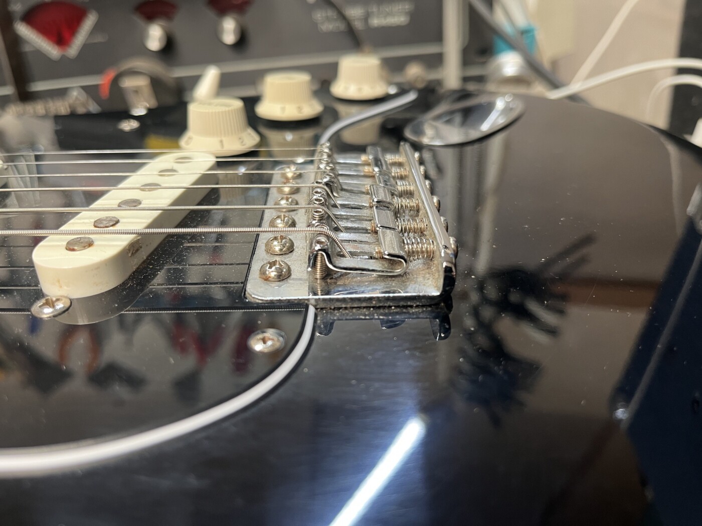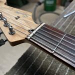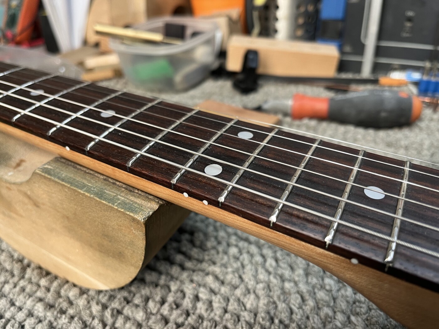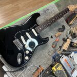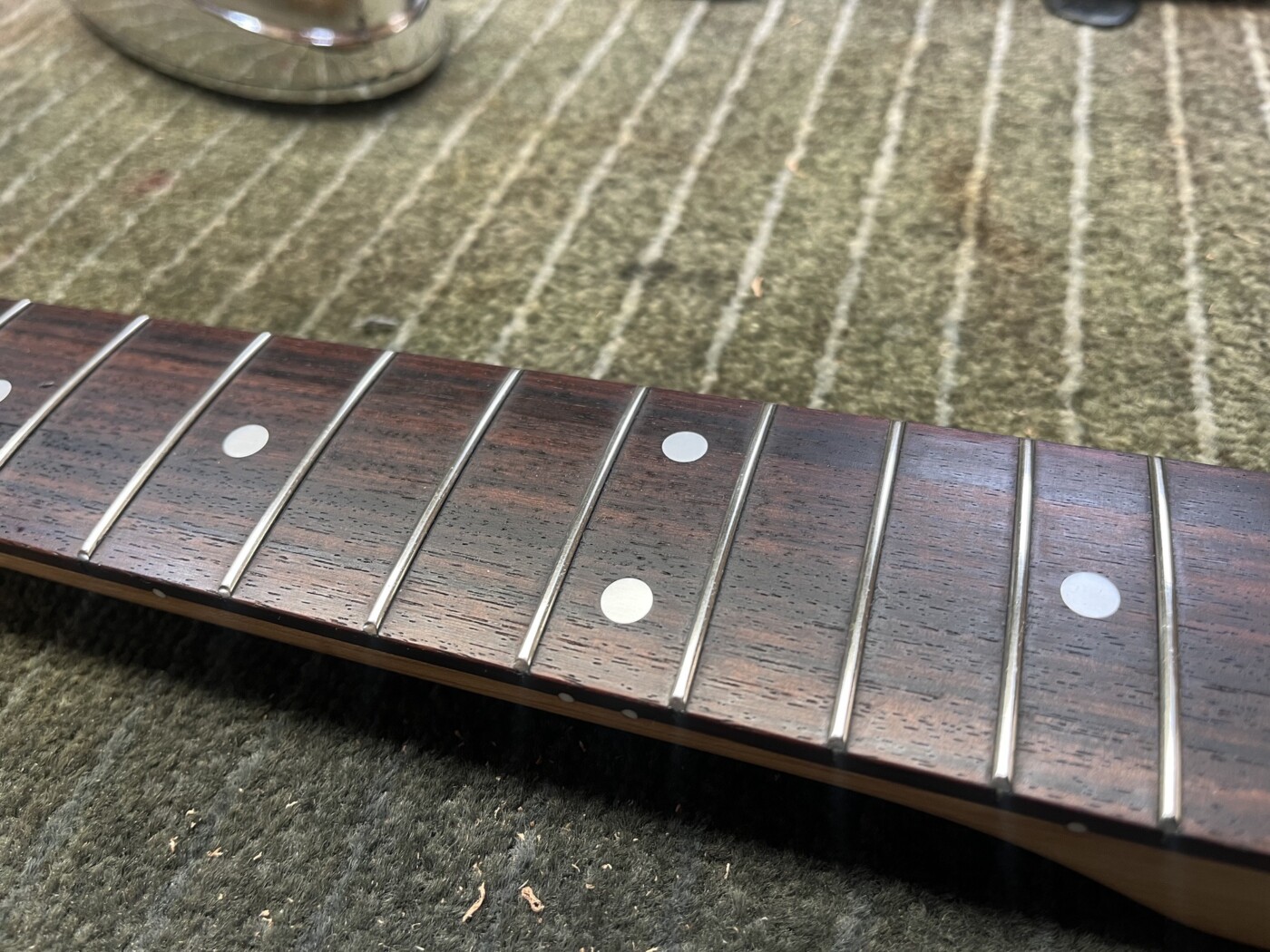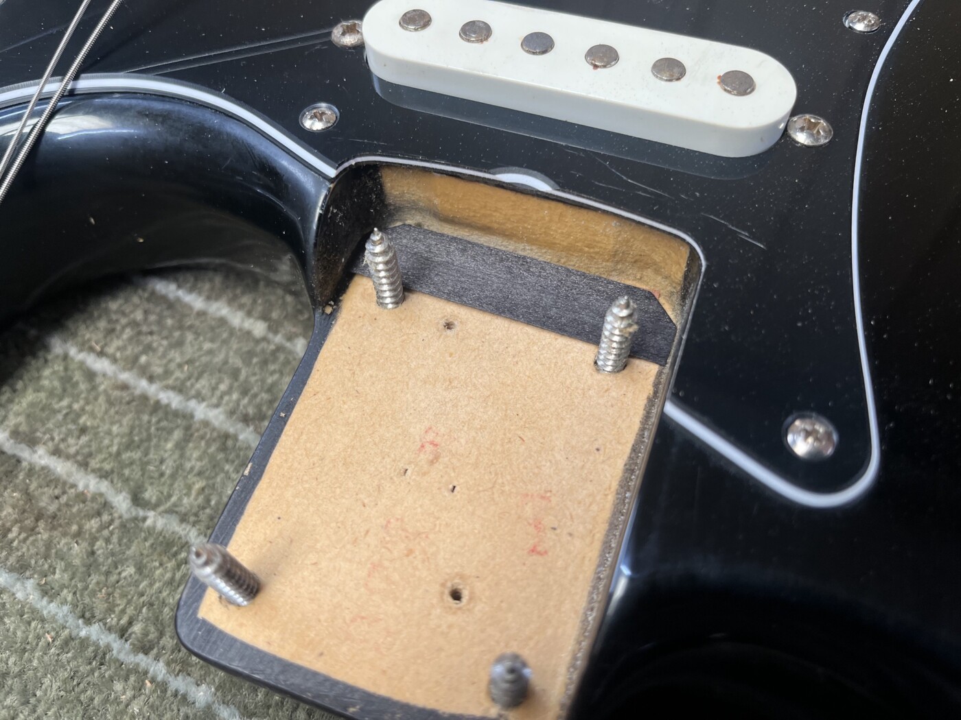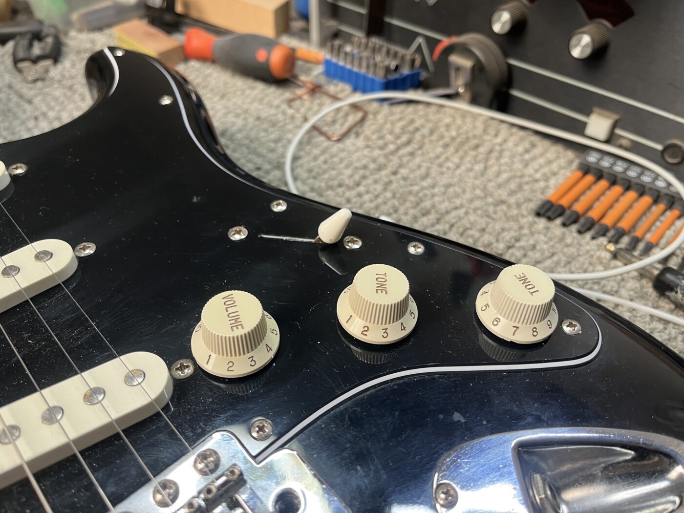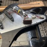 Fairly straight forward setup on this Squier. The treble tone pot was always off when switched in which suggested there was some kind of short circuit. On inspection I was proofed right and one of the lugs was bent over onto the output lug. There wasn’t enough relief in the neck and I loosened the truss rod as much as I could which gave me the tiniest amount, I suspect when the neck was stripped it caused the neck to warp into a back bow. Seems passable but I guess time will tell.