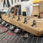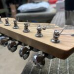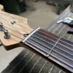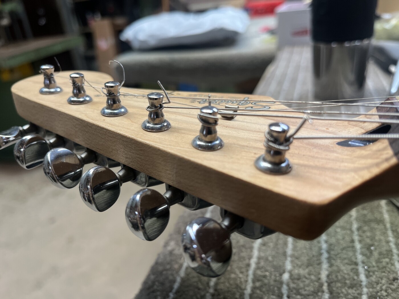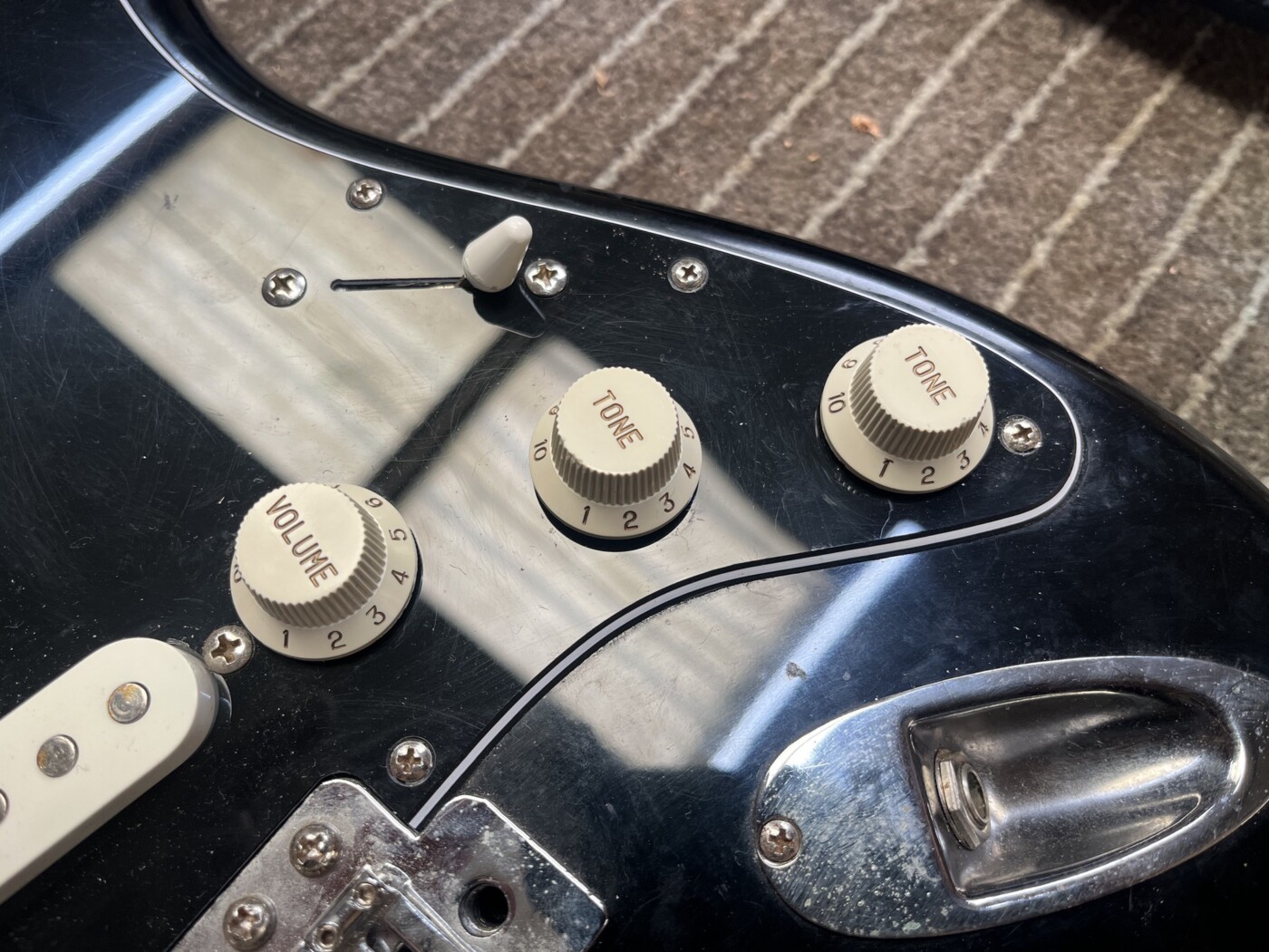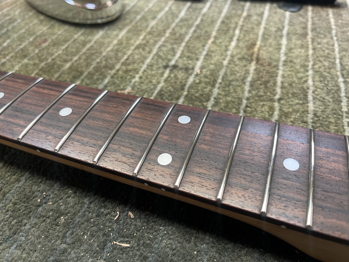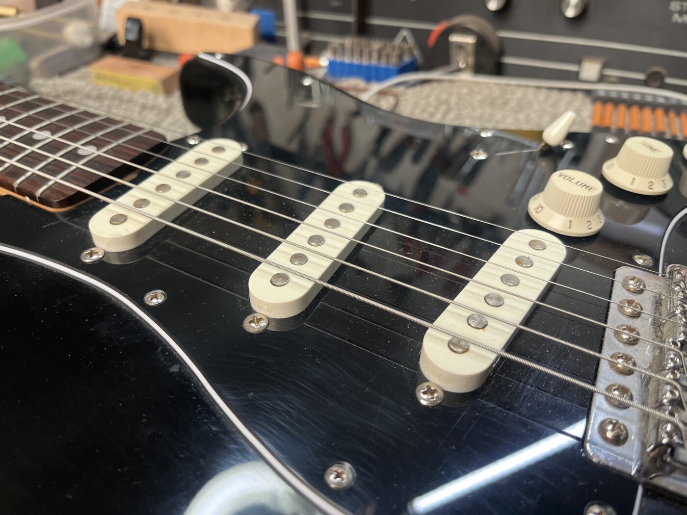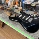 Fairly straight forward setup on this Squier. The treble tone pot was always off when switched in which suggested there was some kind of short circuit. On inspection I was proofed right and one of the lugs was bent over onto the output lug. There wasn’t enough relief in the neck and I loosened the truss rod as much as I could which gave me the tiniest amount, I suspect when the neck was stripped it caused the neck to warp into a back bow. Seems passable but I guess time will tell.