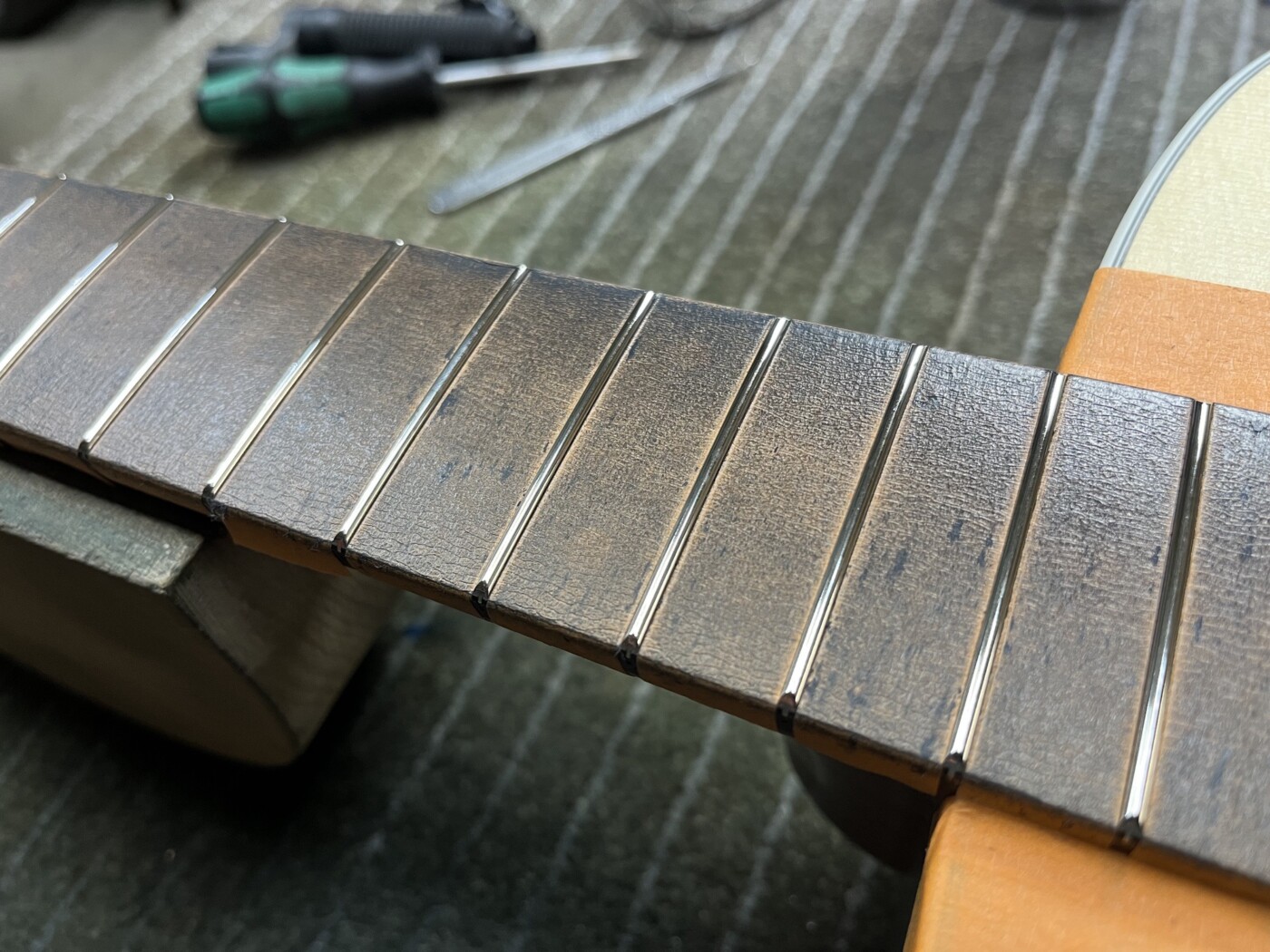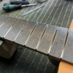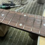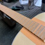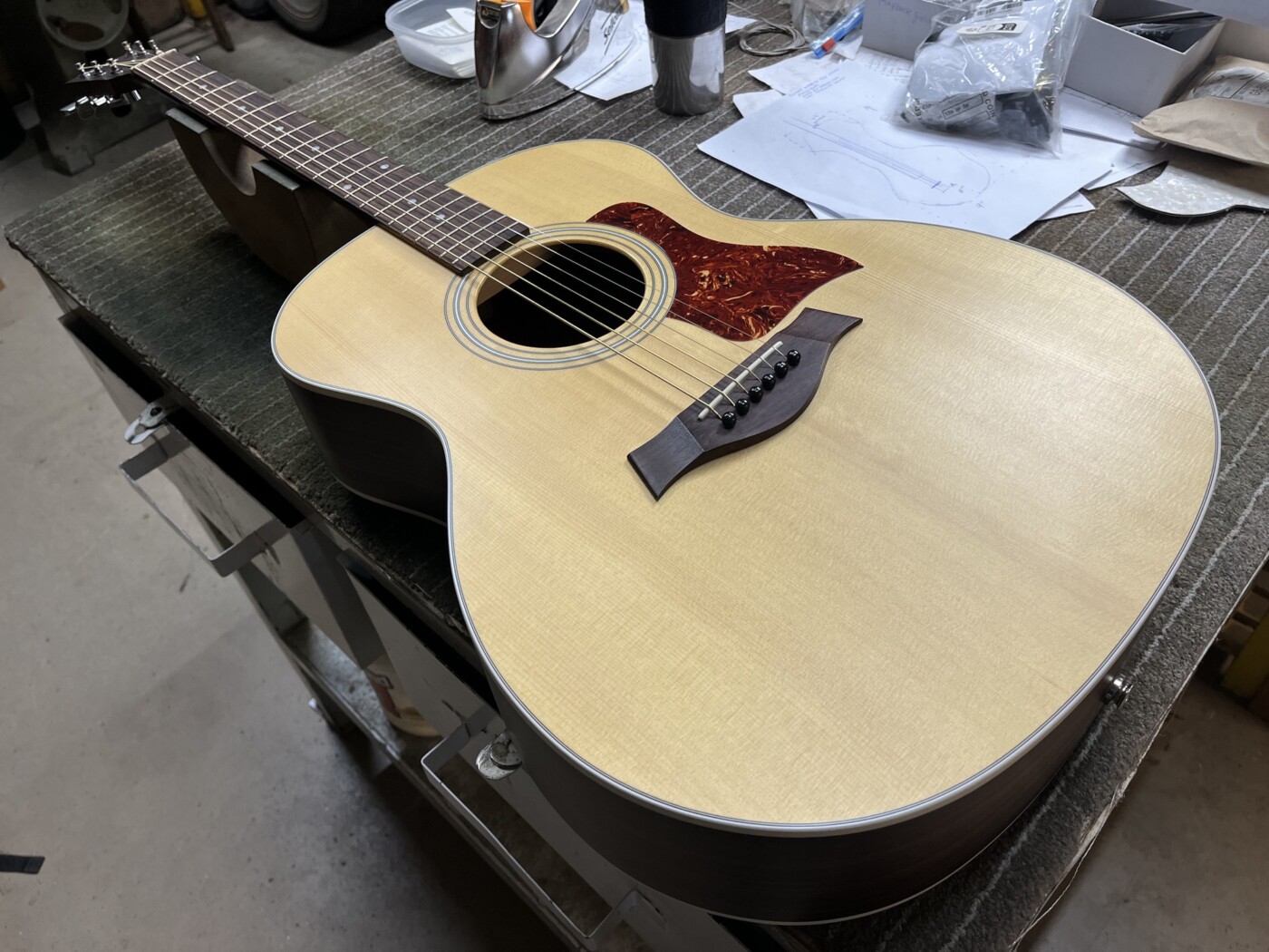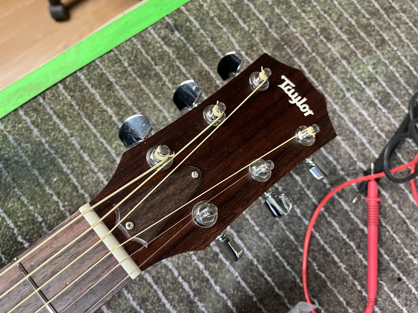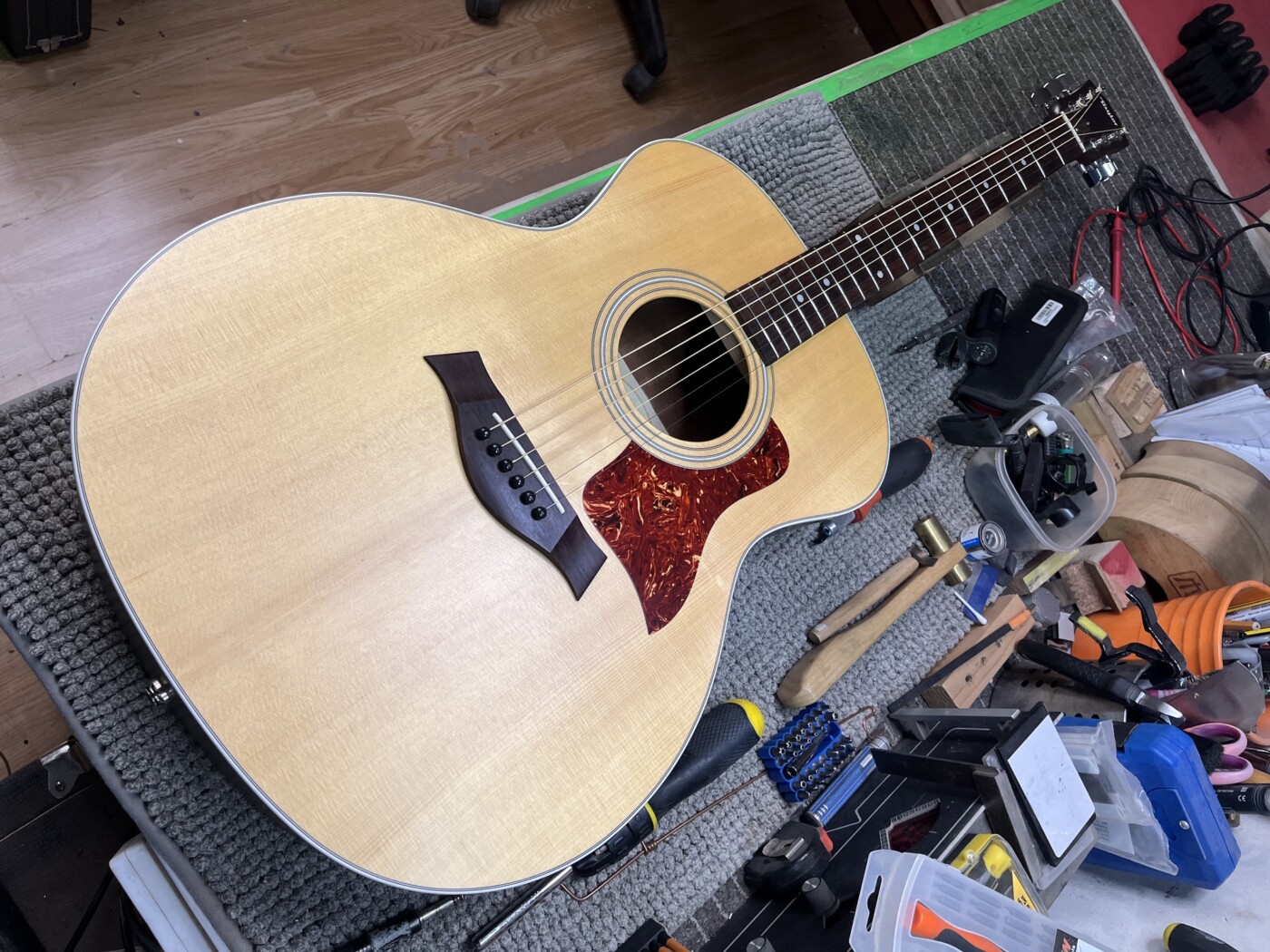 My initial assessment of this guitar was that the neck needed resetting (a straight forward Jon on a Taylor) but the owner was happier for me to do the work in parts, so I did a setup first. The action hasn’t really changed even though the saddle has been lowered, but with more relief that was required it’s not really made a difference. Watch this space…