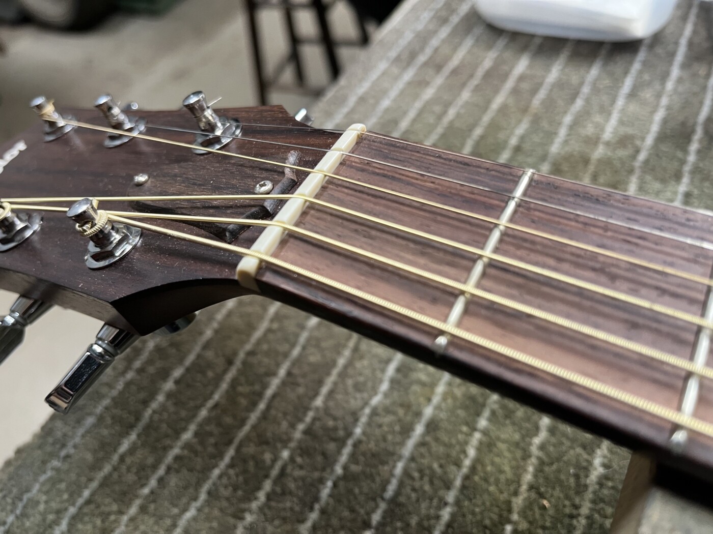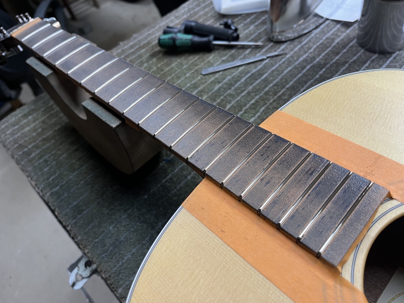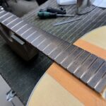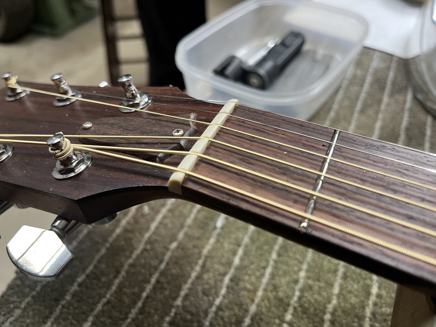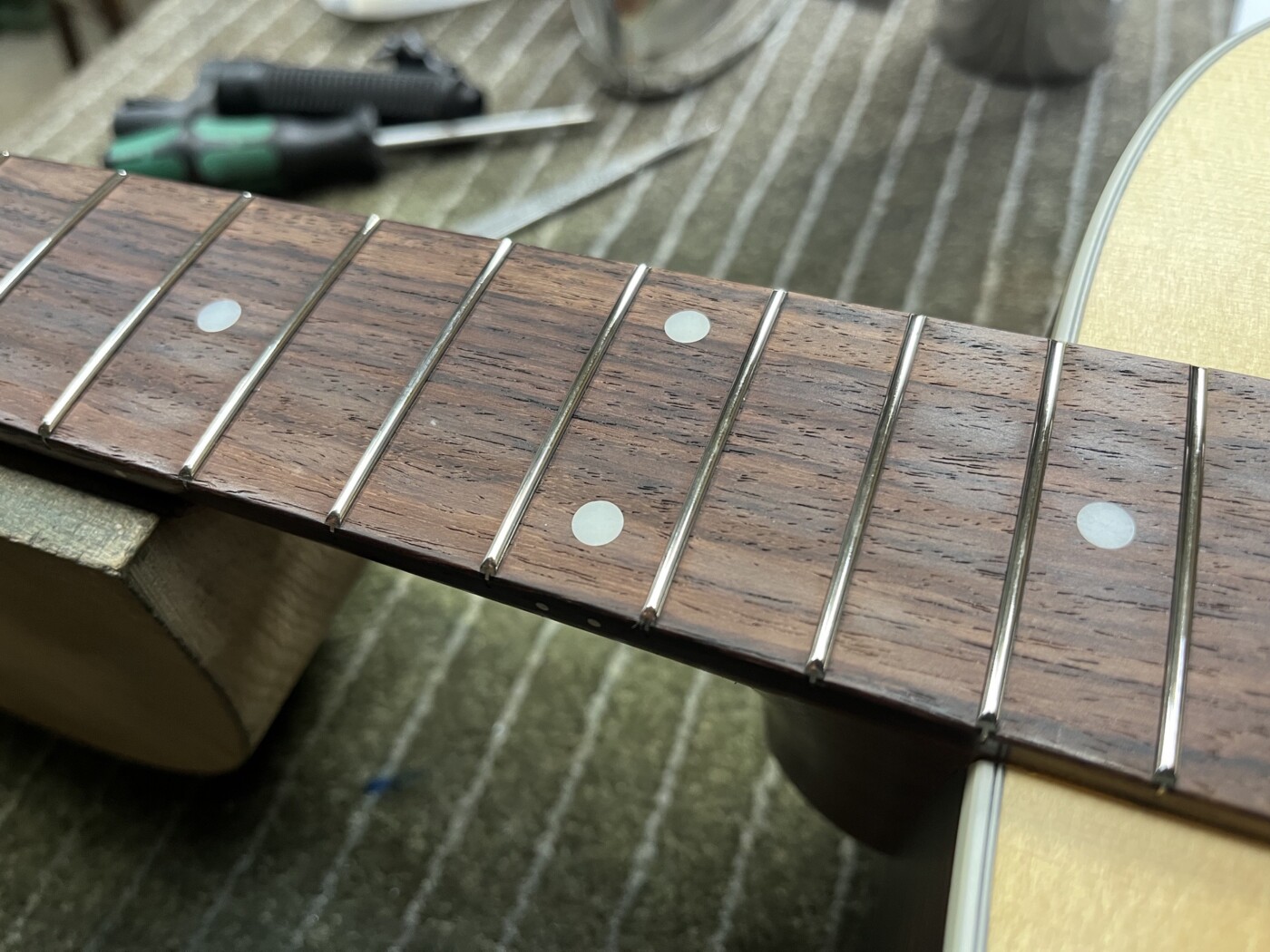 My initial assessment of this guitar was that the neck needed resetting (a straight forward Jon on a Taylor) but the owner was happier for me to do the work in parts, so I did a setup first. The action hasn’t really changed even though the saddle has been lowered, but with more relief that was required it’s not really made a difference. Watch this space…
