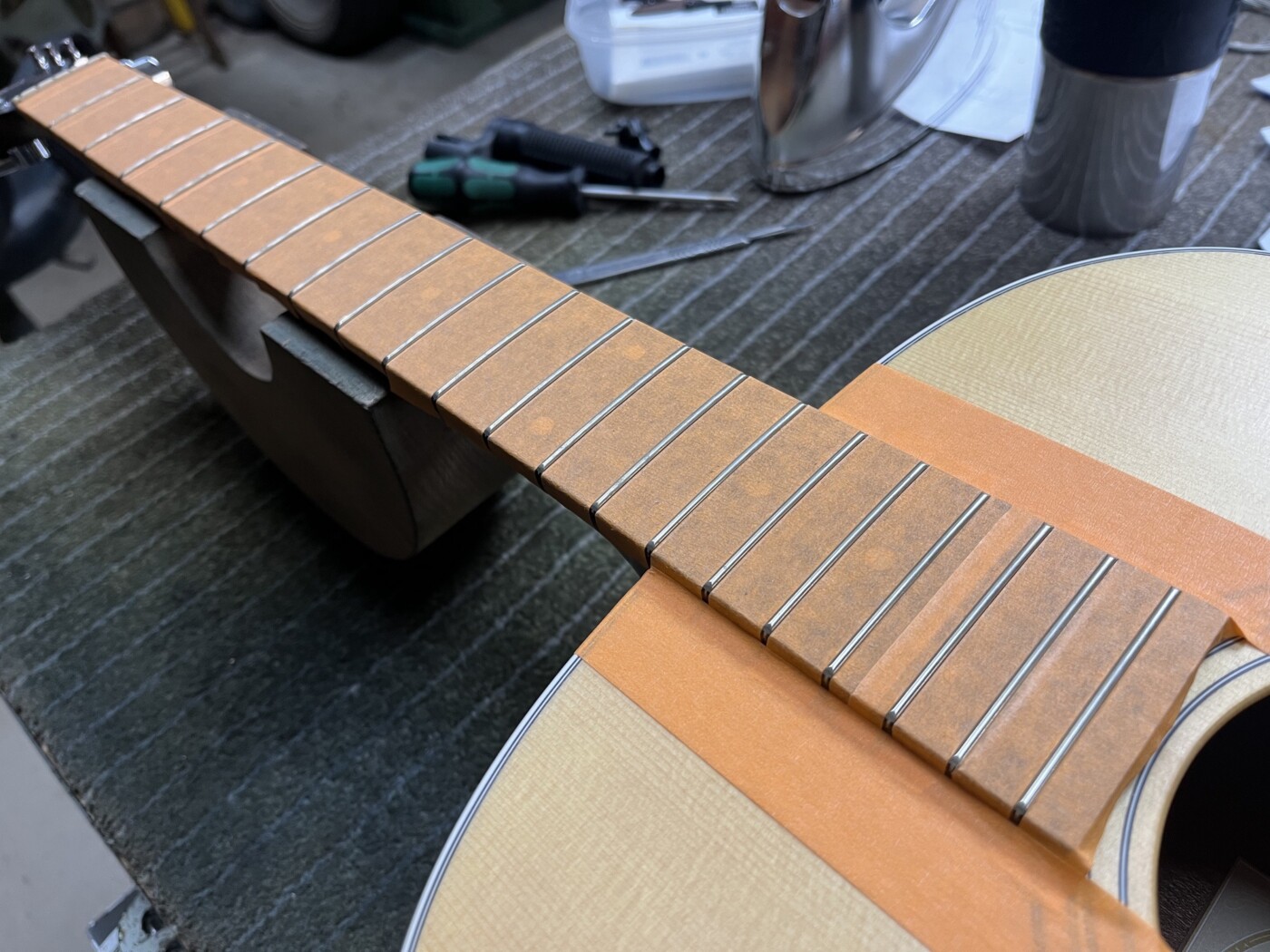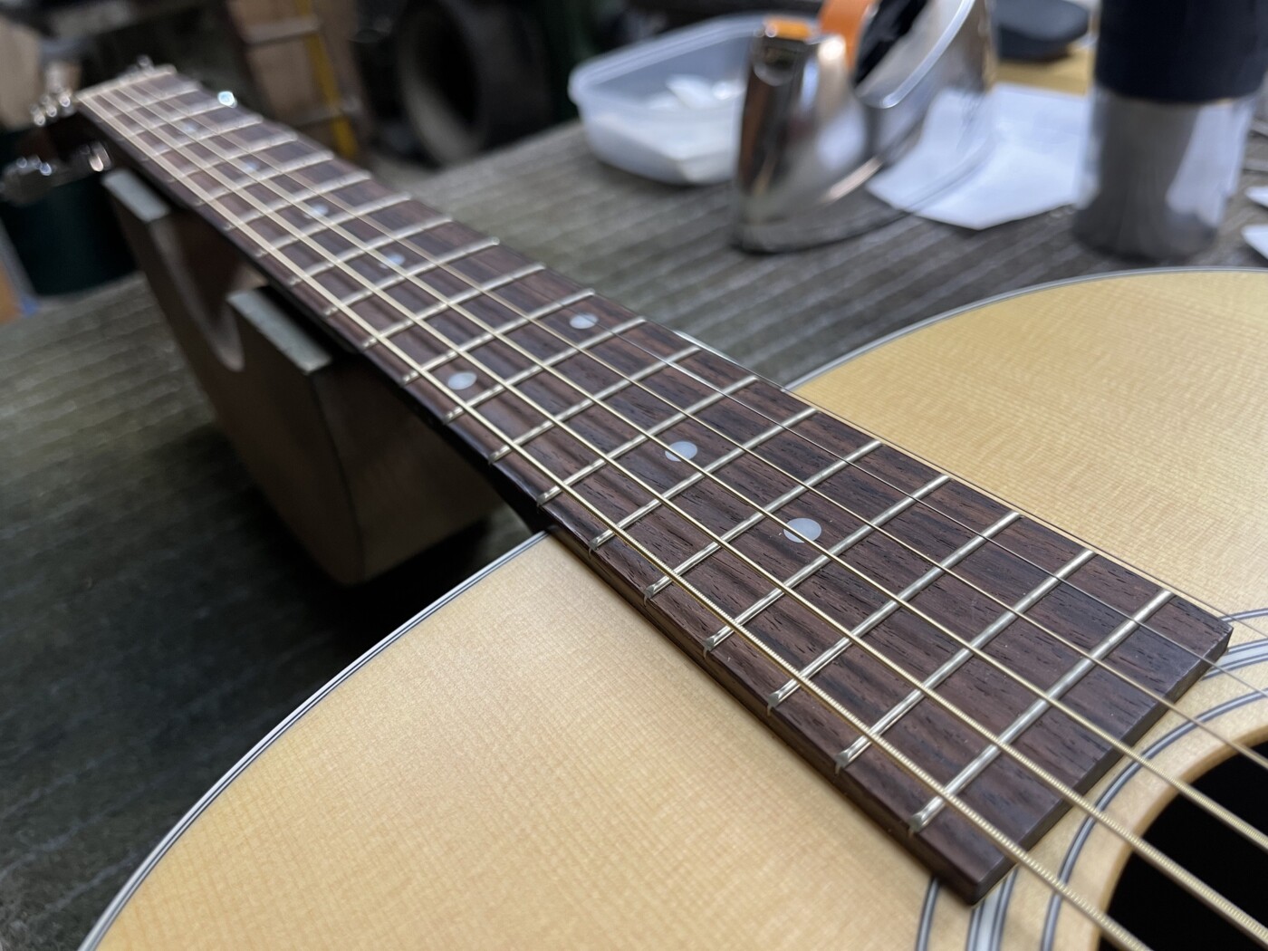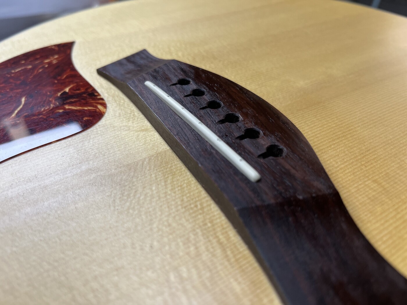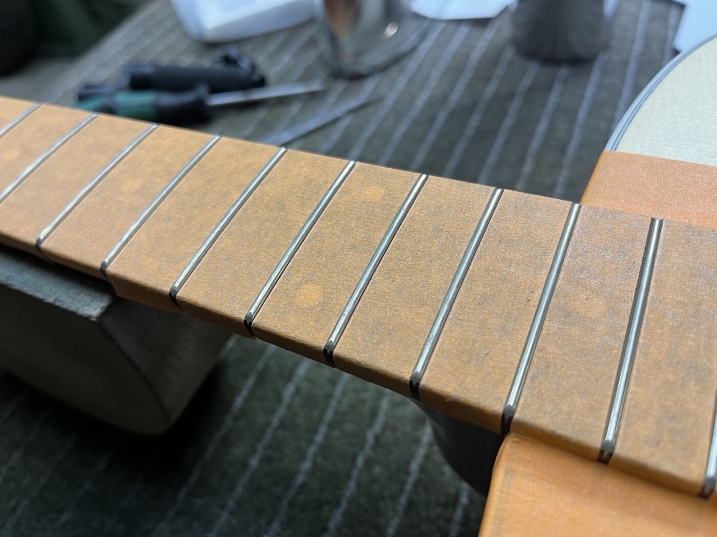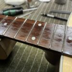 My initial assessment of this guitar was that the neck needed resetting (a straight forward Jon on a Taylor) but the owner was happier for me to do the work in parts, so I did a setup first. The action hasn’t really changed even though the saddle has been lowered, but with more relief that was required it’s not really made a difference. Watch this space…